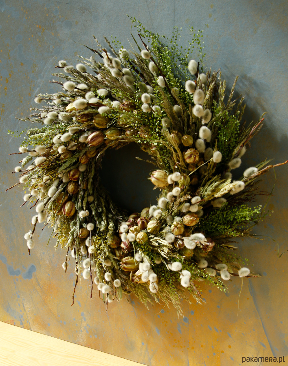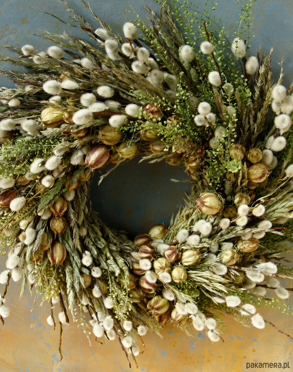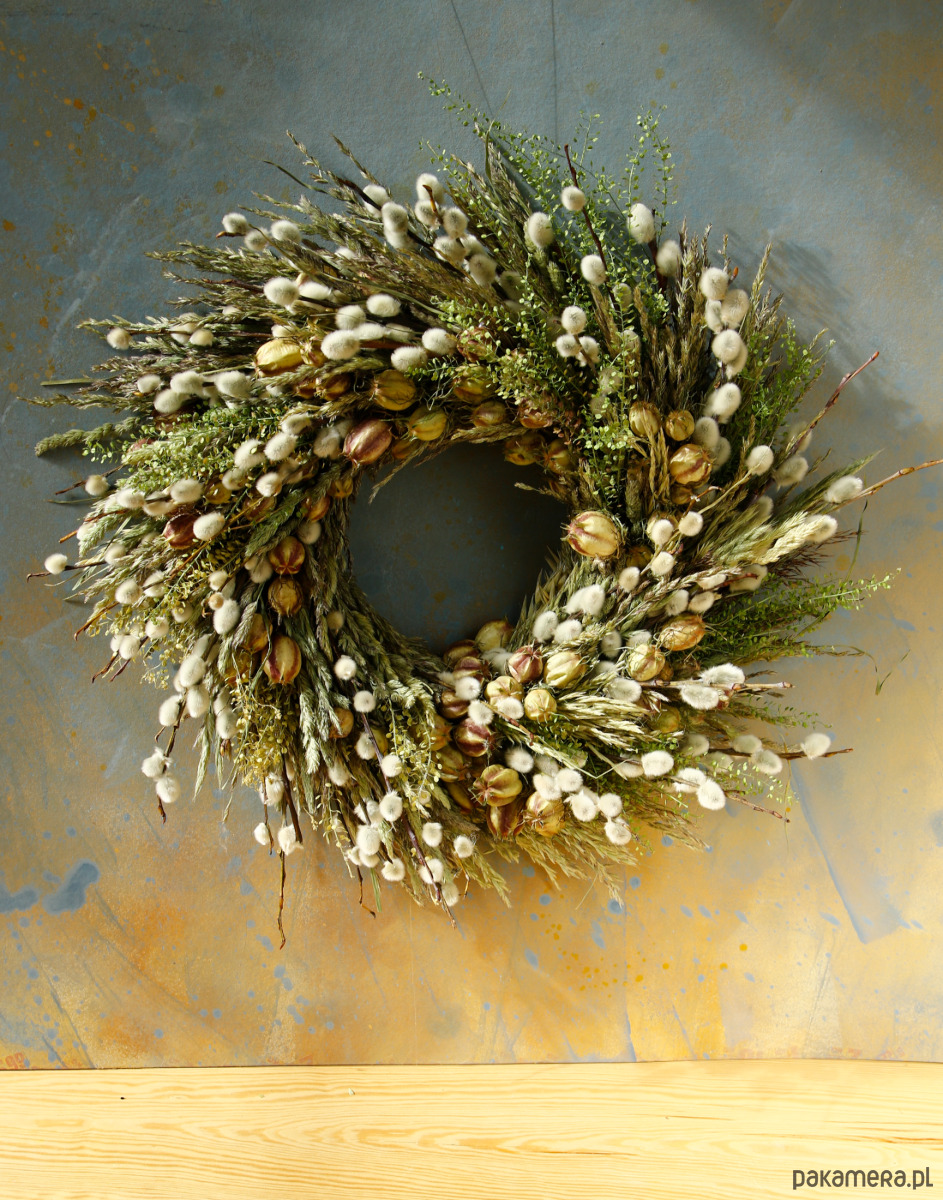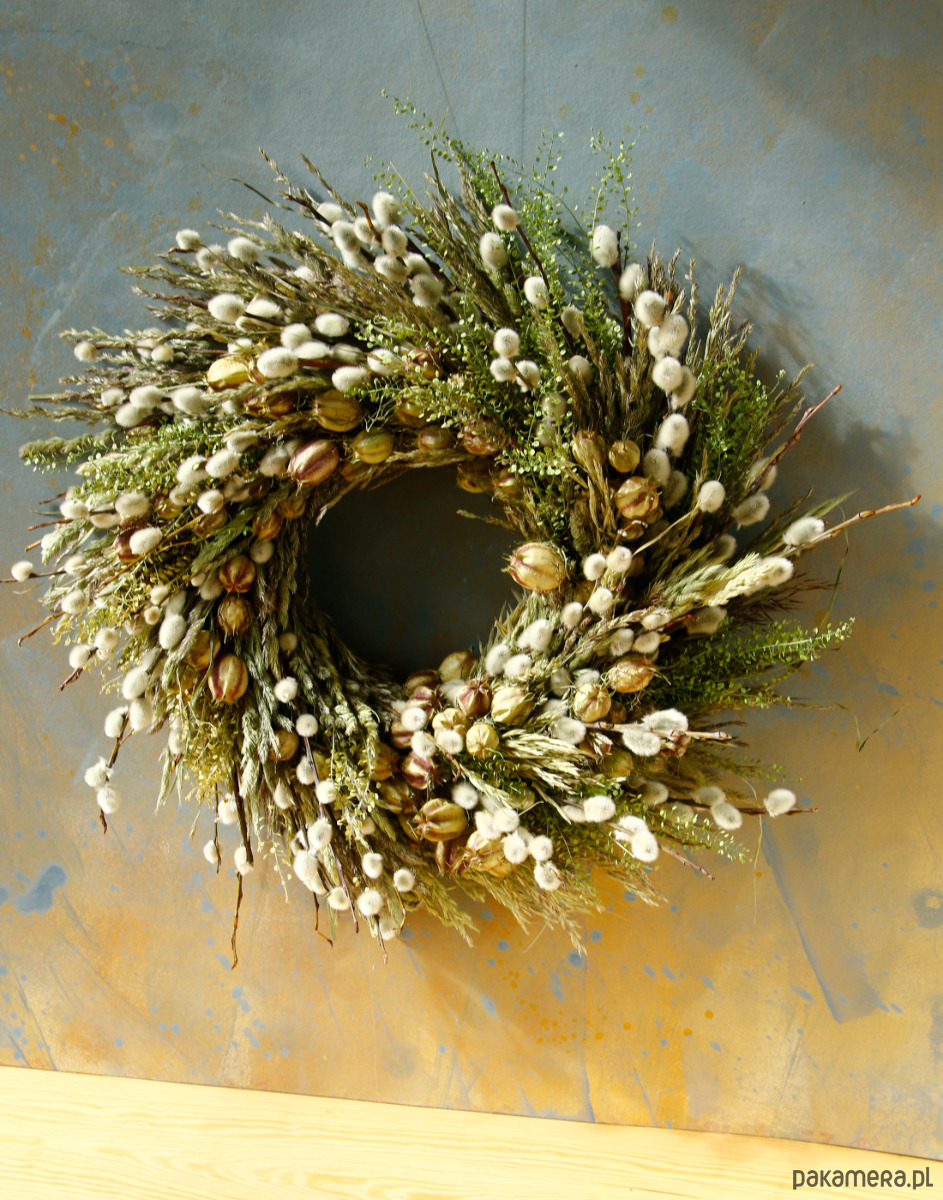 Jest to trwała dekoracja, bazie naturalnie się zasuszają, więc wianek będzie ozdobą na długi czas.