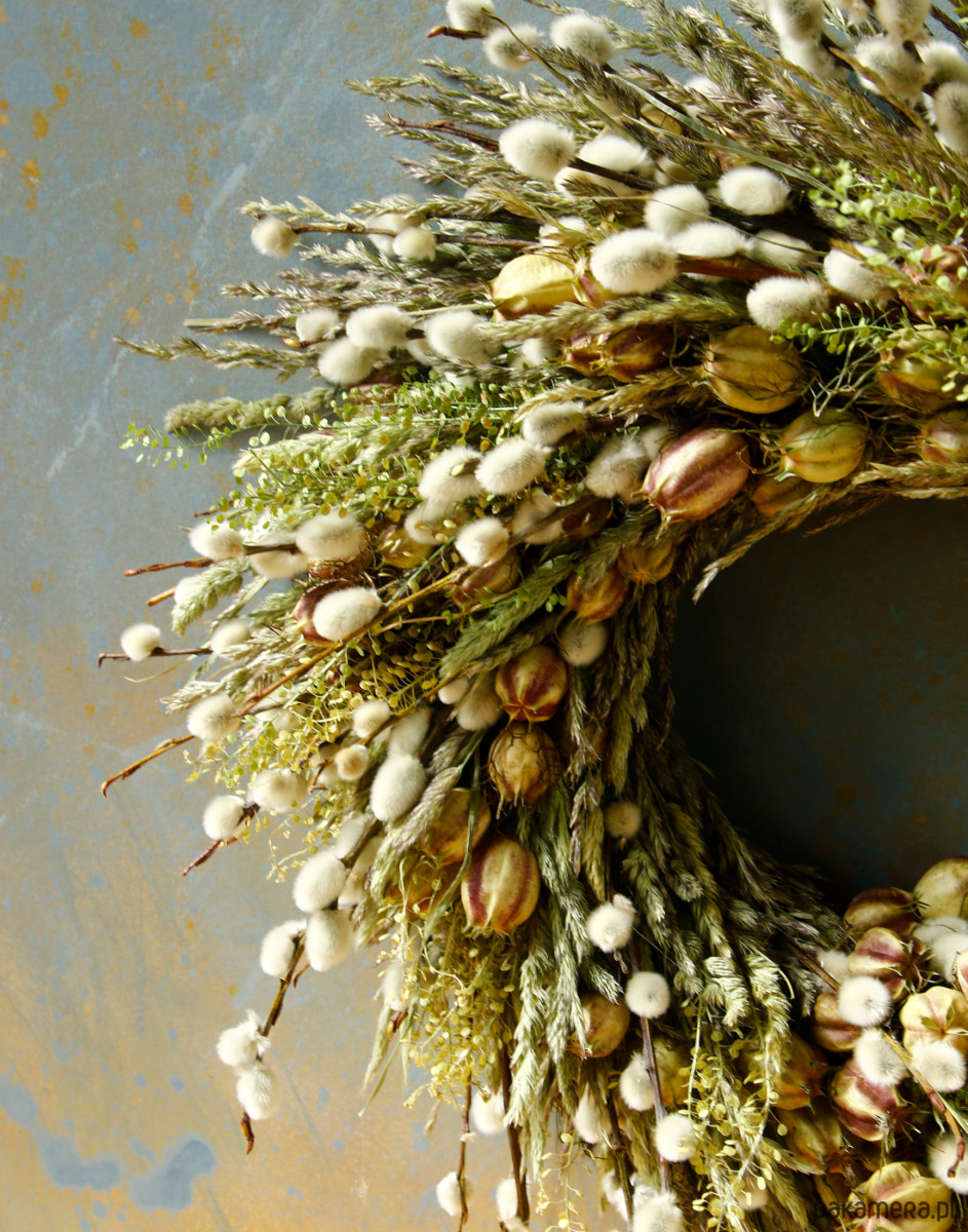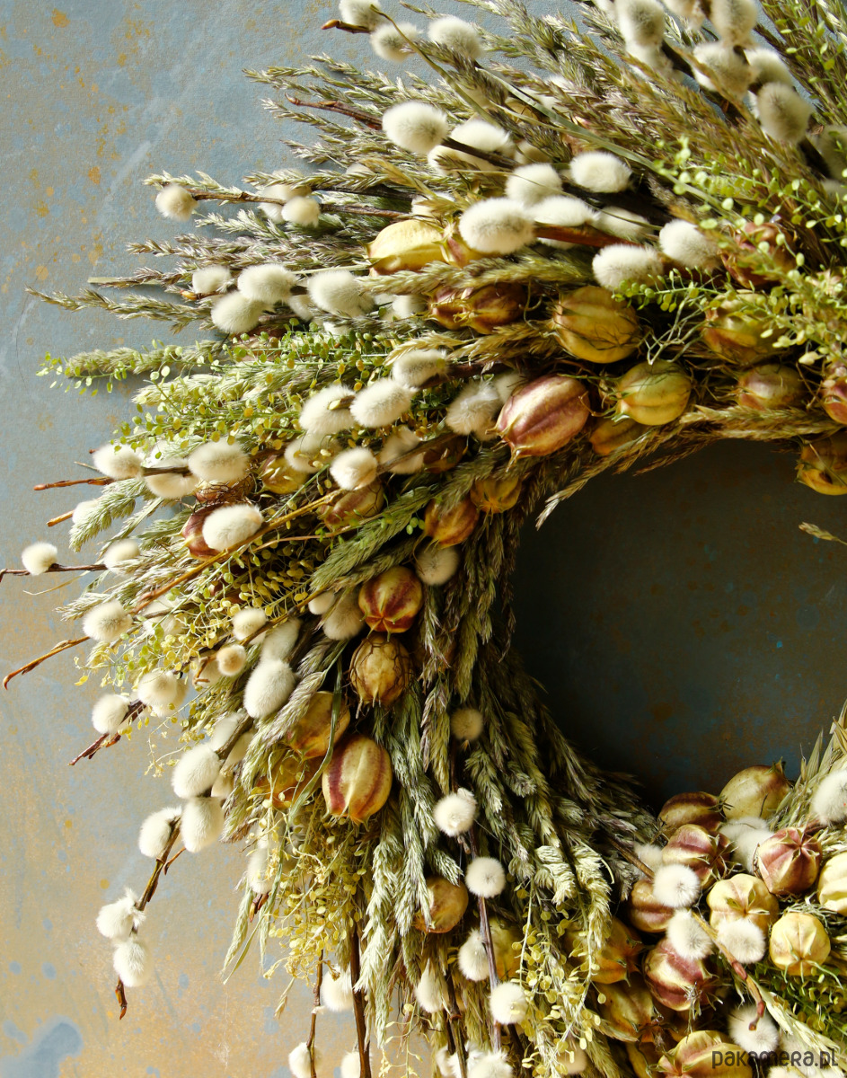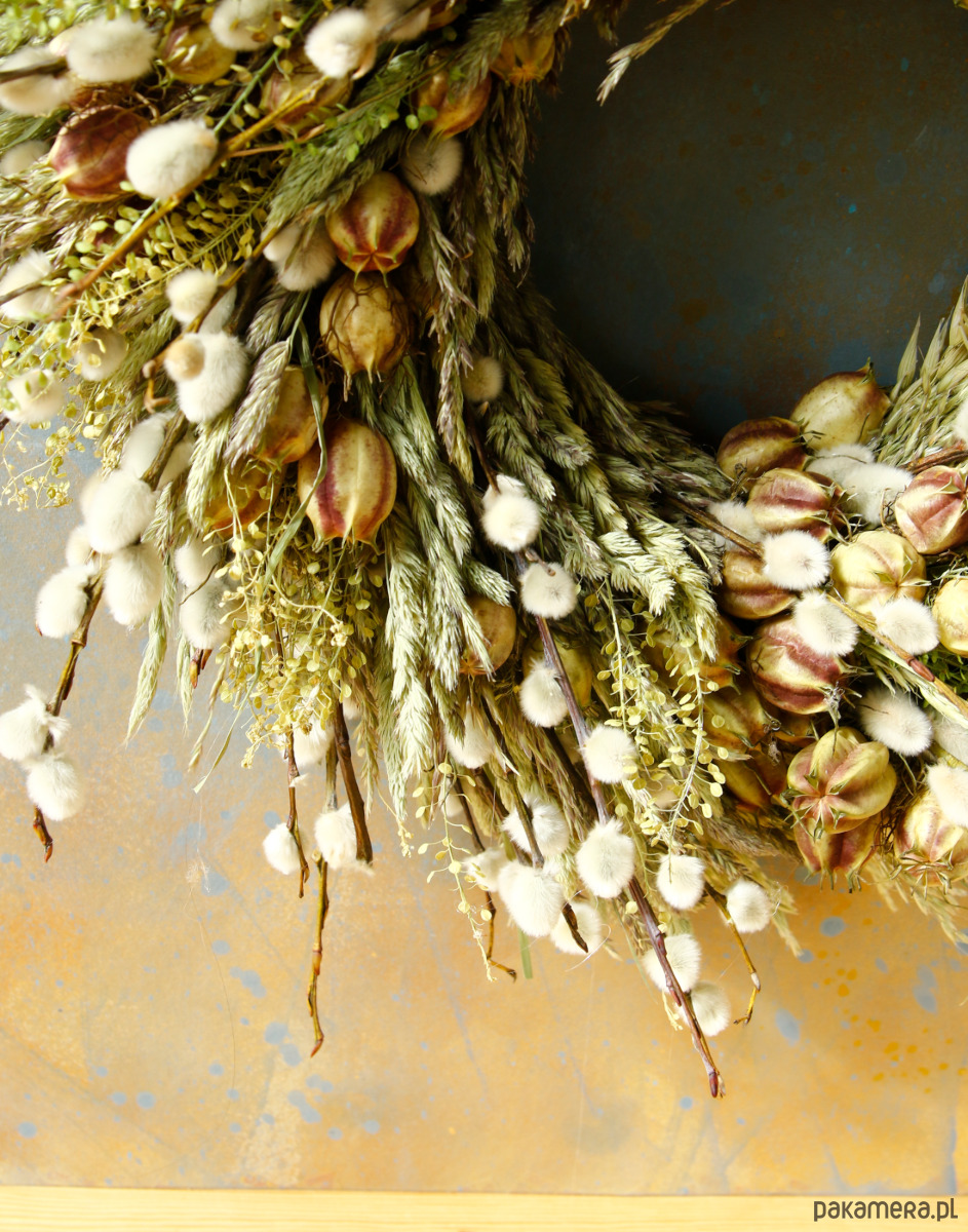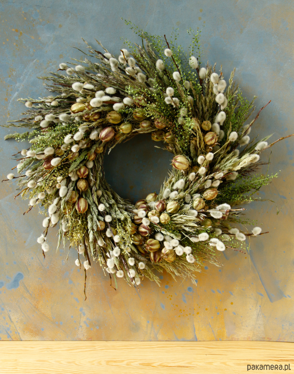 Jest to trwała dekoracja, bazie naturalnie się zasuszają, więc wianek będzie ozdobą na długi czas.
