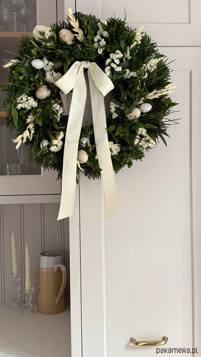 Żywe gałązki, jodła, bukszpan, sztuczne jajeczka, wstążka są idealną dekoracją na już i na święta.