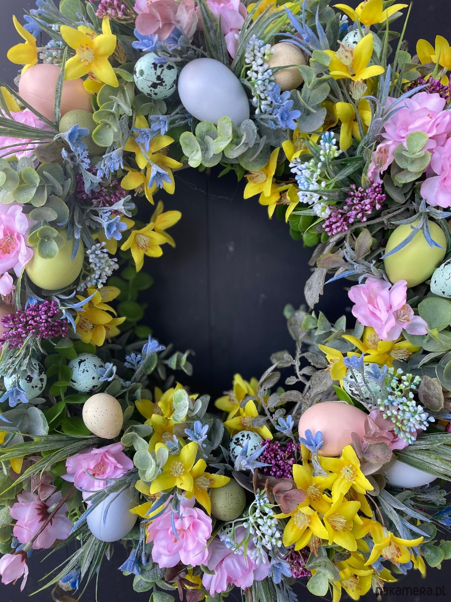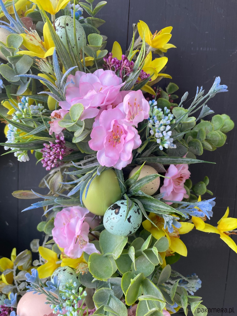 Piękny wiosenno-wielkanocny wianek wykonany w całości ze sztucznych elementów na podstawie z rattanu. Wysokiej jakości kwiaty sprawiają, że cała kompozycja wygląda bardzo naturalnie. Dominujące kolory to niebieski, różowy i żółty. Wianek będzie świetnym uzupełnieniem wielkanocnych dekoracji , będzie świetnie służył jako wiosenno-letnia ozdoba drzwi, kominka czy ściany. Średnica ok 45-47 cm.
