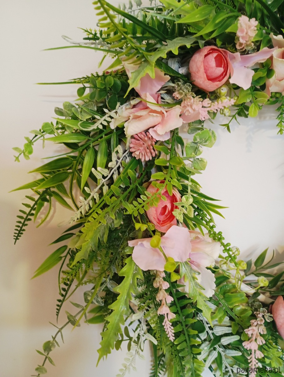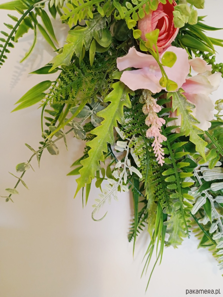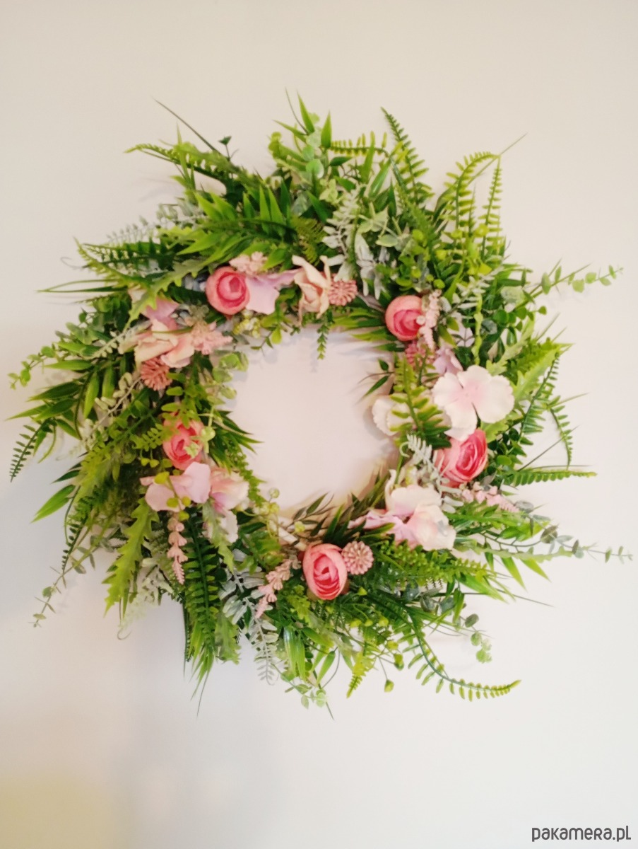Bardzo efektowny bogaty wianek ze sztucznych roślin bardzo przypominających prawdziwe. Wykonany na wiklinowym podkładzie.
