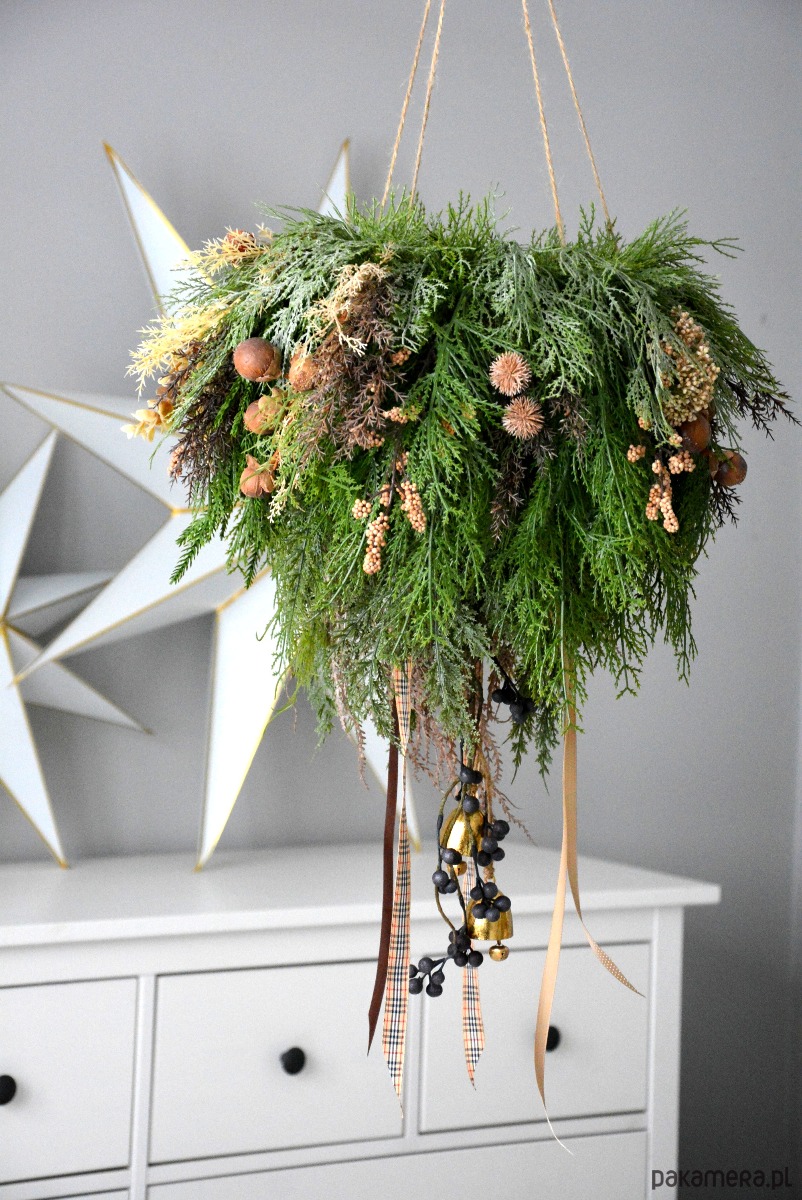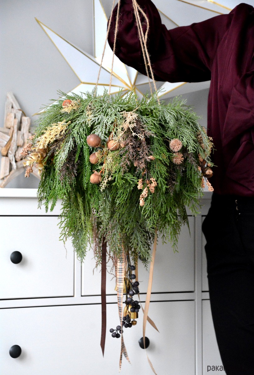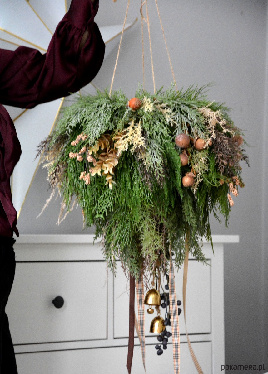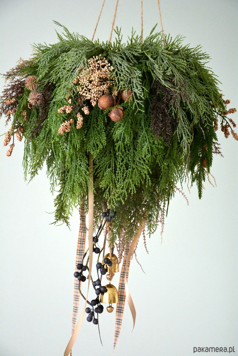 Wieniec wiszący z dzwonkami, z wysokiej jakości sztucznych iglastych gałęzi oraz dodatków. Z dolnej części wieńca zwisają długie wstążki, a między nimi umieszczone są małe dzwonki oraz ozdobne elementy, które dodają lekkości i ruchu całej kompozycji. Całość jest zawieszona na naturalnych sznurkach jutowych.