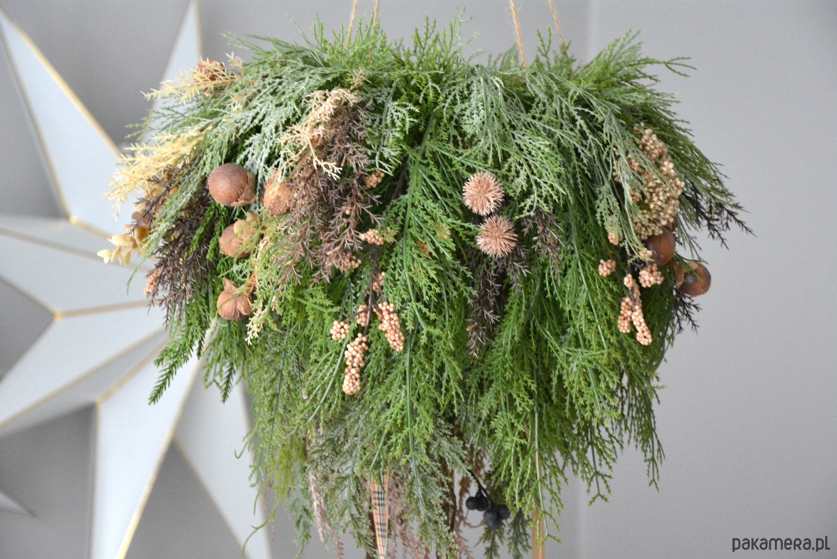 Dekoracja ma rustykalny, naturalny charakter i doskonale pasuje do zimowego lub świątecznego wystroju wnętrza.
