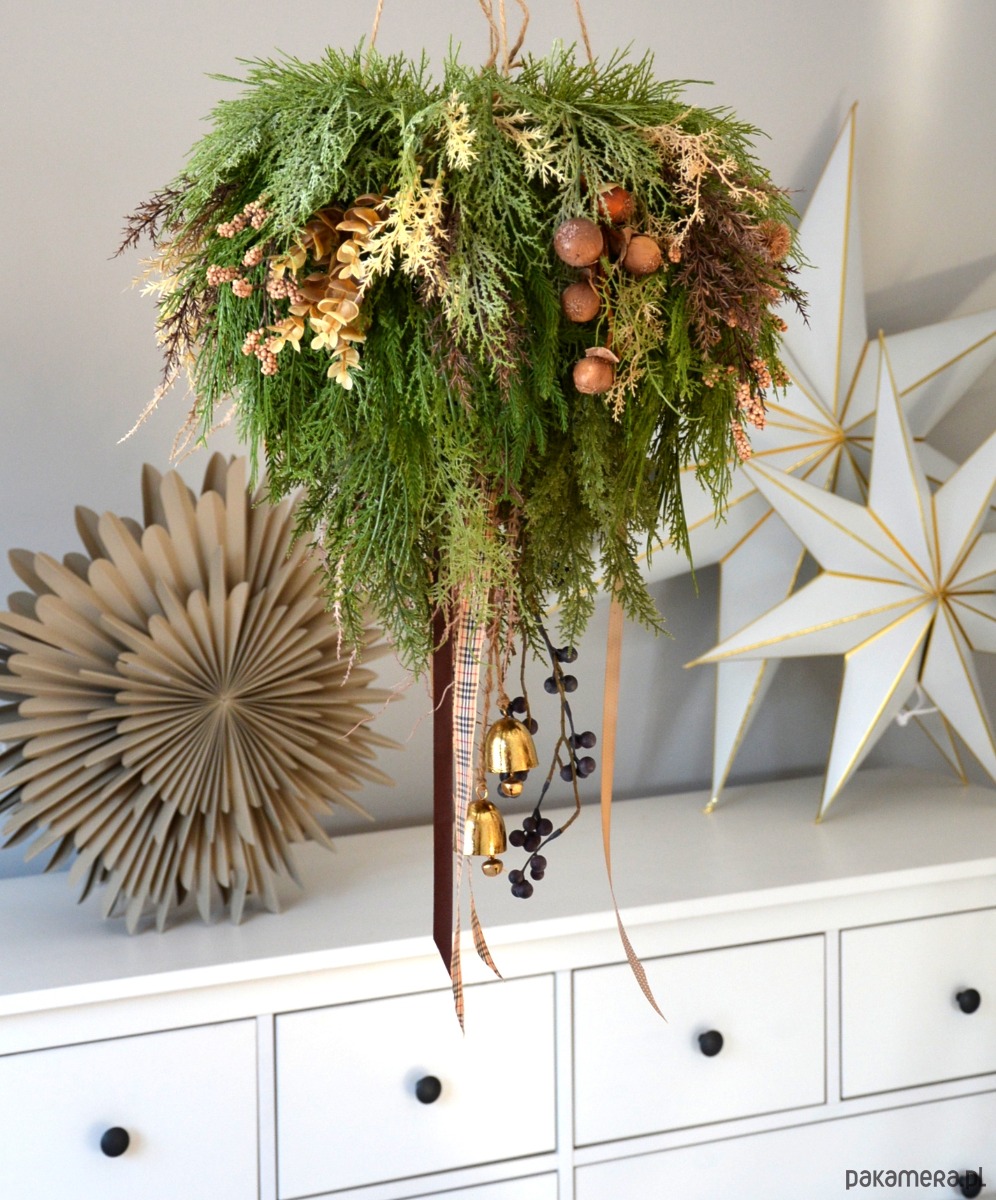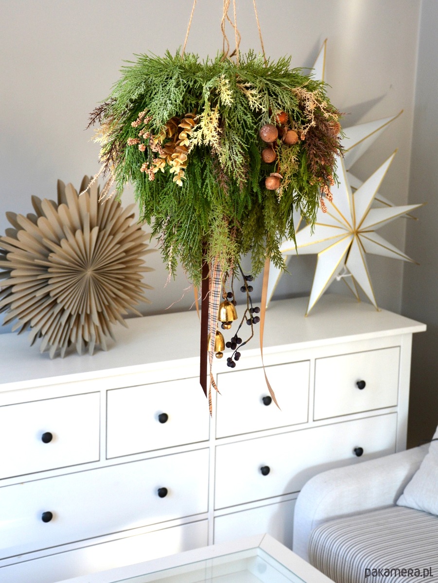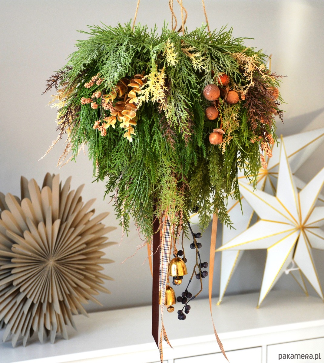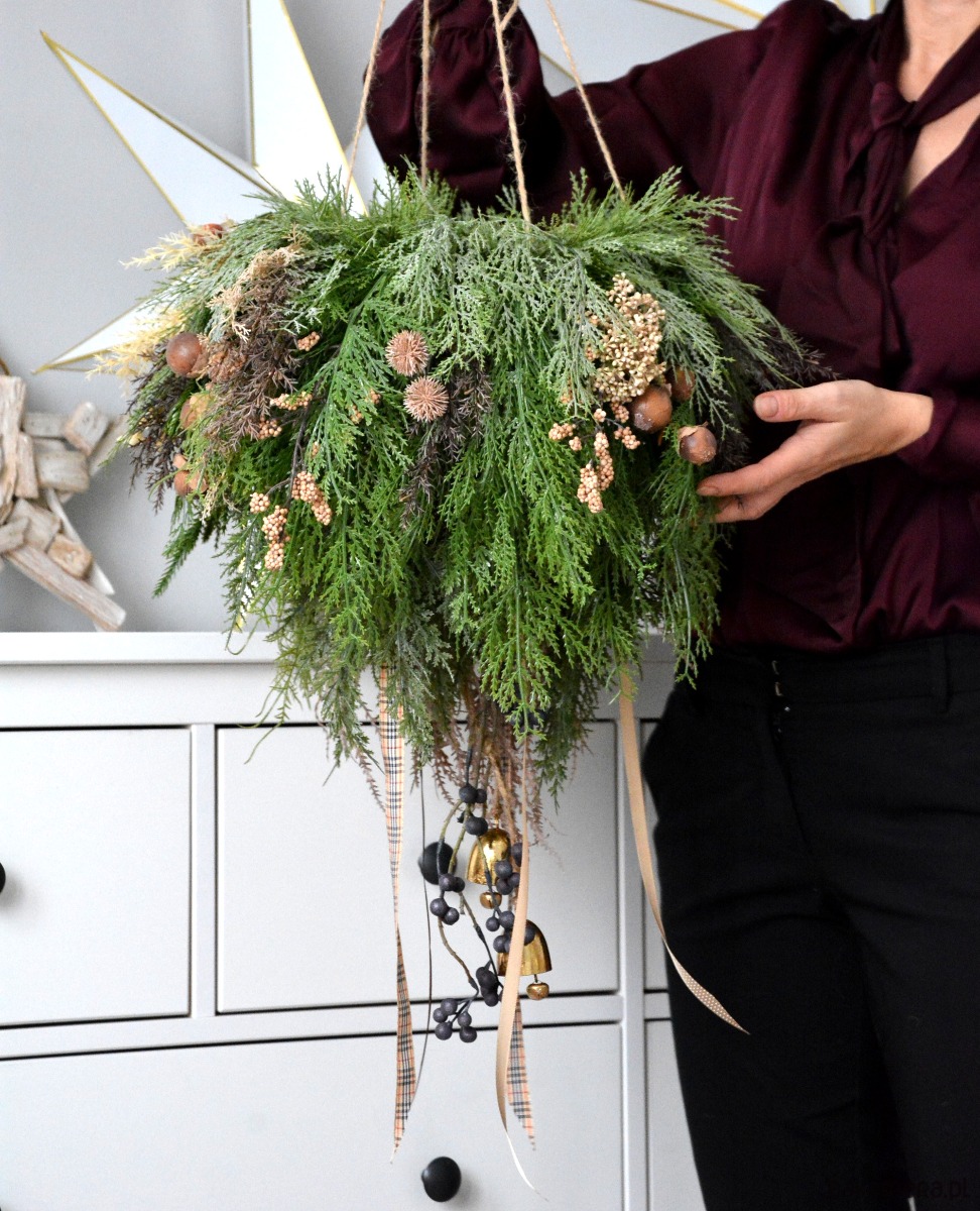 Wieniec wiszący z dzwonkami, z wysokiej jakości sztucznych iglastych gałęzi oraz dodatków. Z dolnej części wieńca zwisają długie wstążki, a między nimi umieszczone są małe dzwonki oraz ozdobne elementy, które dodają lekkości i ruchu całej kompozycji. Całość jest zawieszona na naturalnych sznurkach jutowych.