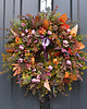 Bogato utkany wrzosem i owocami jesieni wianek w kolorze śliwki, ciepłych żółci, pomarańczy i i czerwieni.