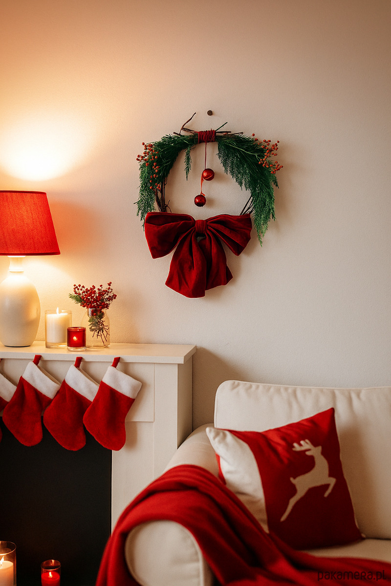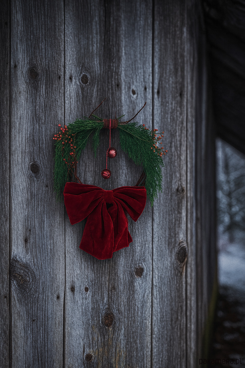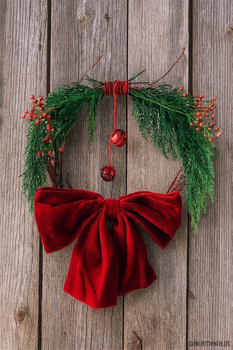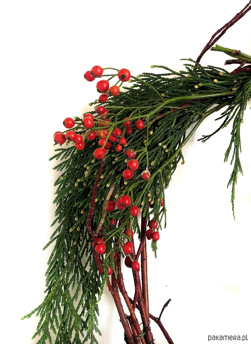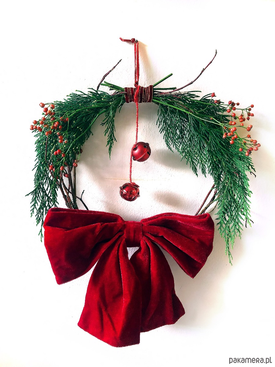 Minimalistyczny świąteczny wianek stworzony z czerwonych gałązek derenia, jałowca i dzikiej róży. Doceniamy piękno tych prostych elementów natury, dlatego jest w nim nie dużo komponentów. Zachwycamy się każdym patyczkiem i witką! Motywem przewodnim jest tu wielka czerwona kokarda z weluru, która w tym sezonie dominuje w światowych trendach świątecznych. Elementem ozdobnym są dwa czerwone tradycyjne dzwonki oraz jutowy sznurek. Wianek zakomponowany jest symetrycznie i utrzymany w czerwonej kolorystyce. Każdy nasz wianek powstaje z ekologicznych materiałów, wszystkie gałązki pochodzą z cięć sanitarnych krzaków i drzew naszego ogrodu. Każdy wianek ma drucik, lub kokardkę do powieszenia. Wianek może ozdobić Twoje drzwi, okno lub ścianę. Solidna podstawa z derenia, pozwala na użycie jej do własnej kompozycji w przyszłości :) Wymiary: 40 x 40 cm