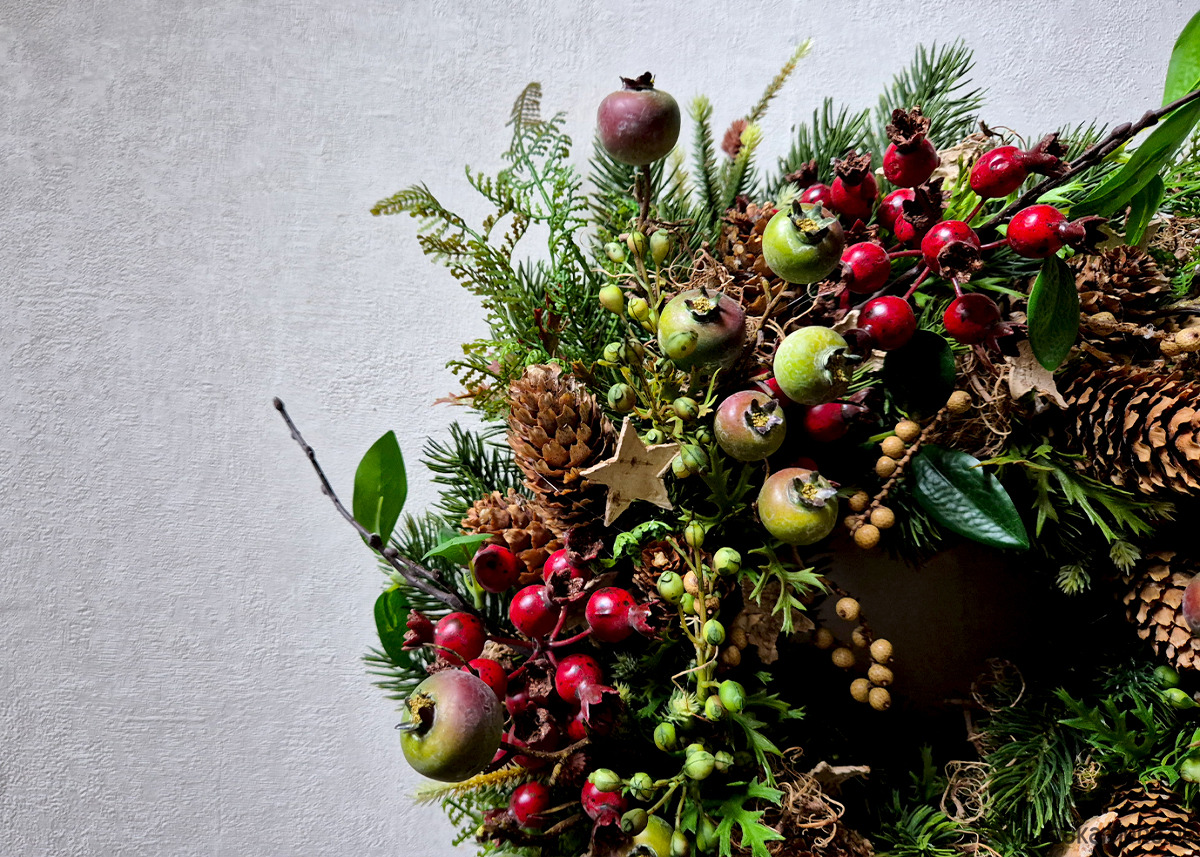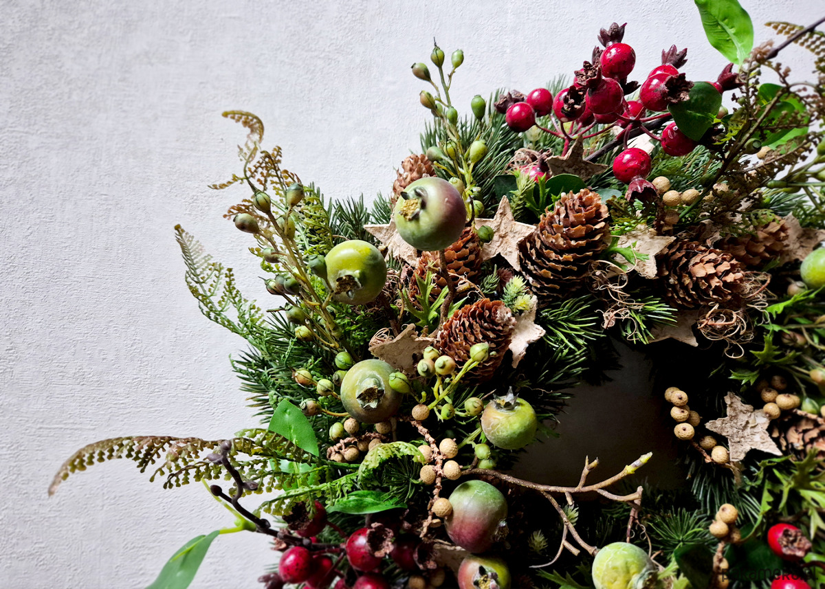 Wianek w naturalnym stylu wykonany z wysokiej jakości imitacji świerku. Dekorowany gałązkami dzikiej róży z czerwonymi i zielonymi owocami, rajskimi jabłuszkami, świerkowymi szyszkami i gwiazdkami z kory brzozy.. Średnica ok. 40cm.