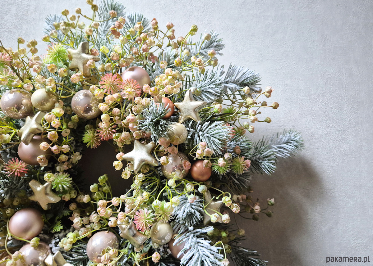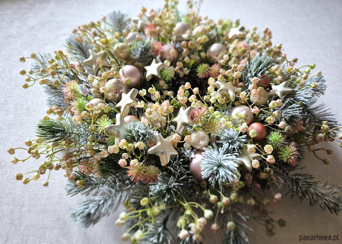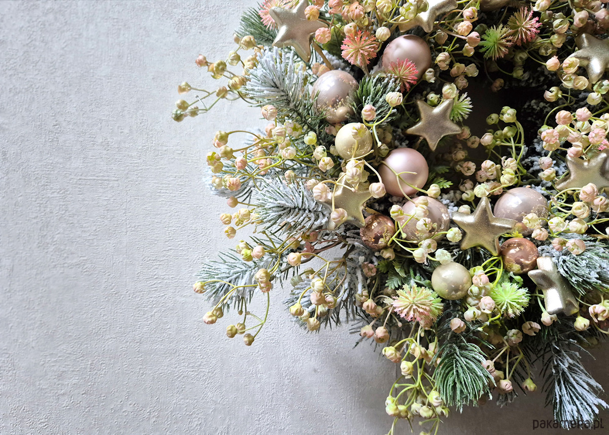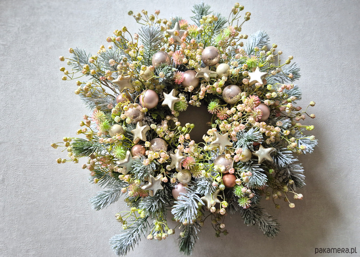 Oryginalny wianek w niebanalnej kolorystyce. Delikatny wianek w subtelnej kolorystyce. Wykonany z ośnieżonych gałązek oraz gipsówki z delikatnym różowym zabarwieniem. Połyskujący bombkami i szampańskimi gwiazdkami. Średnica ok. 40 - 45cm.