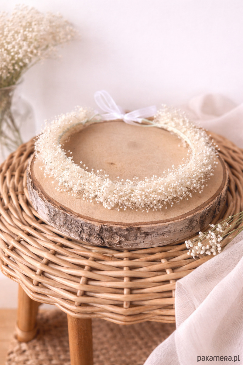 Wianek na głowę z roślinności naturalnej i trwałej: stabilizowanej gipsówki mini biel.