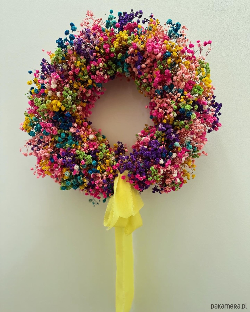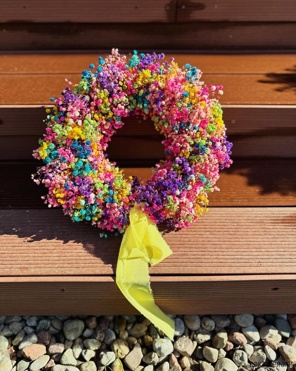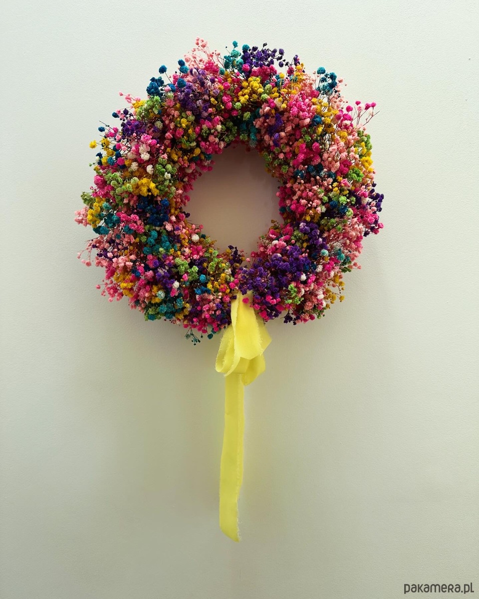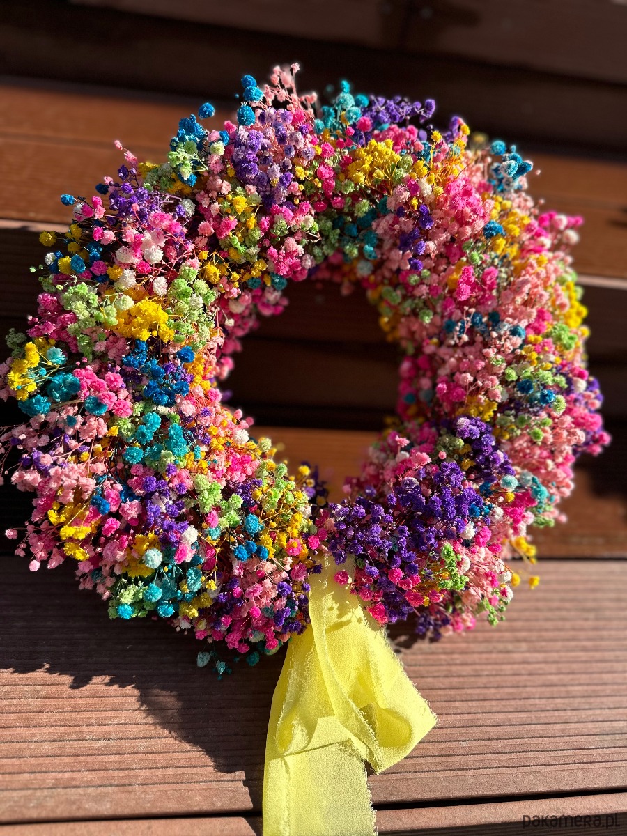 Wianek z gipsówki stabilizowanej w kolorze tęczowym. Jest to połączenie 8 - 10 kolorów gipsówki na słomianym kole.