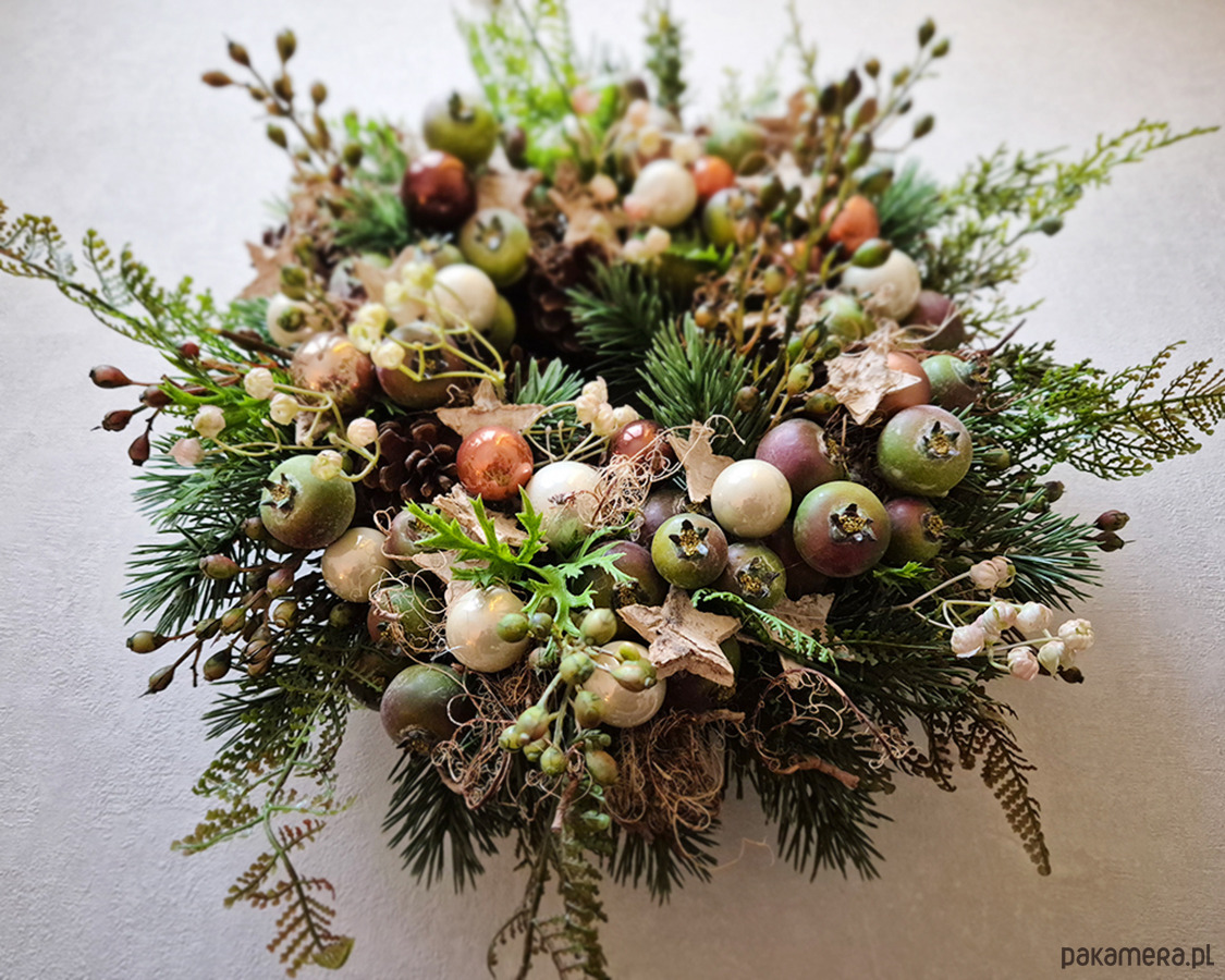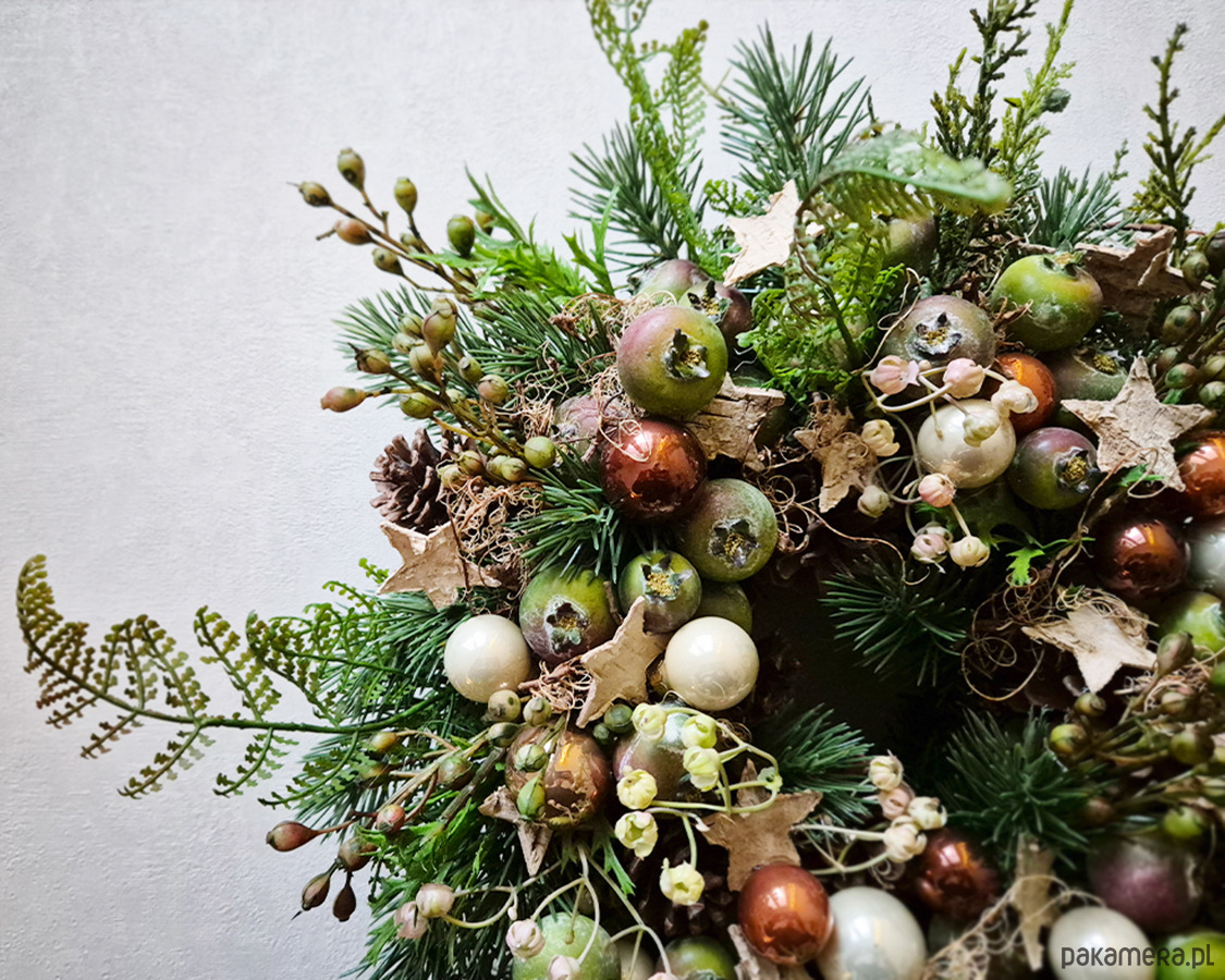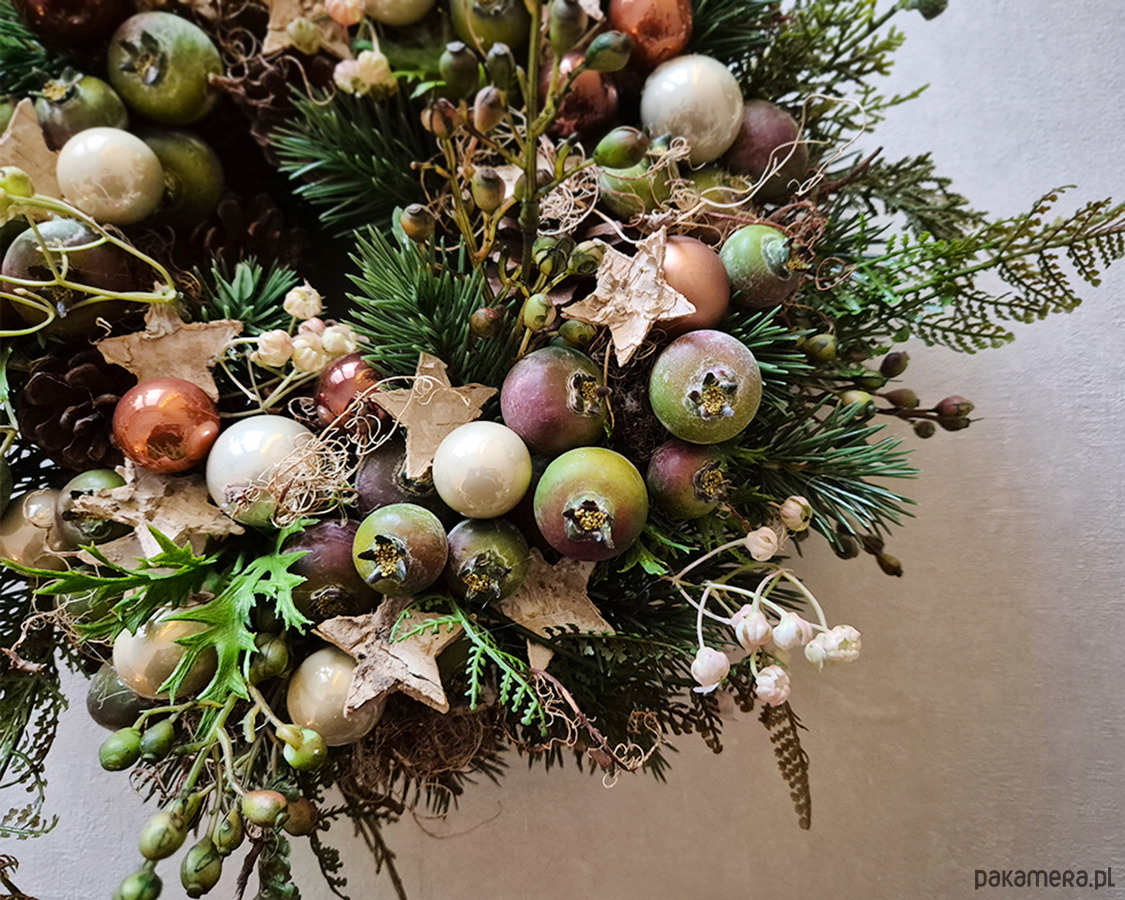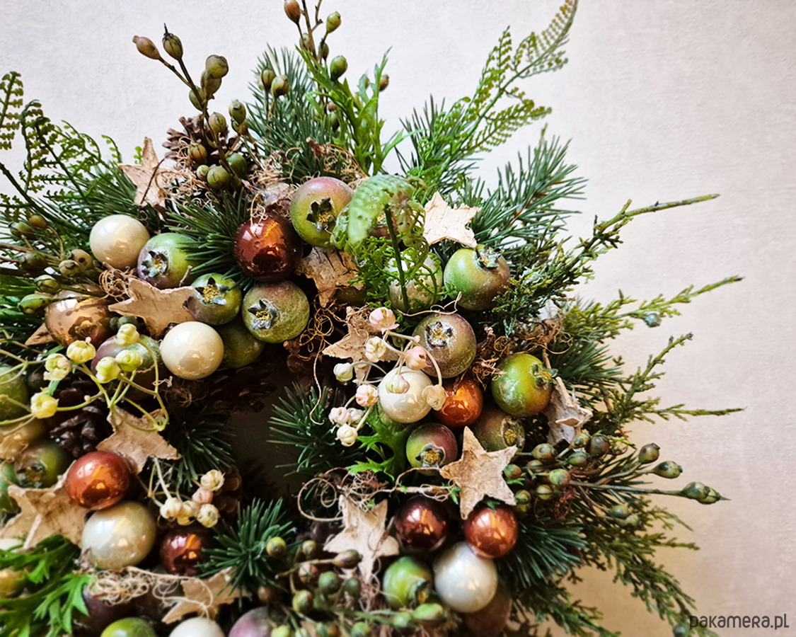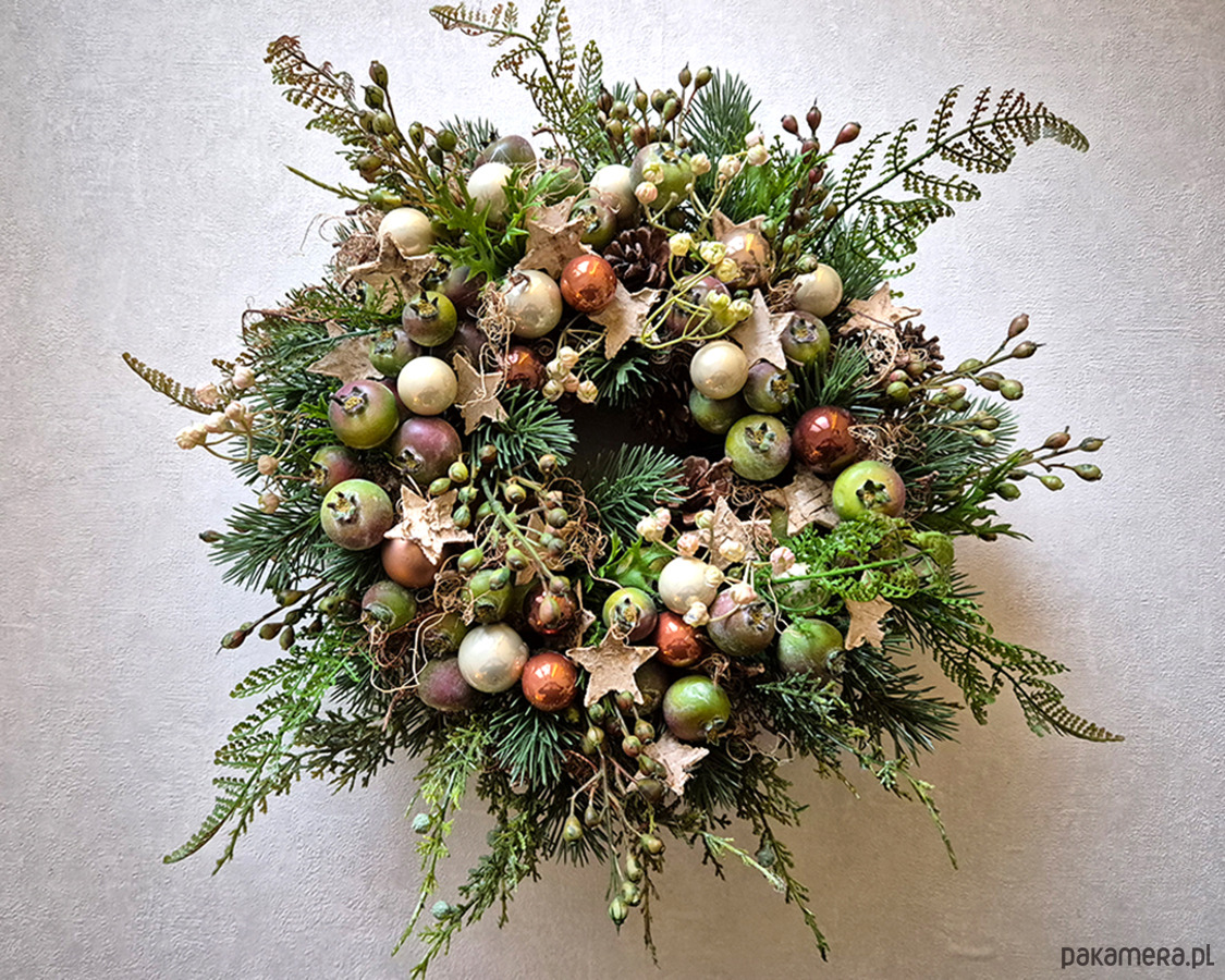 Niebanalny, świąteczny wianek w oryginalnej kolorystyce. Wykonany z wysokiej jakości sztucznych gałązek świerku, pędów dzikiej róży z owockami, liści paproci, Udekorowany rajskimi jabłuszkami, bombkami oraz gwiazdkami z kory brzozy. Średnica ok. 36cm