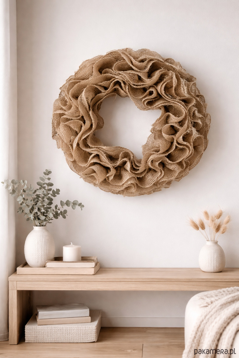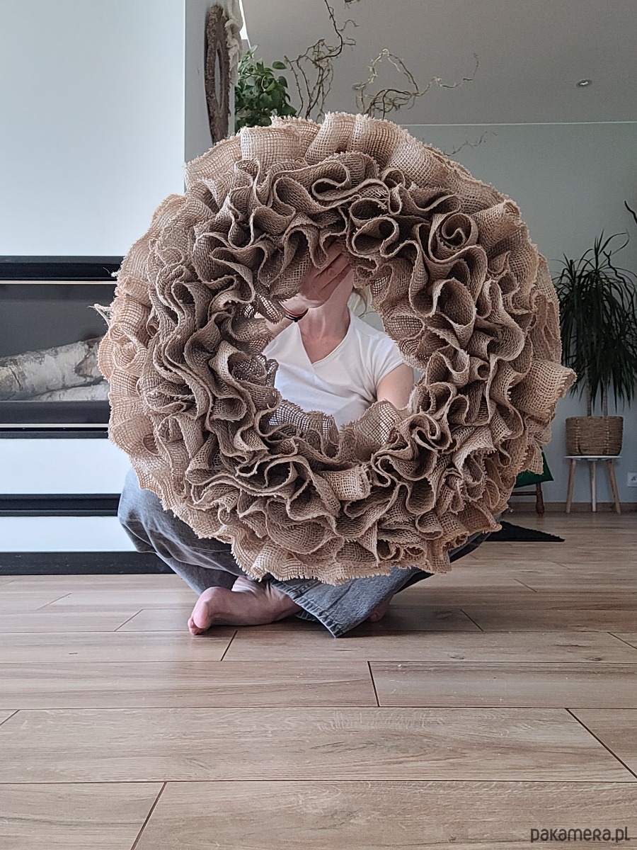 Duży, efektowny wianek z naturalnej juty o średnicy 60 cm to dekoracja, która przyciąga wzrok i ociepla wnętrze od pierwszego spojrzenia. ( wysyłka tylko kurierska).