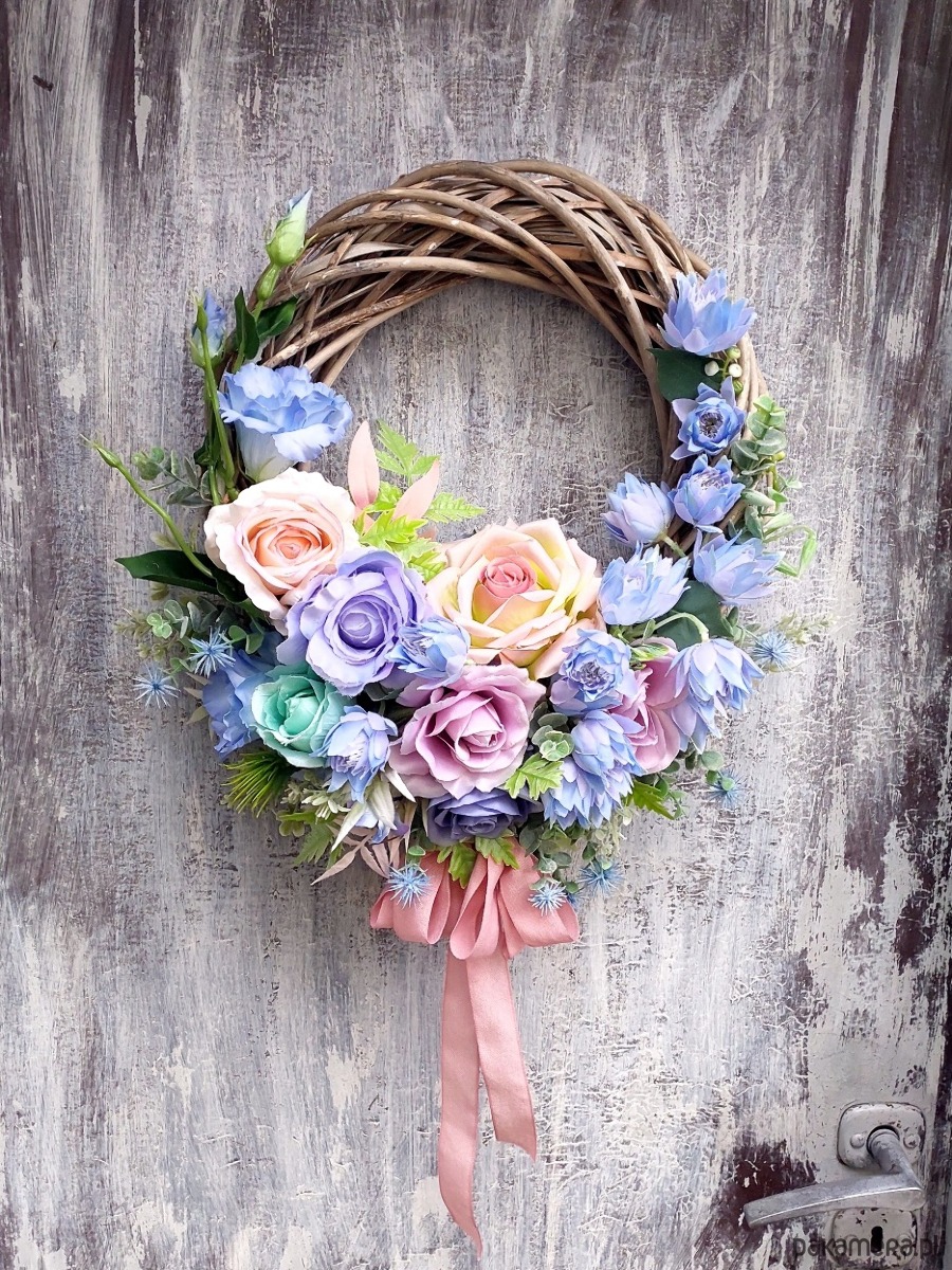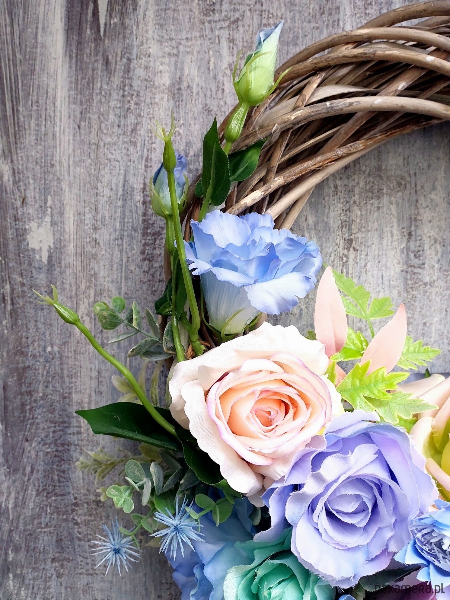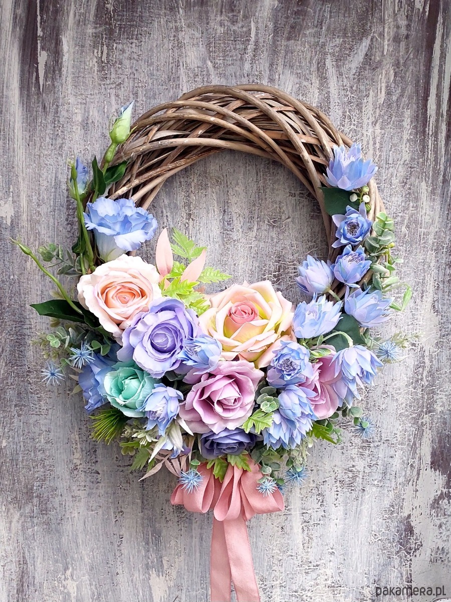 Uroczy wianek będzie stanowił niezwykłą ozdobę Twoich wnętrz. Wiklinowy wianek udekorowany został kompozycją z kwiatów, które będą kwitły w Twoim domu przez cały rok :) Średnica zewnętrzna samego wiklinowego wianka to ok. 30 cm, wymiary całej dekoracji to 42x50 cm. Do zawieszenia np. na ścianie lub na drzwiach.