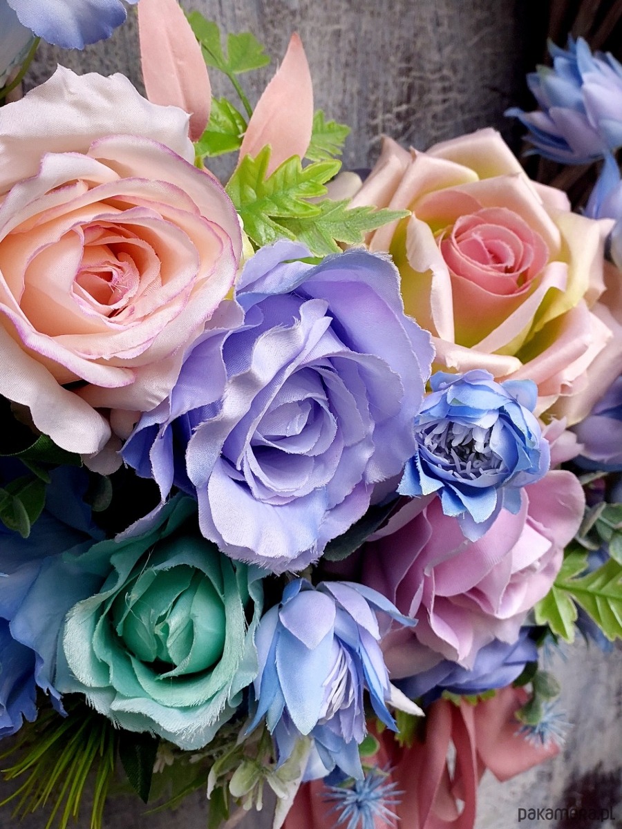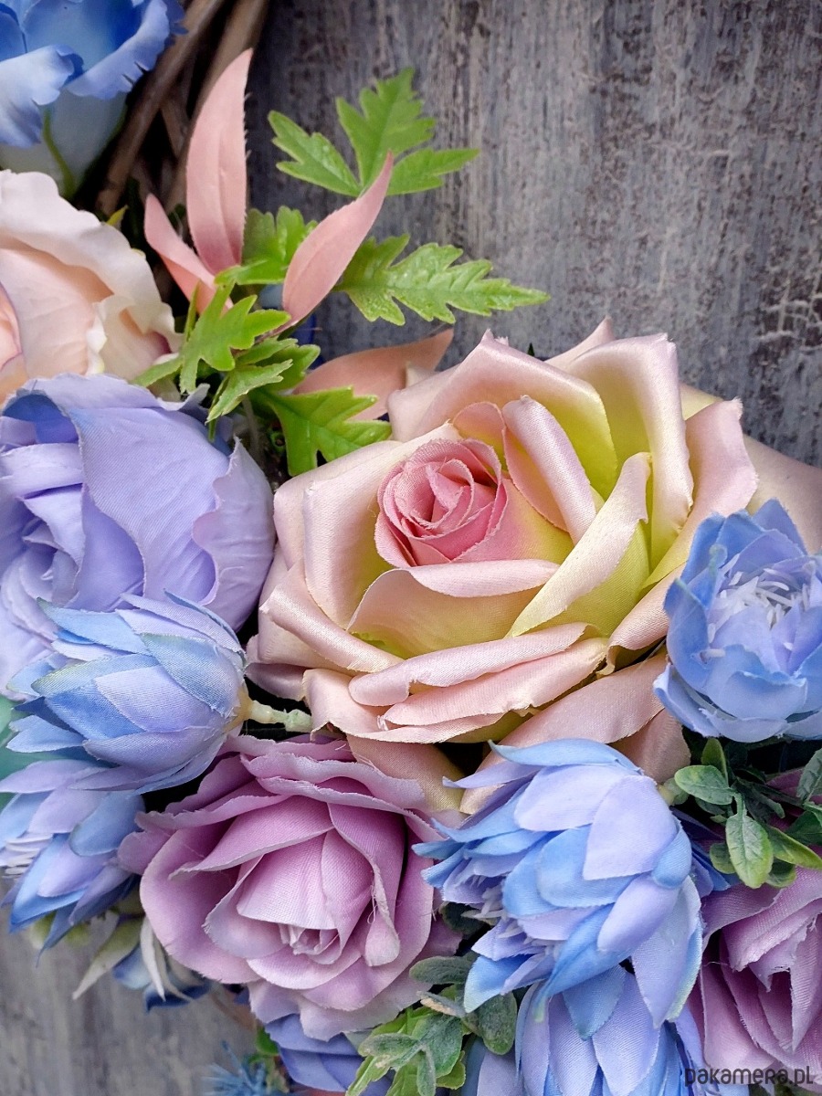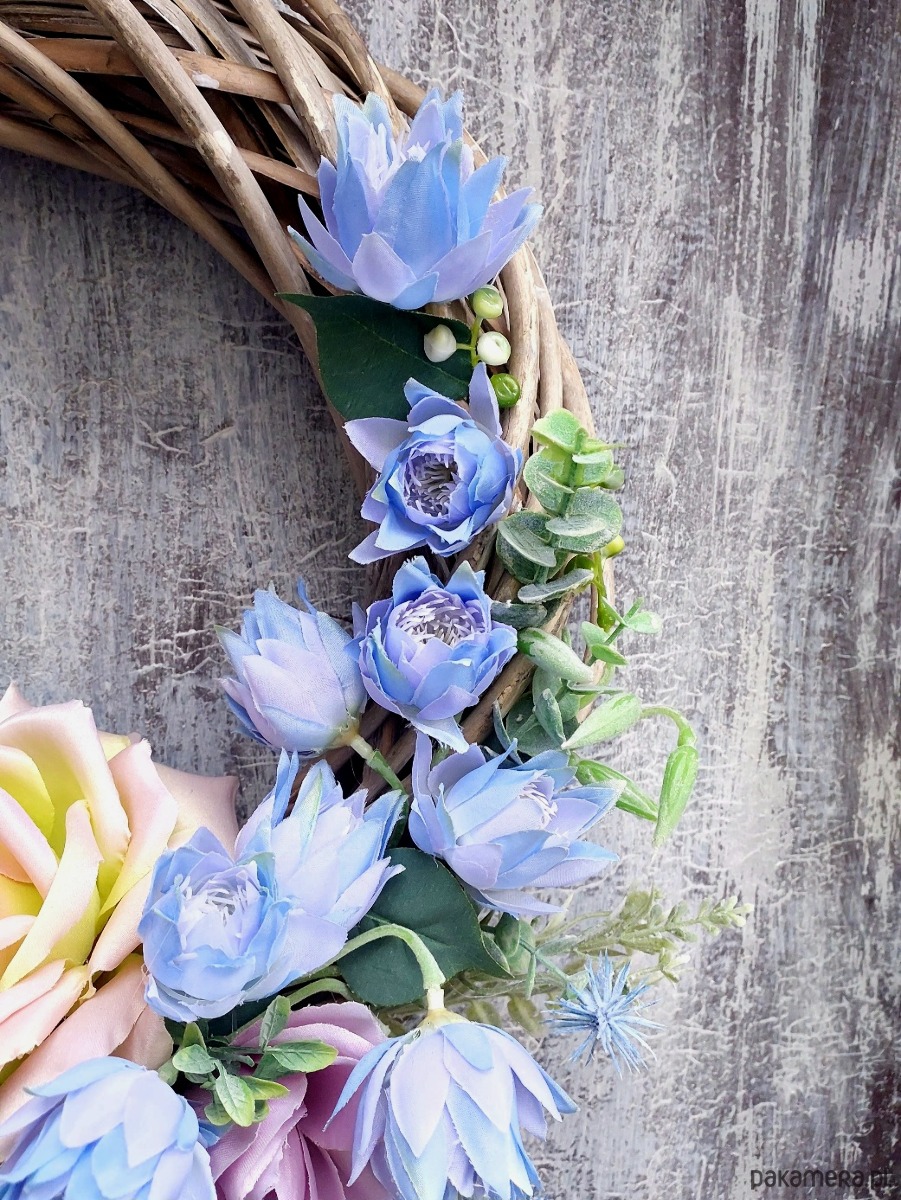 Uroczy wianek będzie stanowił niezwykłą ozdobę Twoich wnętrz. Wiklinowy wianek udekorowany został kompozycją z kwiatów, które będą kwitły w Twoim domu przez cały rok :) Średnica zewnętrzna samego wiklinowego wianka to ok. 30 cm, wymiary całej dekoracji to 42x50 cm. Do zawieszenia np. na ścianie lub na drzwiach.