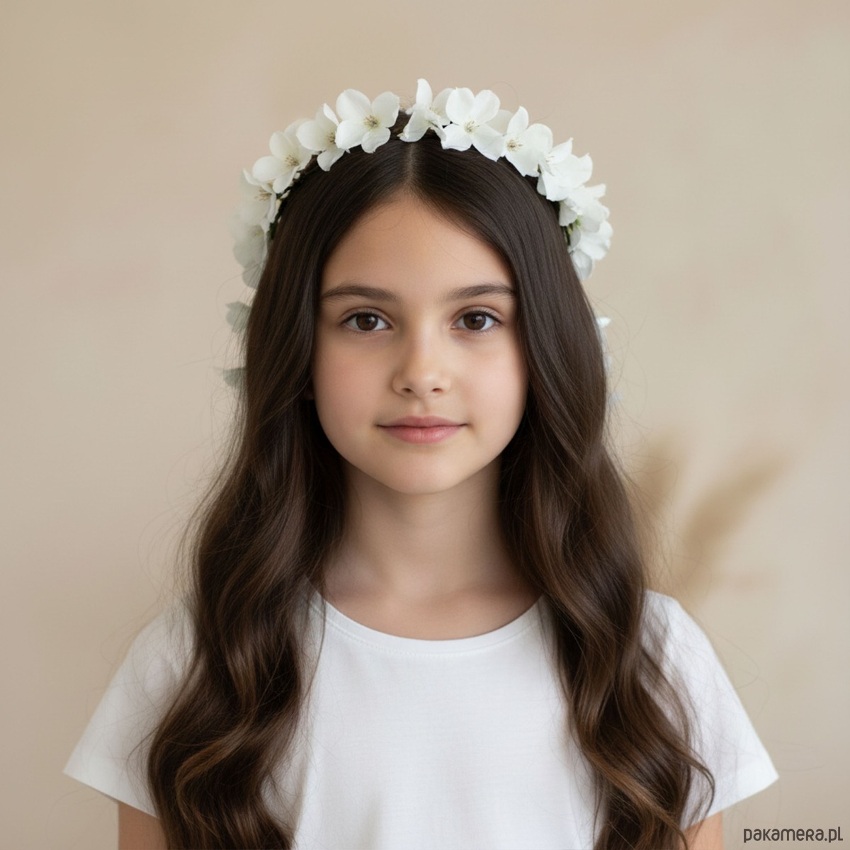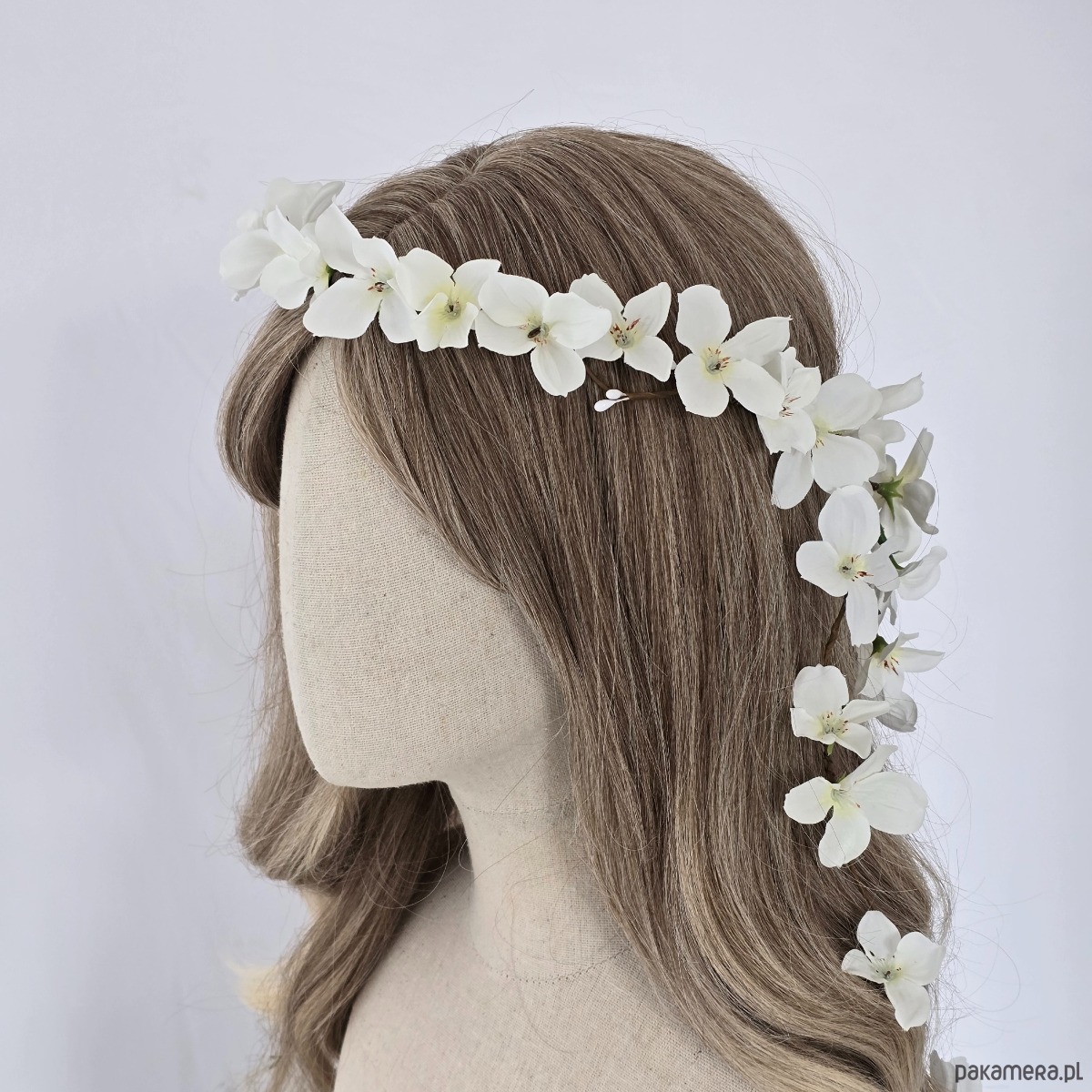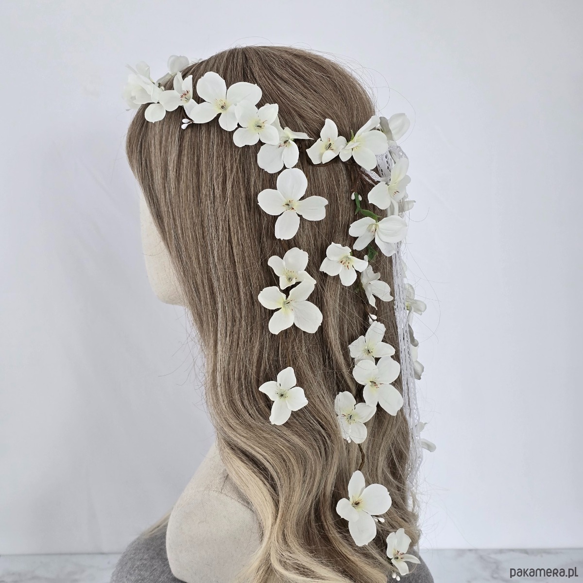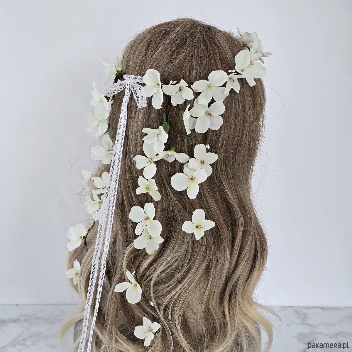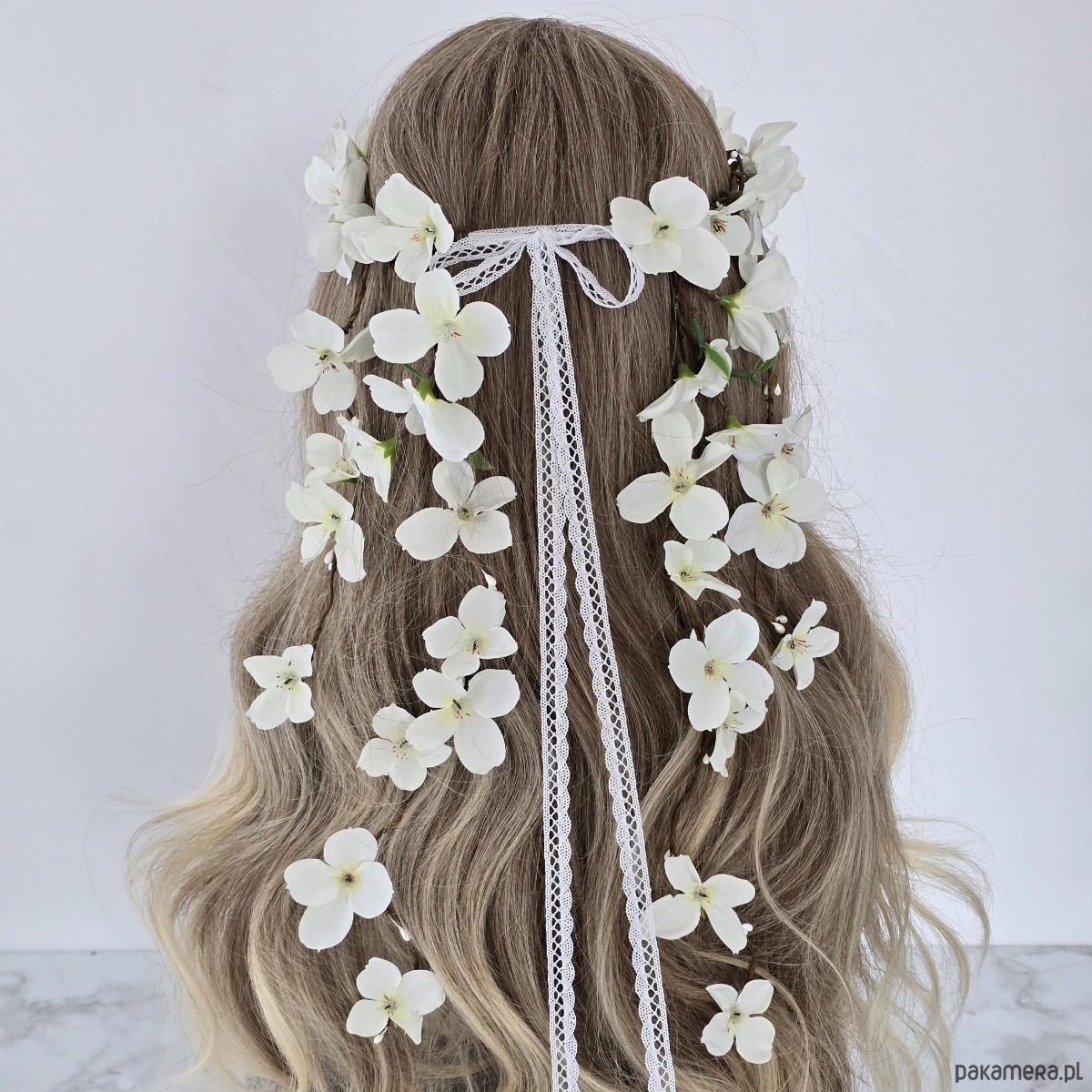 Piękny wianek na głowę utrzymany w tonacji złamanej bieli. Wianek ma bardzo oryginalny wzór z kwiatuszkami opadającymi z tyłu na włosy. Wykonany z materiałów syntetycznych, dzięki czemu jest trwały i posłuży przez wiele lat. Część kwiatowa wianka ma 50 cm, więc pasuje na każdą głowę o obwodzie powyżej 50 cm. Będzie pasował zarówno na głowę dziecka, jak i na głowę osoby dorosłej. Możliwość regulacji wielkości obwodu dzięki koronkowej tasiemce z tyłu.