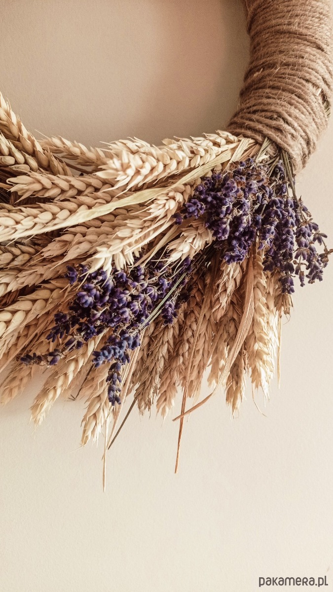 Przedstawiamy Państwu wianek wykonany z naturalnie suszonej lawendy oraz pszenicy.