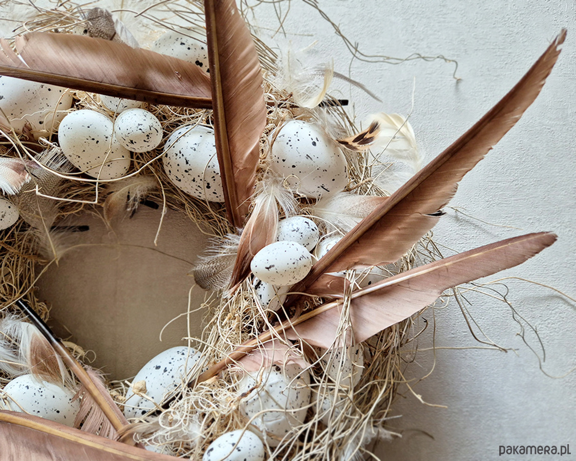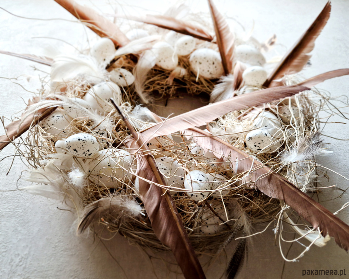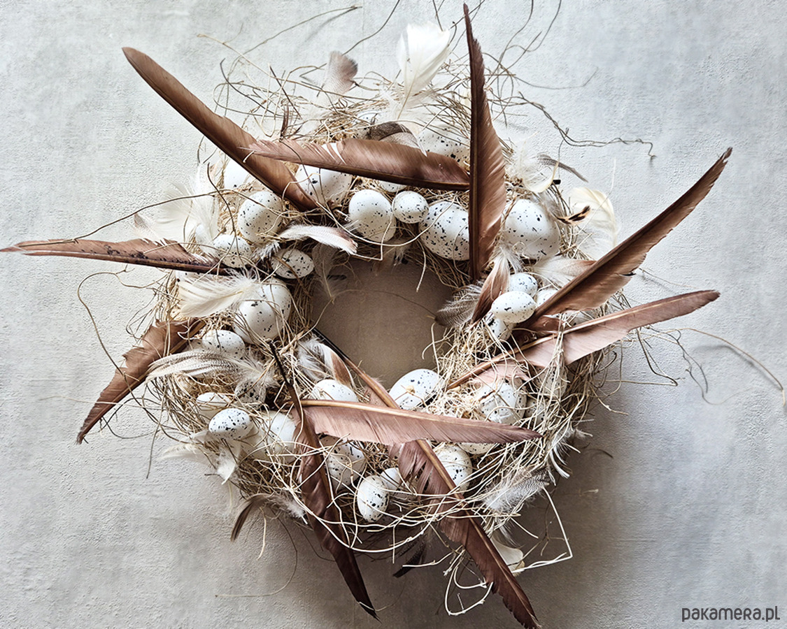 Minimalistyczny wielkanocny wianek. Wykonany z materiałów naturalnych oraz sztucznych jaj. Utrzymany w delikatnych odcieniach beżu, brązu i ecru. Będzie elegancką ozdobą zarówno nowoczesnych jak i stylowych wnętrz. Średnica ok 40cm.