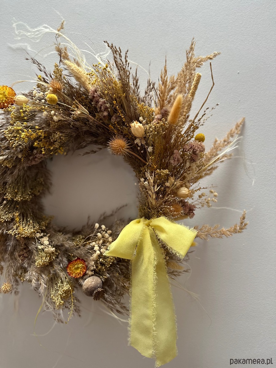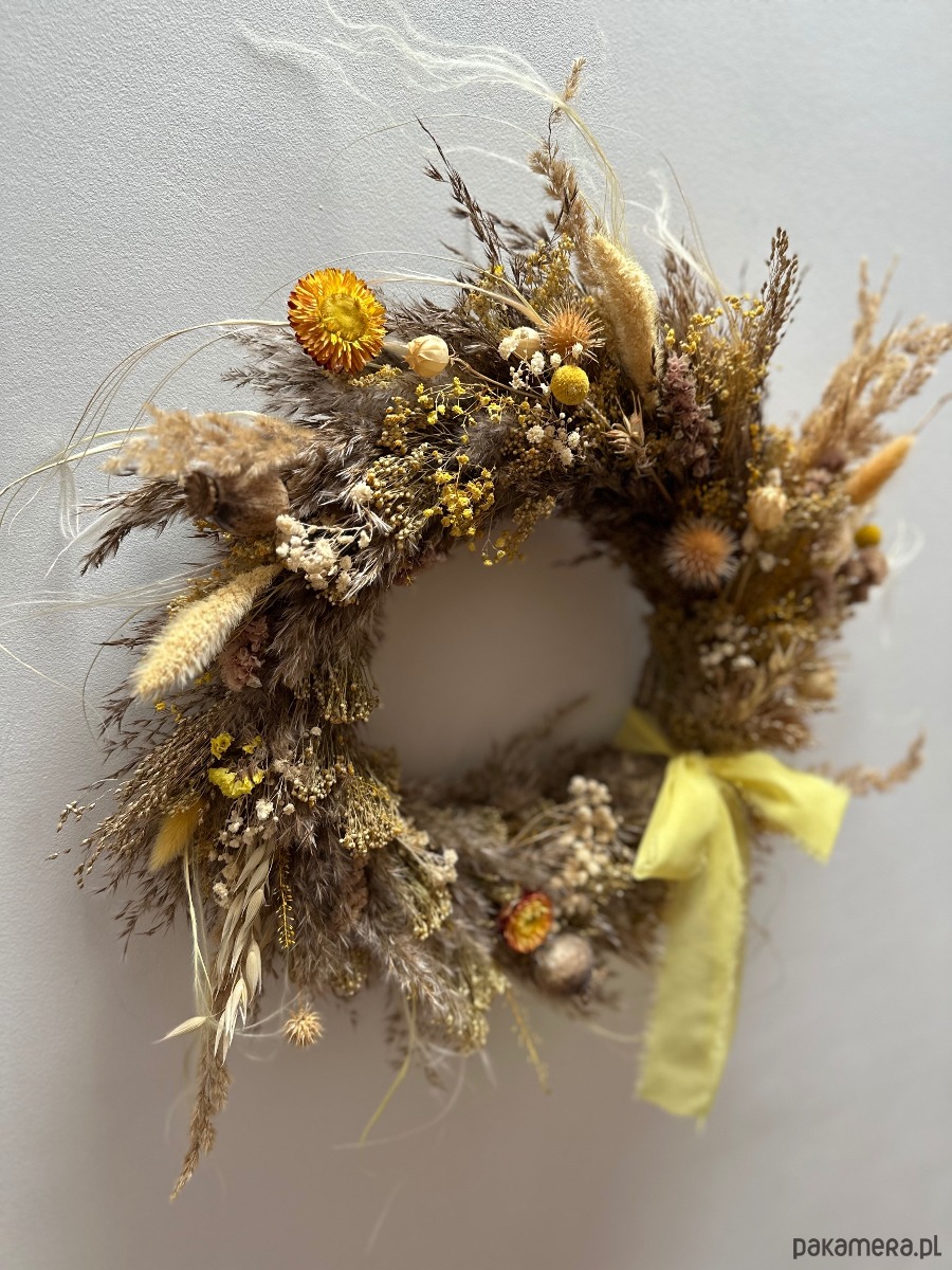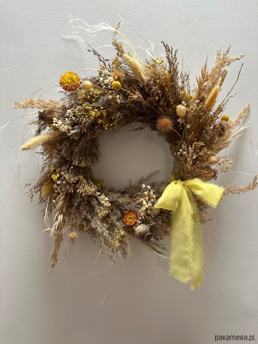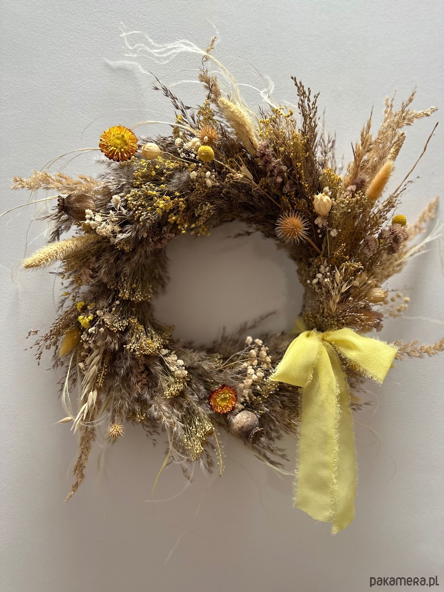 Wianek dekoracyjny wykonany na słomianym podkładzie z wykorzystaniem roślinności suszonej i stabilizowanej.