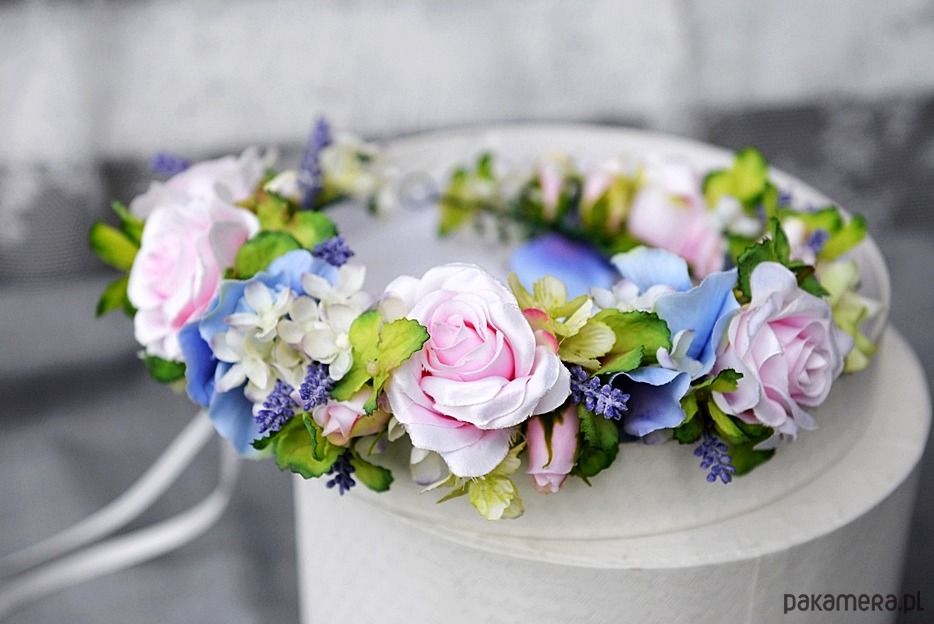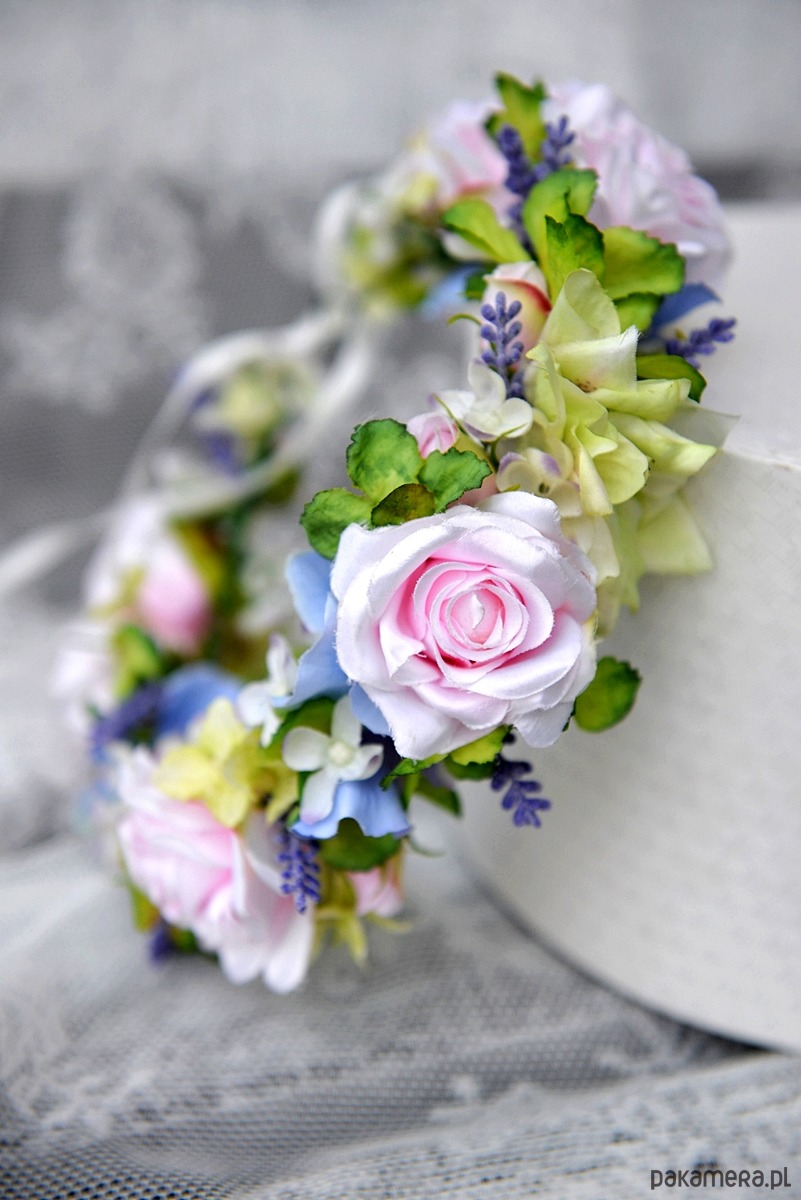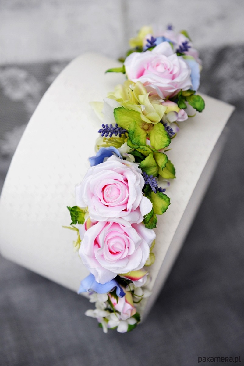 Wianek wykonałam z różowych róż, otoczoną lawendą, zieloną i niebieską hortensją.