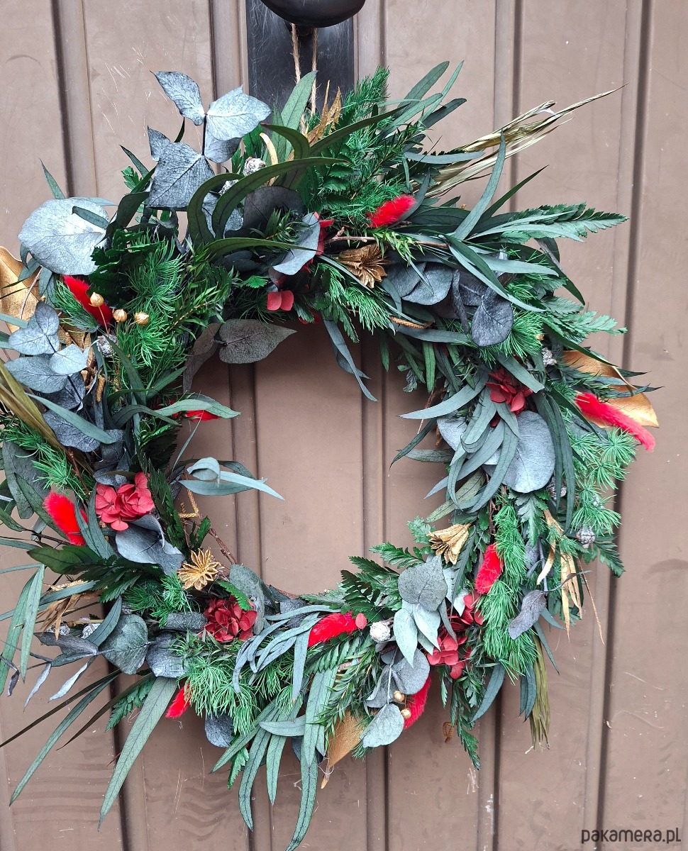 Naturalny, ręcznie robiony wianek z stabilizowanego eukaliptusa i suszonych kwiatów do wnętrza.