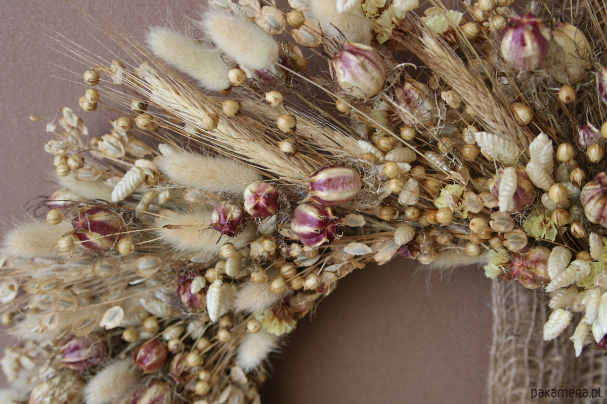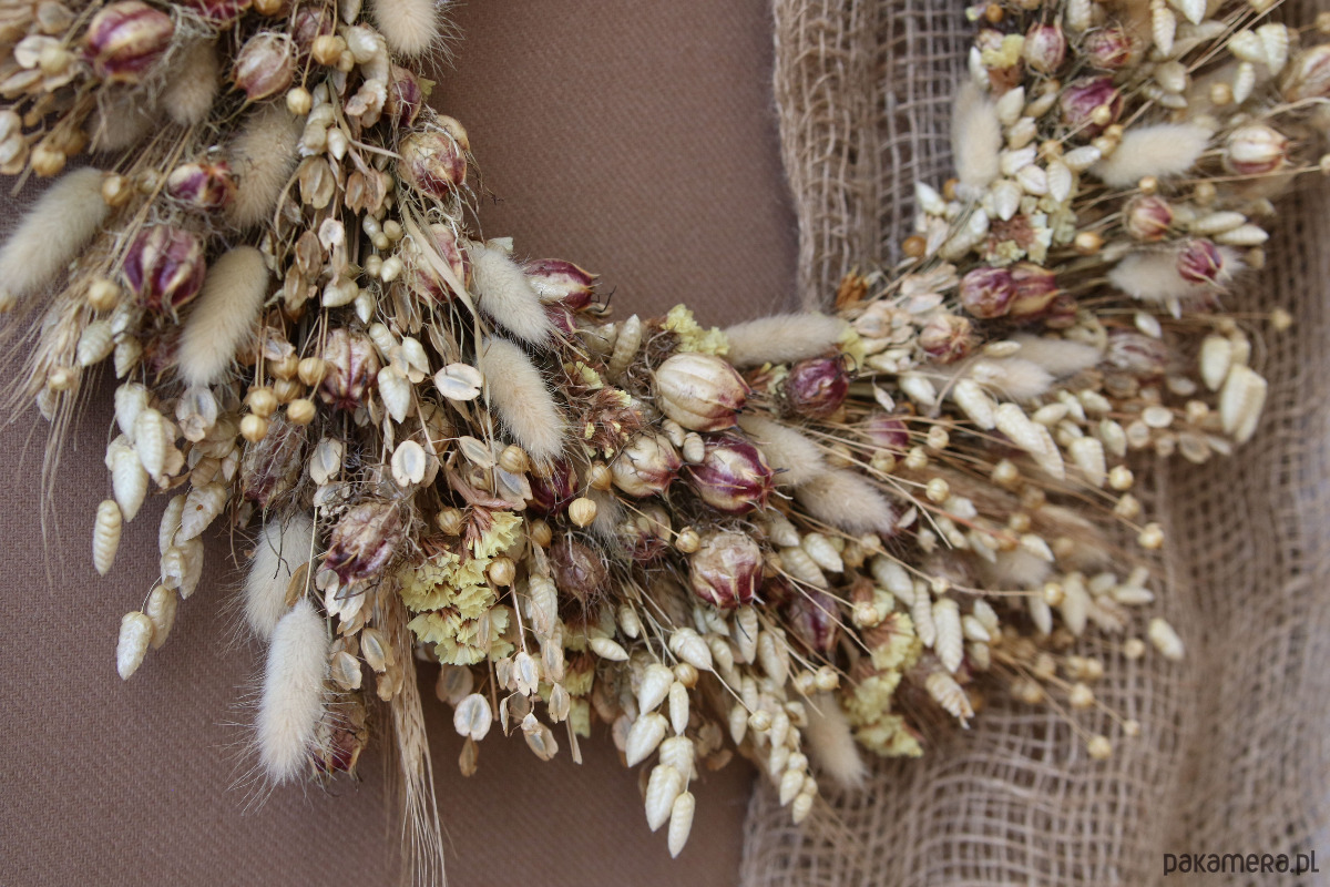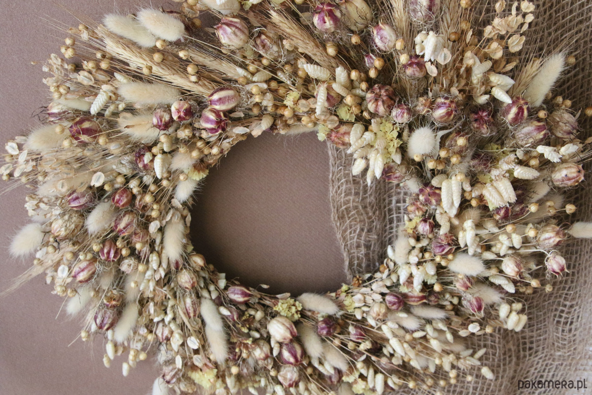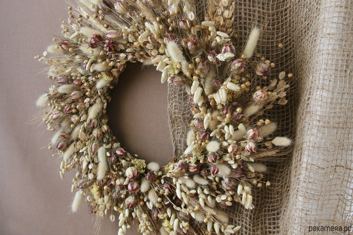 Wianek dekoracyjny z suszonych naturalnych kwiatów i traw na ścianę lub drzwi. Pięknie skomponuje się z innymi naturalnymi elementami wystroju- pasuje do drewna, surowego płótna i wikliny. Idealny do wnętrz w stylu rustykalnym, boho i tradycyjnym.