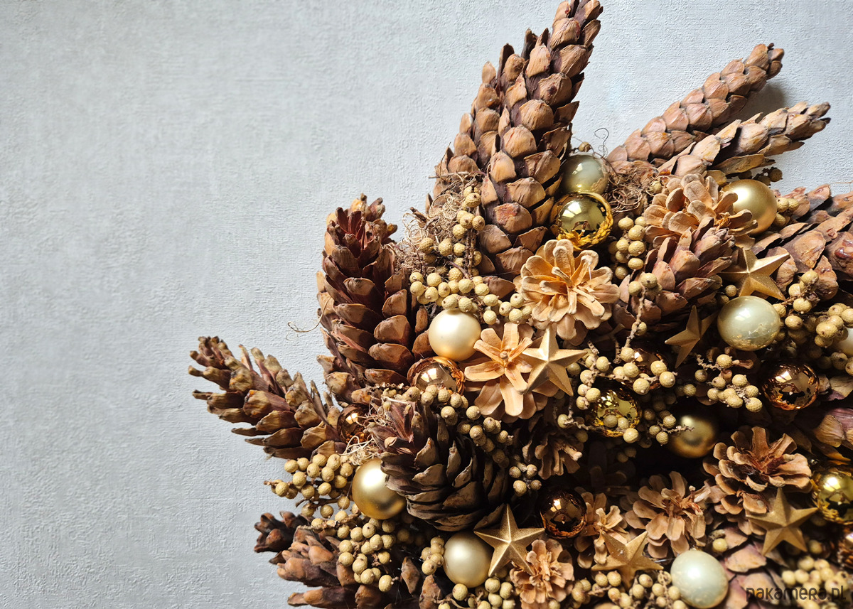 Złoty i nieskromny;) Prawdziwy nadszyszkownik Twojej Szuflandii W całości wykonany z suszu, szyszek różnych gatunków, owoców palmy.