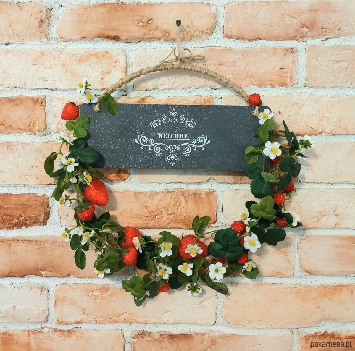 Sielski wianek będzie stanowił oryginalną ozdobę Twoich wnętrz. Wianek opleciony naturalnym sznurkiem przywodzi na myśl grządkę truskawek. Powieszony na drzwiach lub ścianie będzie pozytywnym akcentem, który powita Cię od razu po wejściu do domu :) Średnica metalowej obręczy to 30 cm. Wianek w komplecie z tabliczką widoczną na zdjęciu.