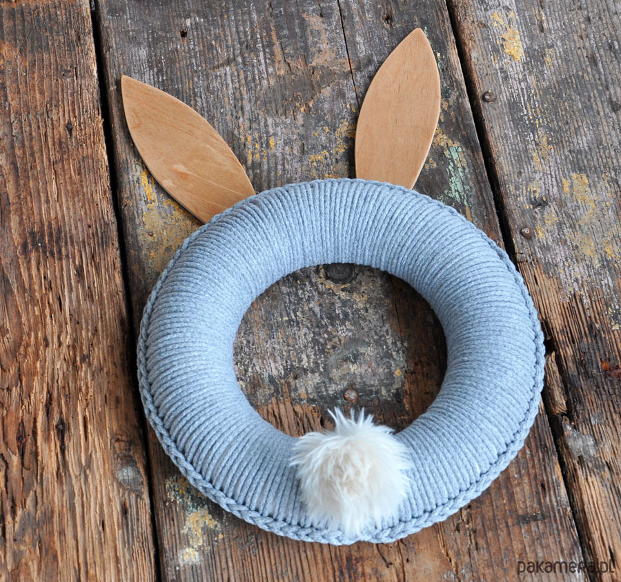 Wianek świąteczny Zajączek; wykonany z bawełnianego sznurka w kolorze szarym; uszy ręcznie wycinane ze sklejki; ogonek ze sztucznego futerka, ; średnica 35cm + uszy = razem 48cm; wianek jest przystosowany do powieszenia; zapraszam serdecznie