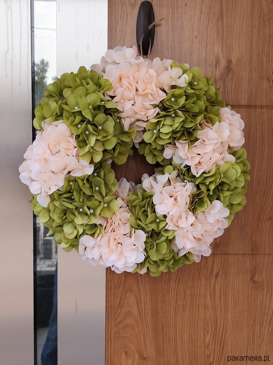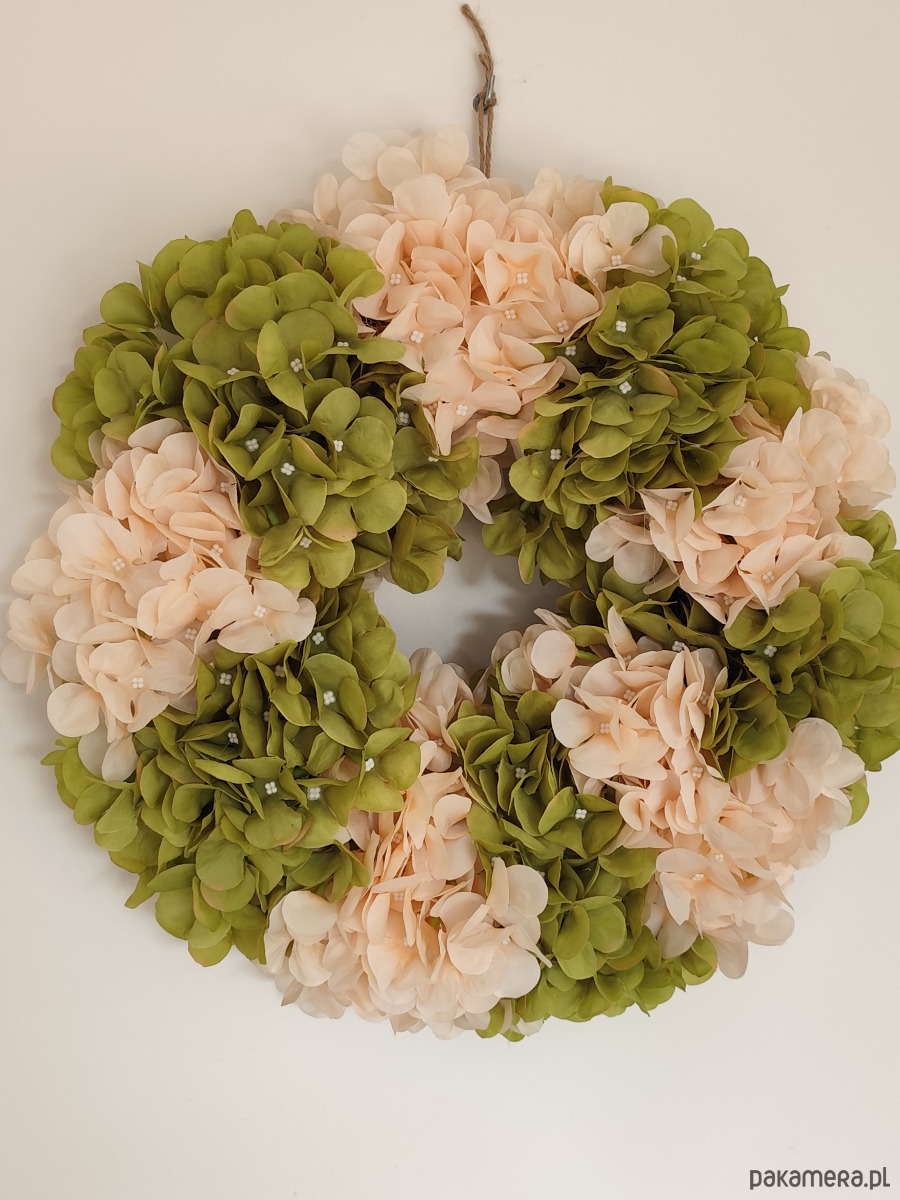 Wianek ze sztucznych hortnesji zielono- kremowy, dekoracja drzwi