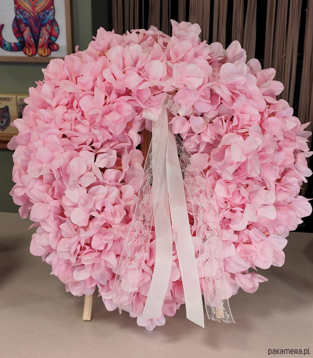 Różowy wianek z delikatnych kwiatów to subtelna dekoracja, która wprowadza do wnętrza romantyczny i lekki klimat. 🌸