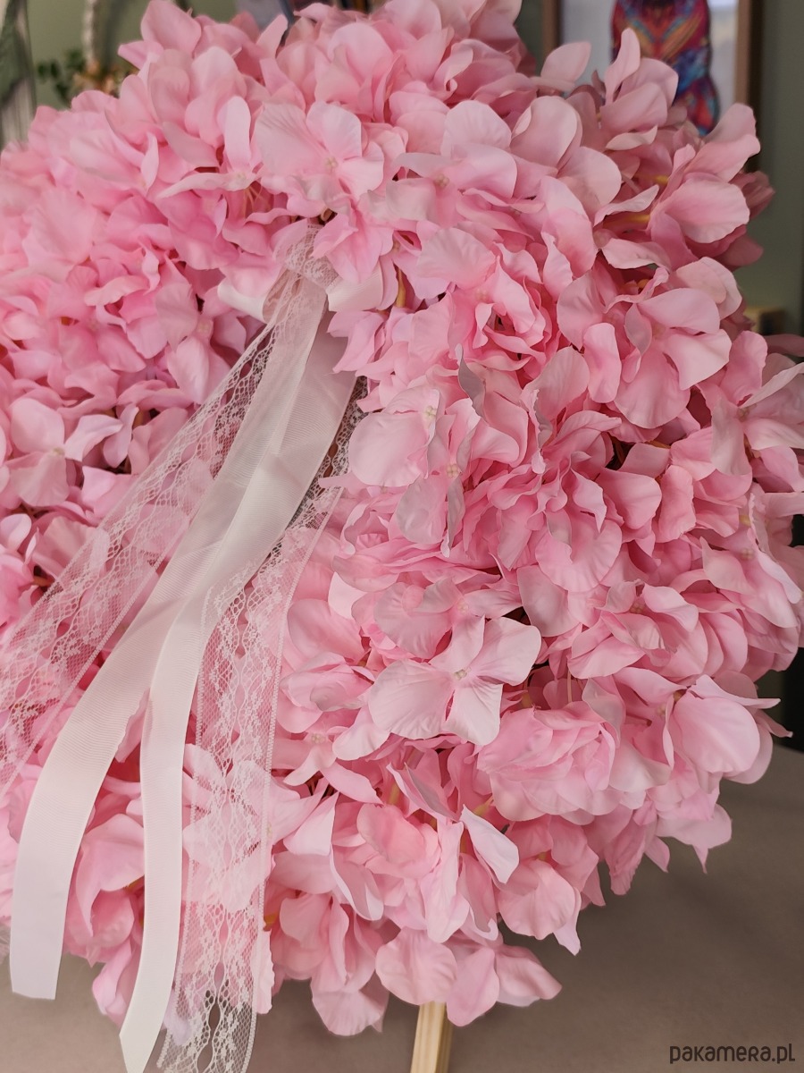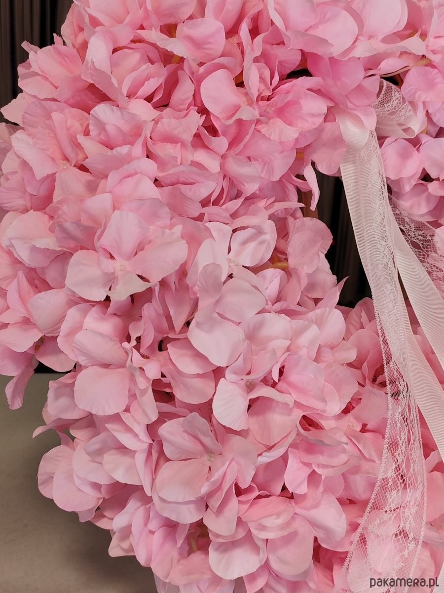Wianek ze sztucznych różowych hortnesji, dekoracja drzwi, ozdoba na drzwi