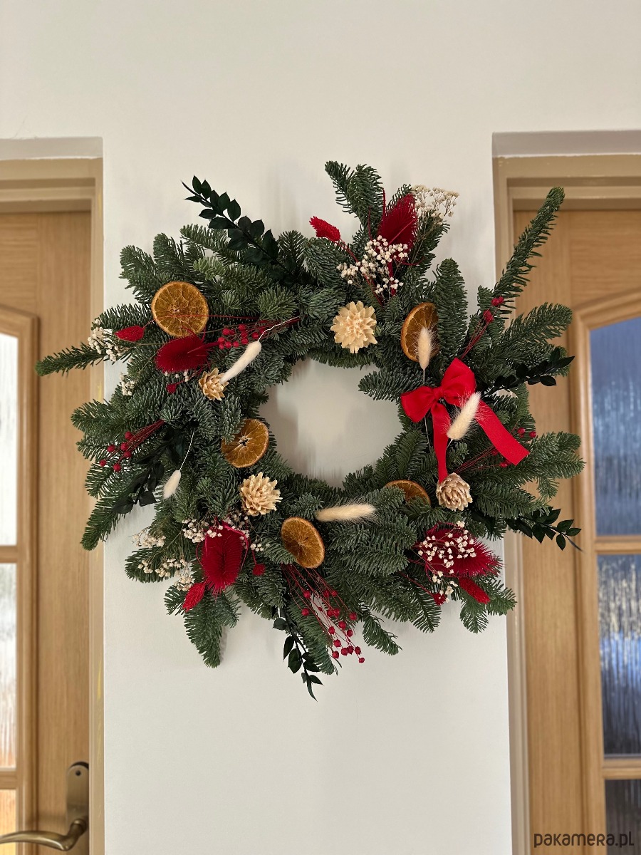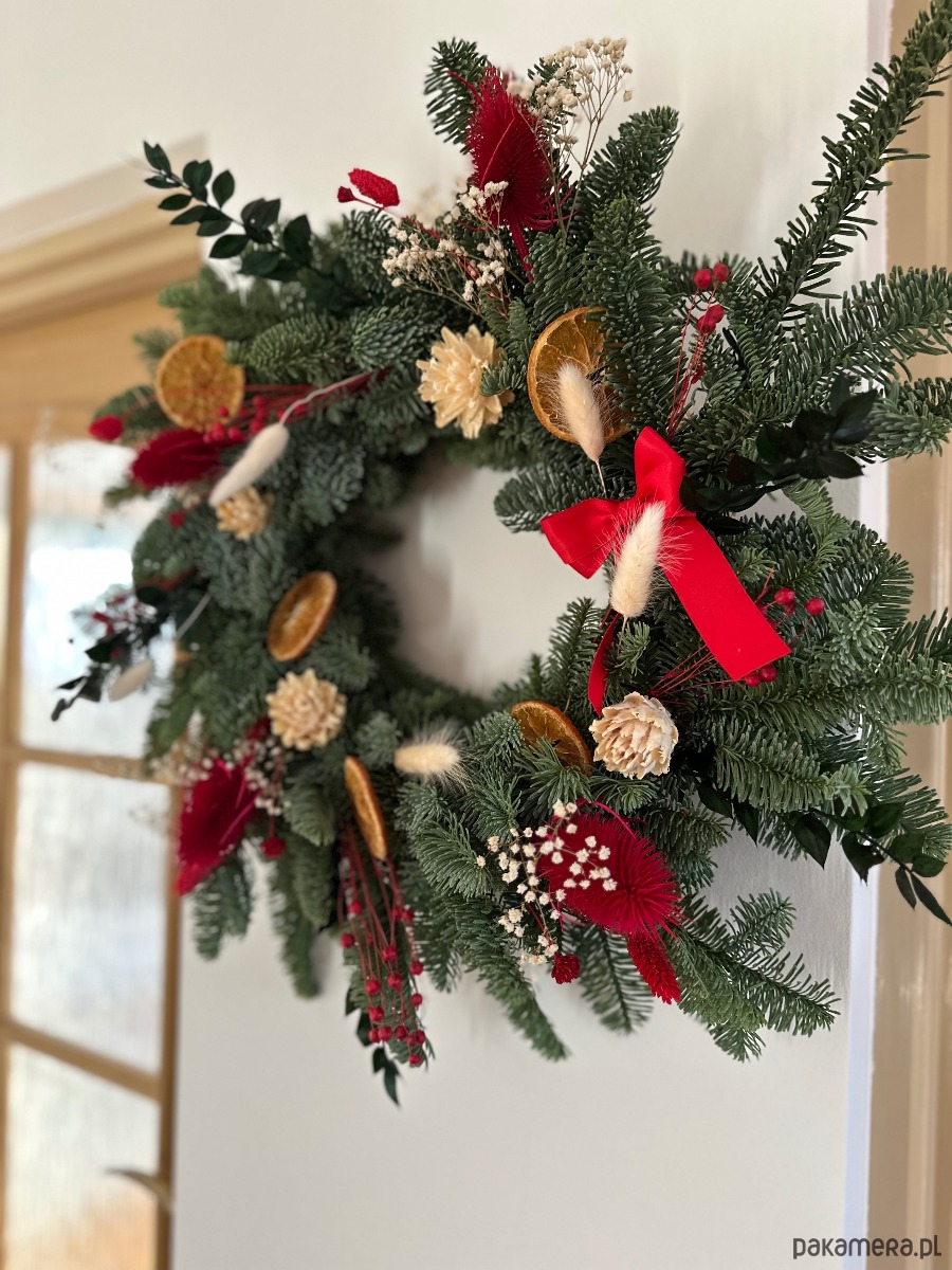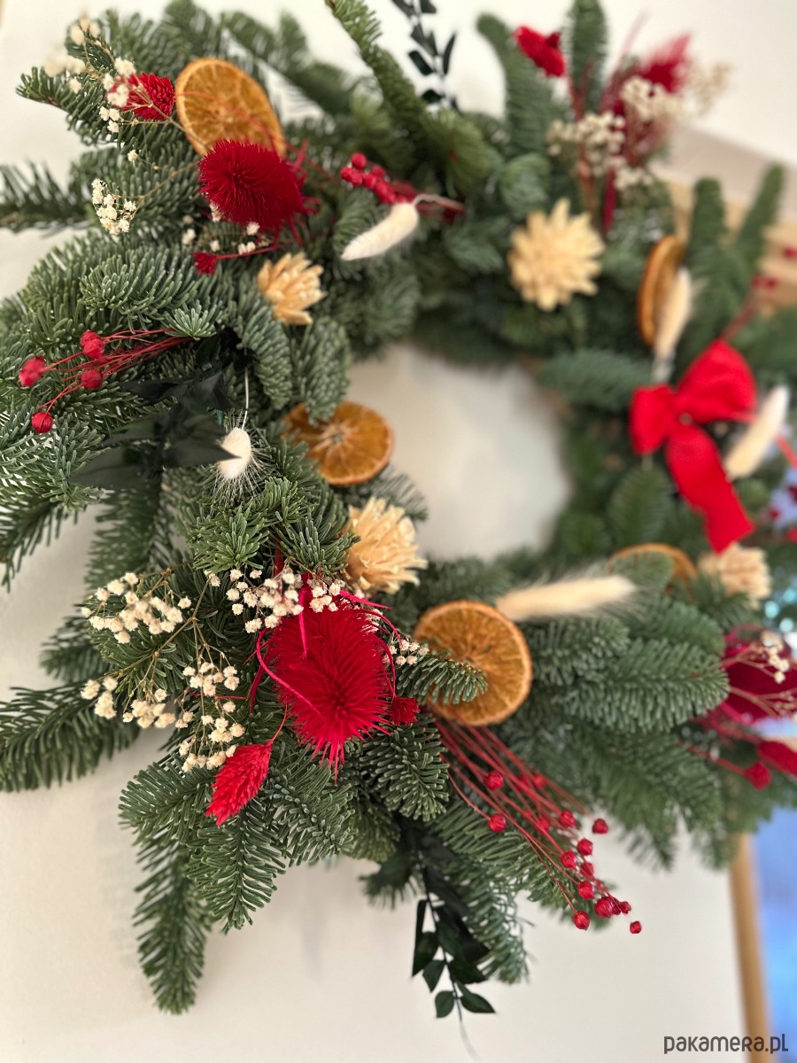 Mamy tutaj jodłę nobilis, gipsowkę, hill flower,kanar, dmuszek, len, oset, szyszki decorum bielone oraz suszone plastry pomarańczy.