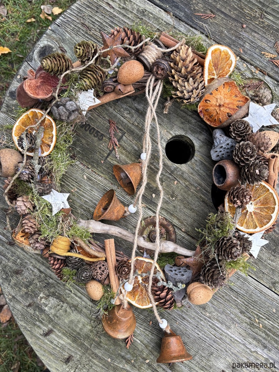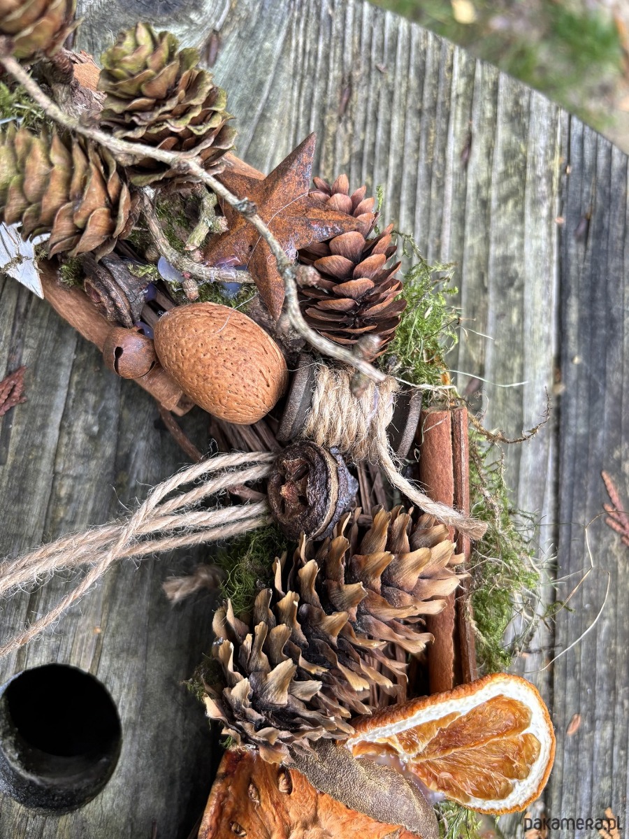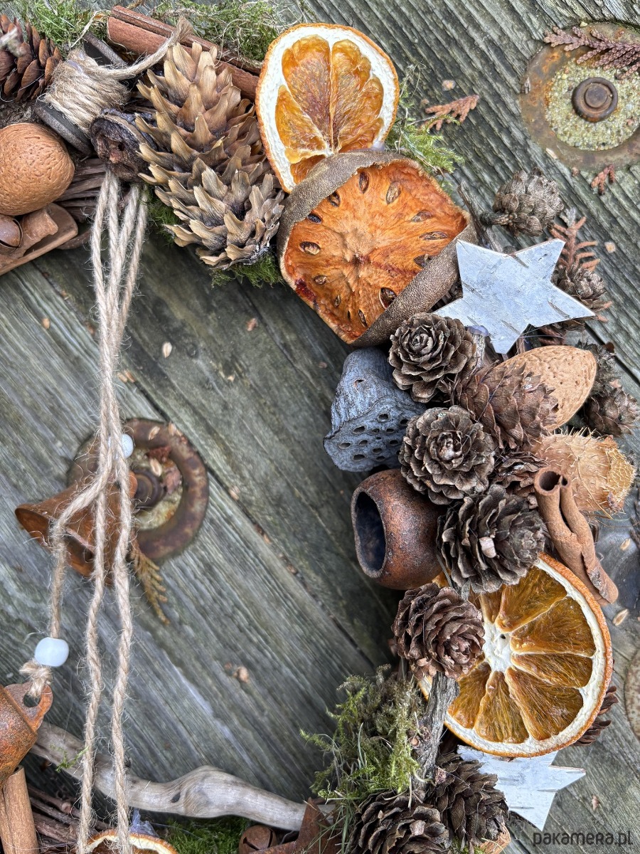 Zimowy naturalny wianek świąteczny udekorowany skarbami natury.