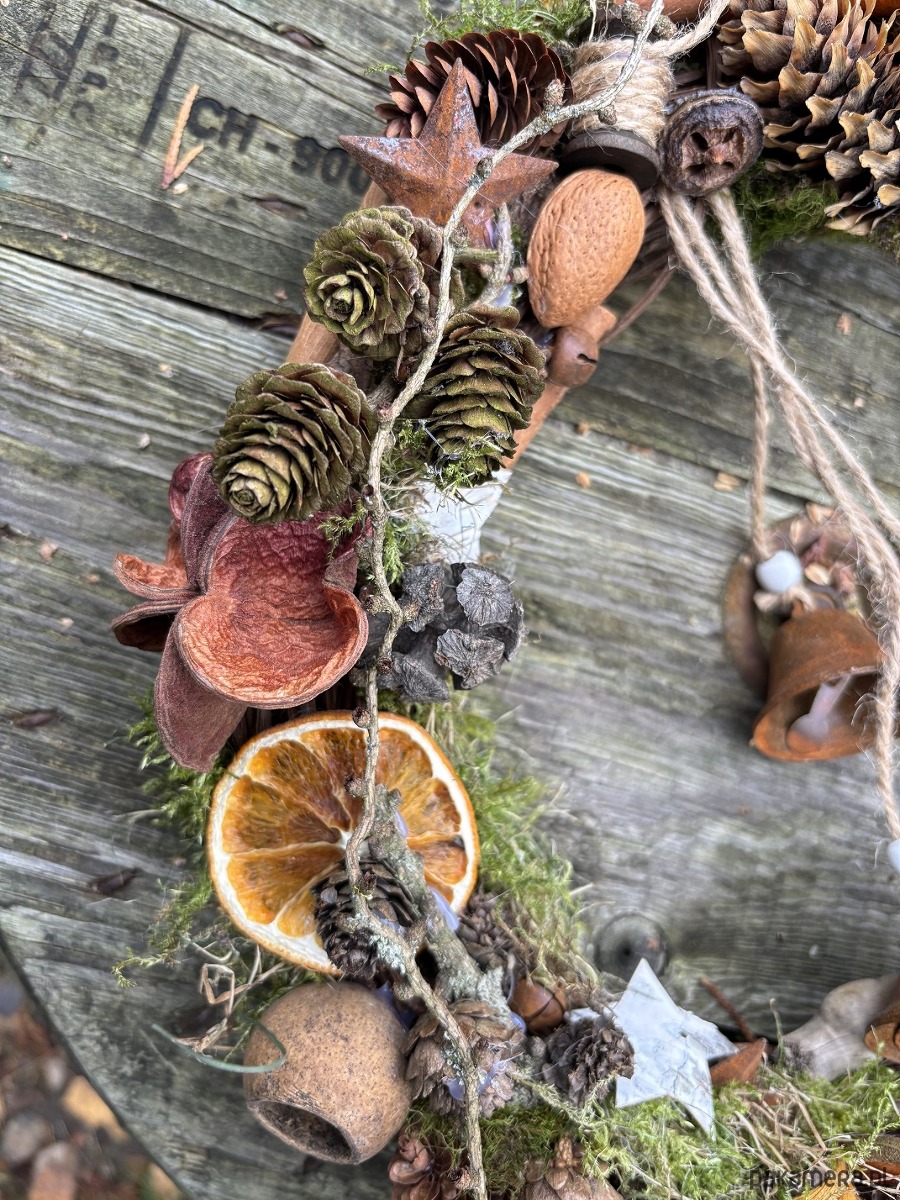 Wianek wykończony jest naturalnym mchem i udekorowany postarzanymi rdzą dzwoneczkami.