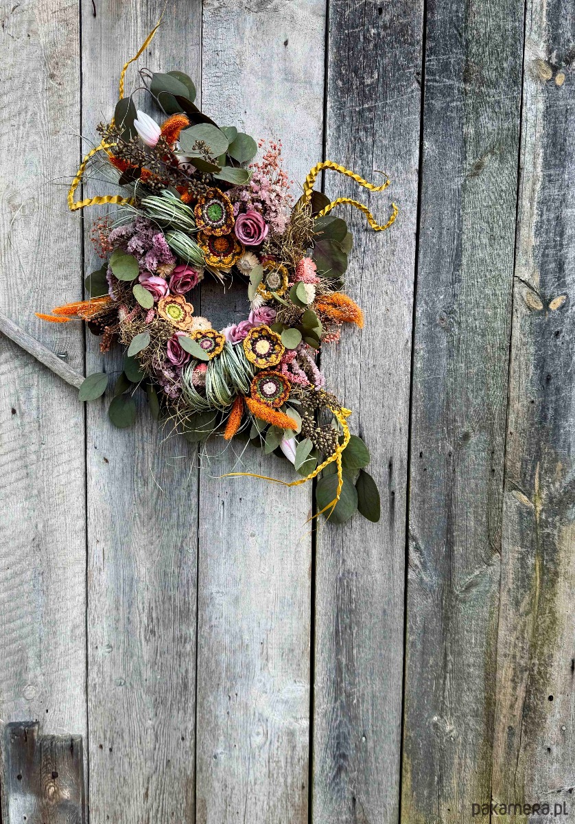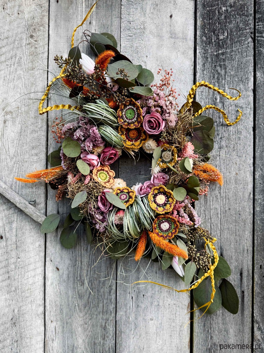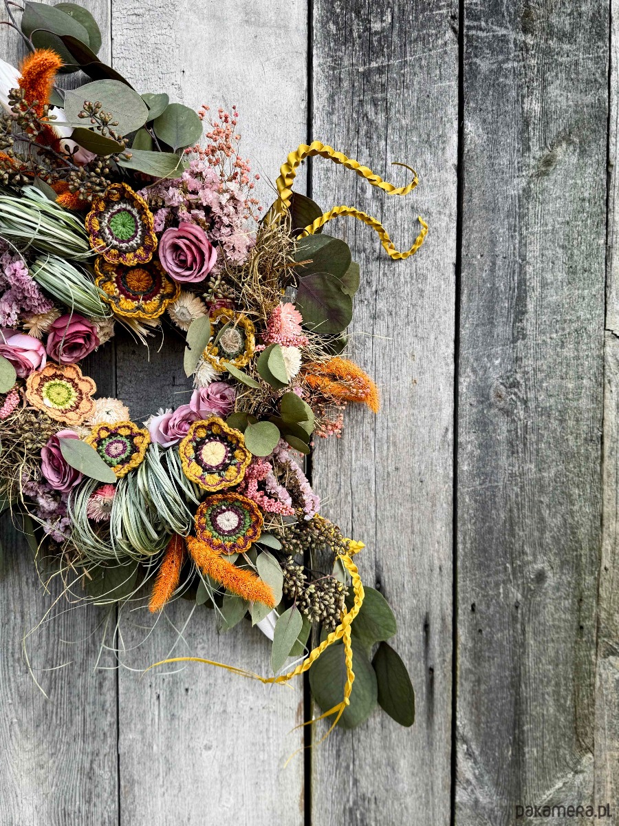 Wianek zrobiony z różności. Trudno będzie mi wszystkie wyliczyć. Znajdziesz w nim m.in.: sztuczne kwiaty, Zatrwian (stabilizowany), Gipsówkę i Eukaliptus (stabilizowane), Kocanki i kwiaty dziergane na szydełku.