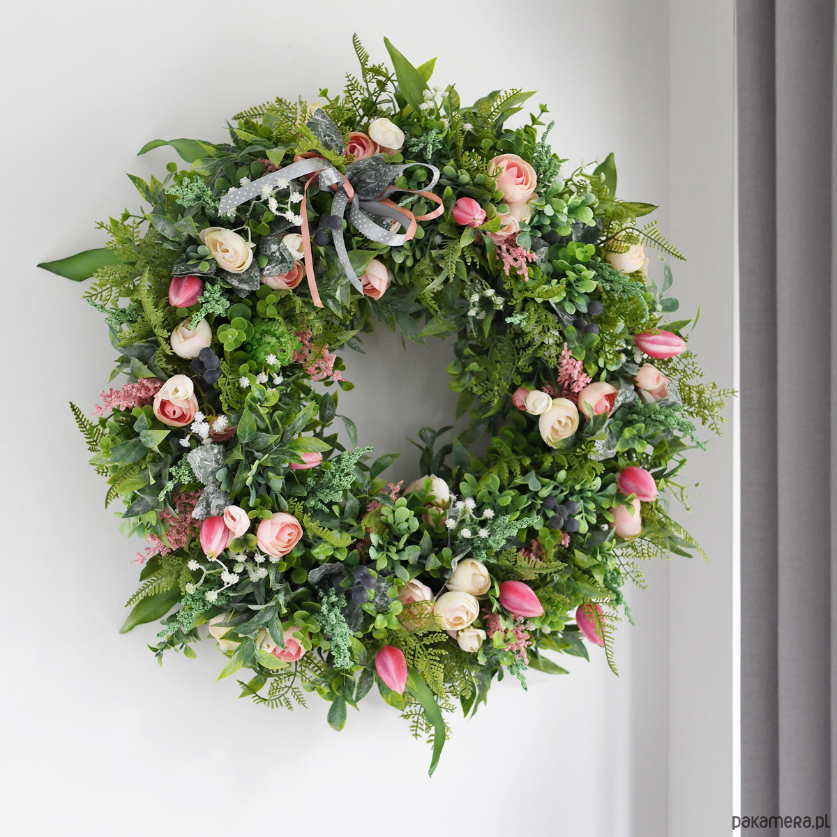 ,Cała miłość do wiosny w jednym wianku: subtelne jasno różowe jaskry, ciemno różowe pąki tulipanów i mnóstwo innych delikatnych kwiatów zwiastujących wiosnę!:) A wszystko w plątaninie świeżo soczystej zieleni.