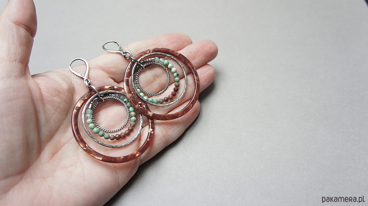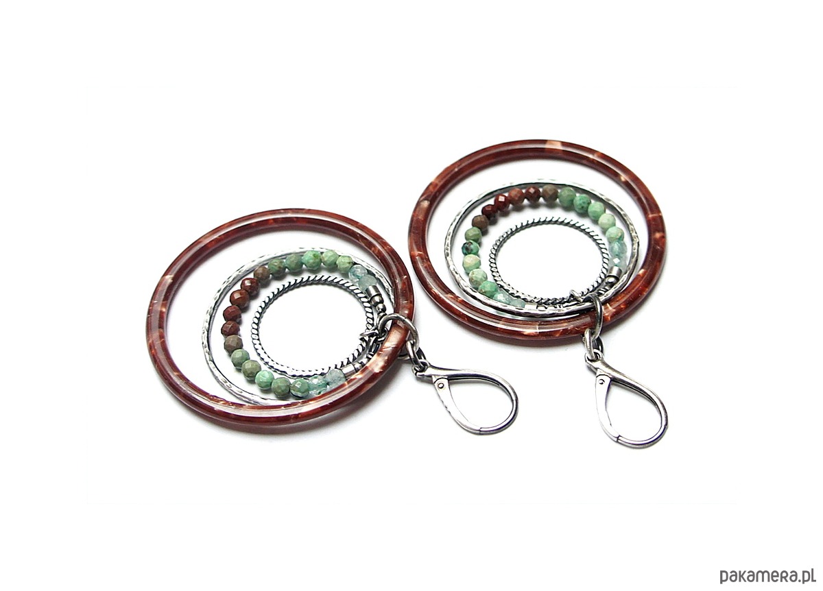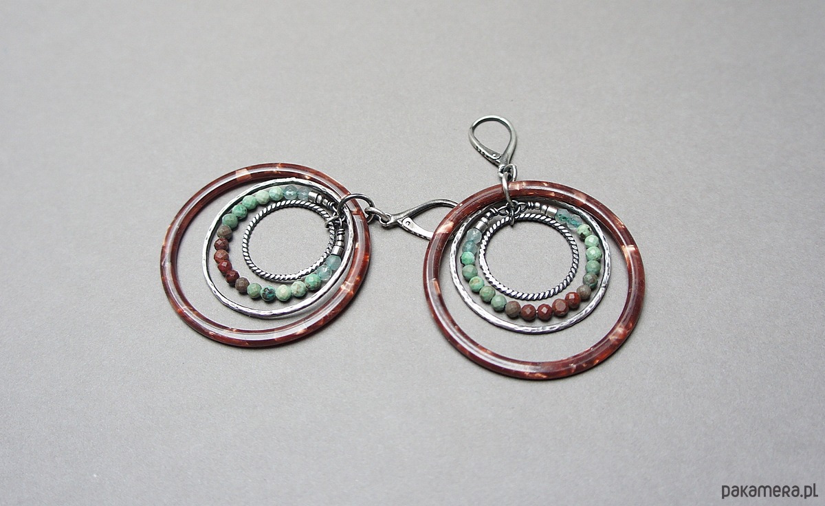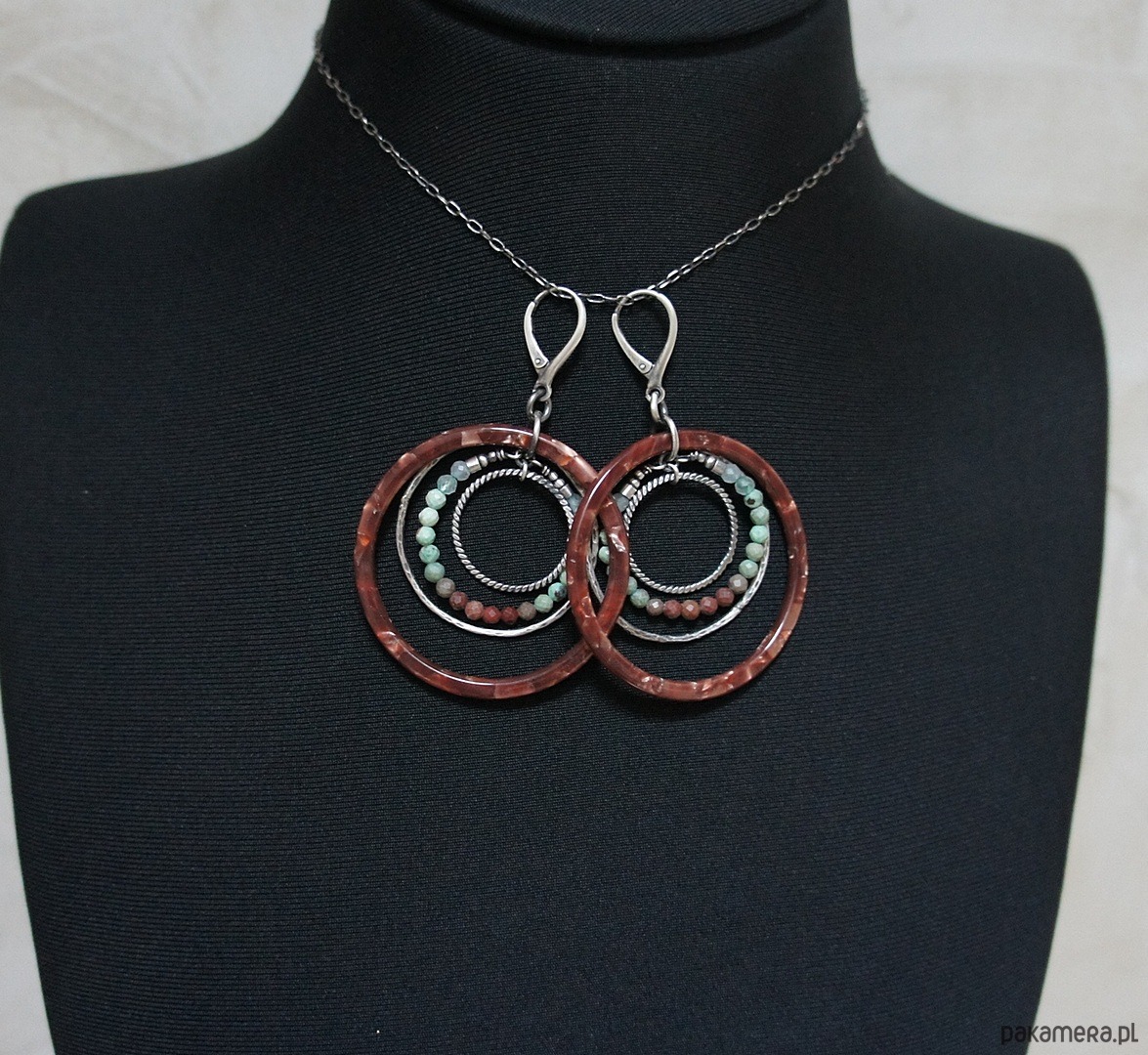 Kolczyki wykonane ze srebra [pr. 925 i 930] w połączeniu z dużymi kołami z żywicy [48mm],fasetowanymi kuleczkami naturalnych turkusów [3mm] . Srebrne koła kute [ śr. 35mm i 21mm] . Srebro oksydowane i przetarte. Całkowita długość kolczyków 7,3 cm. Biżuteria ozdobnie zapakowana
