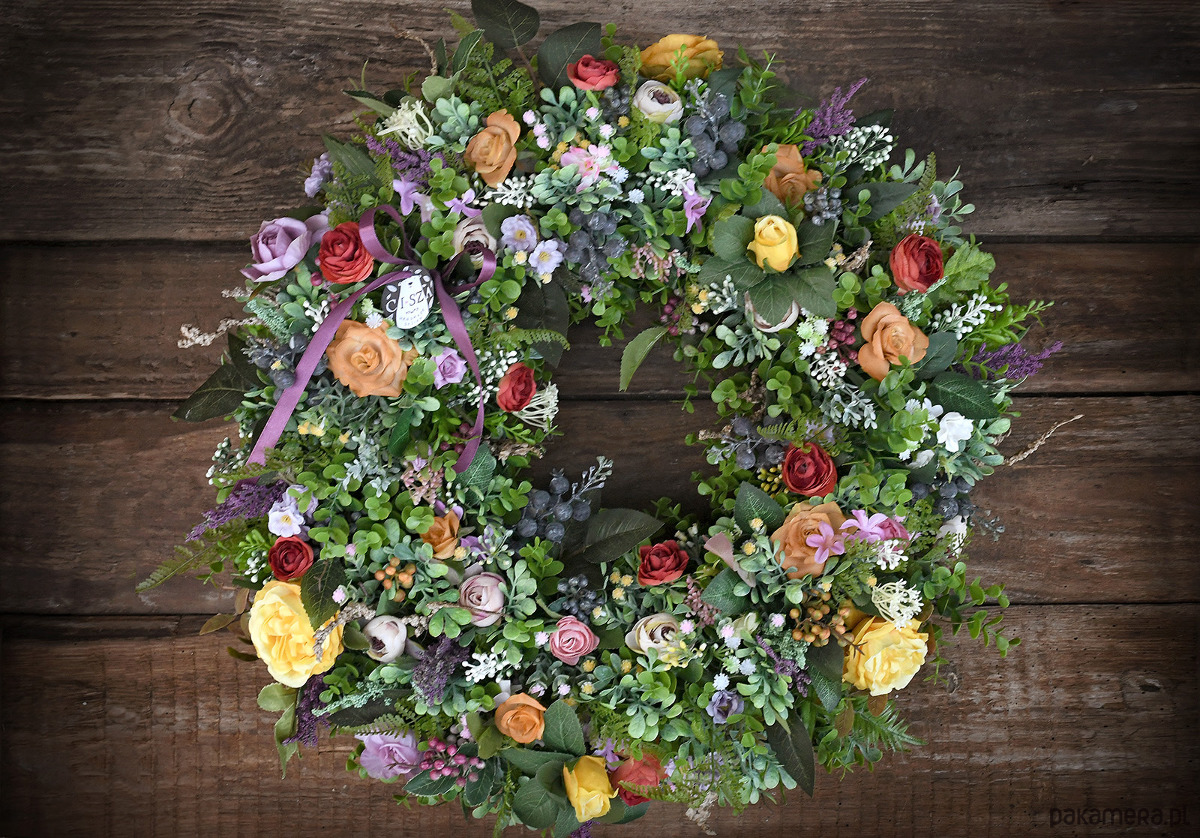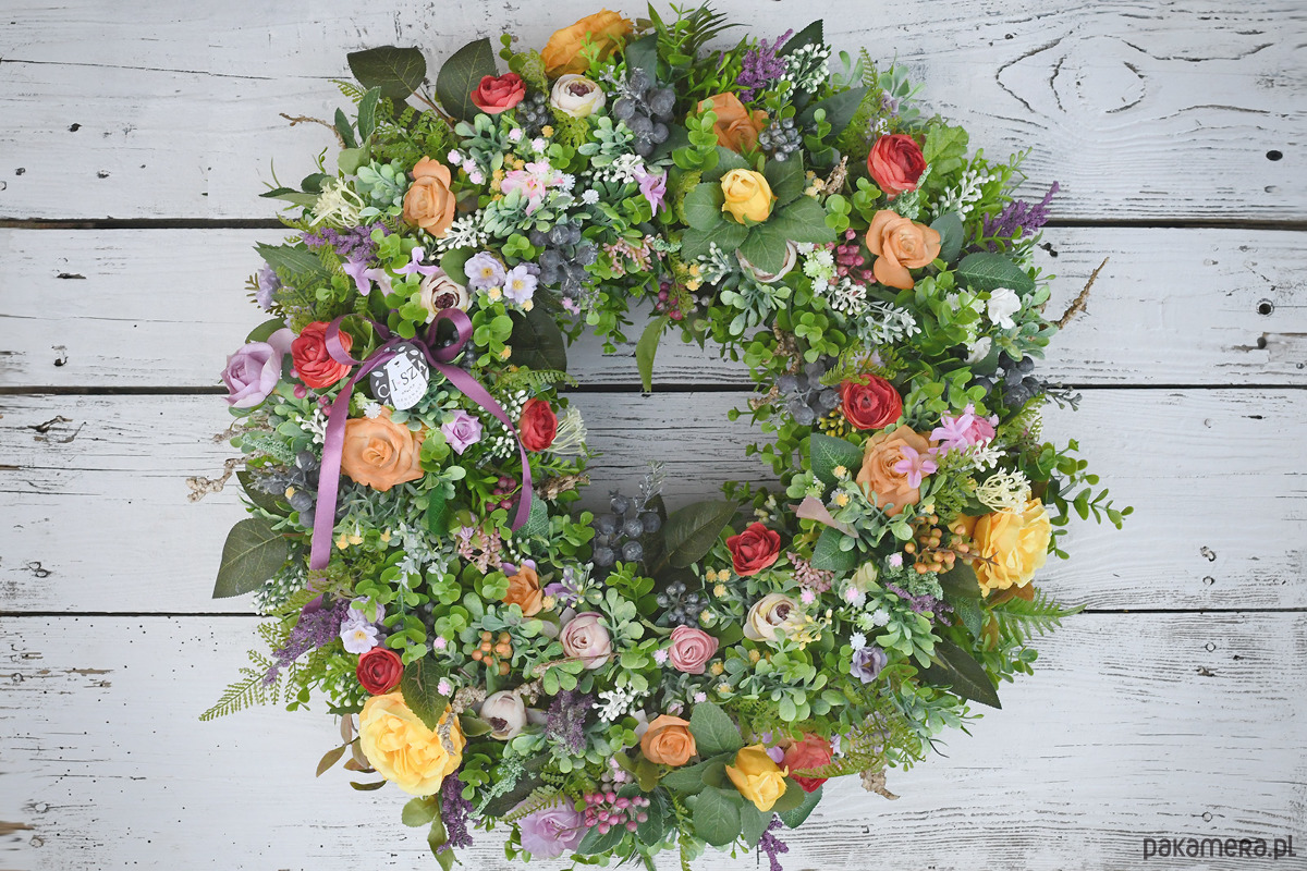 Wianek wykonany ze sztucznych dodatków . Doskonale będzie się prezentował na drzwiach wejściowych.