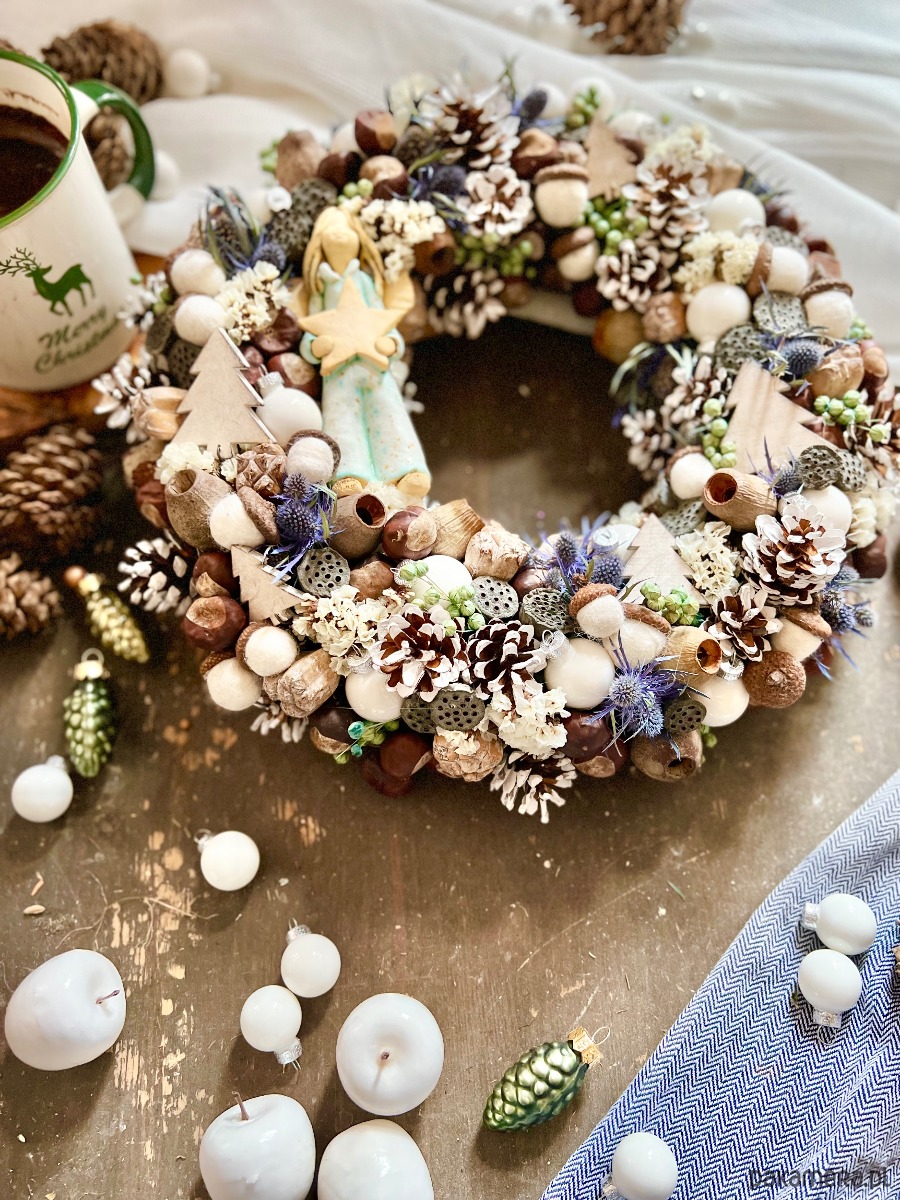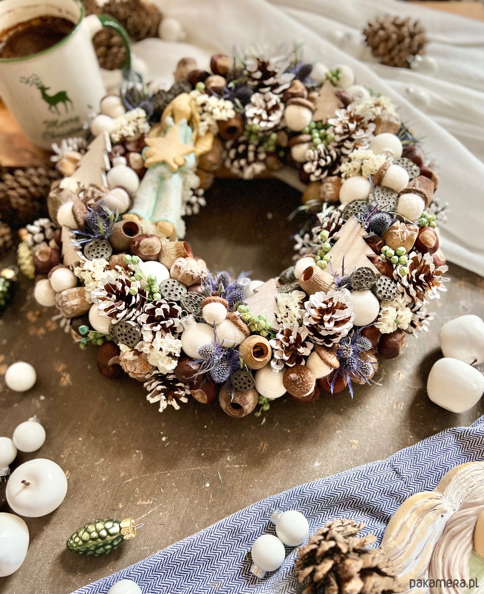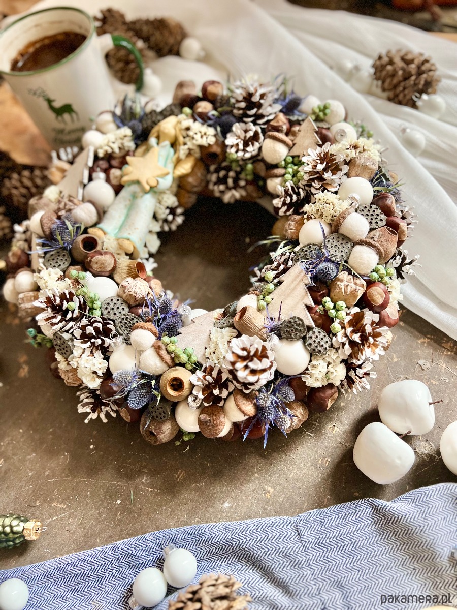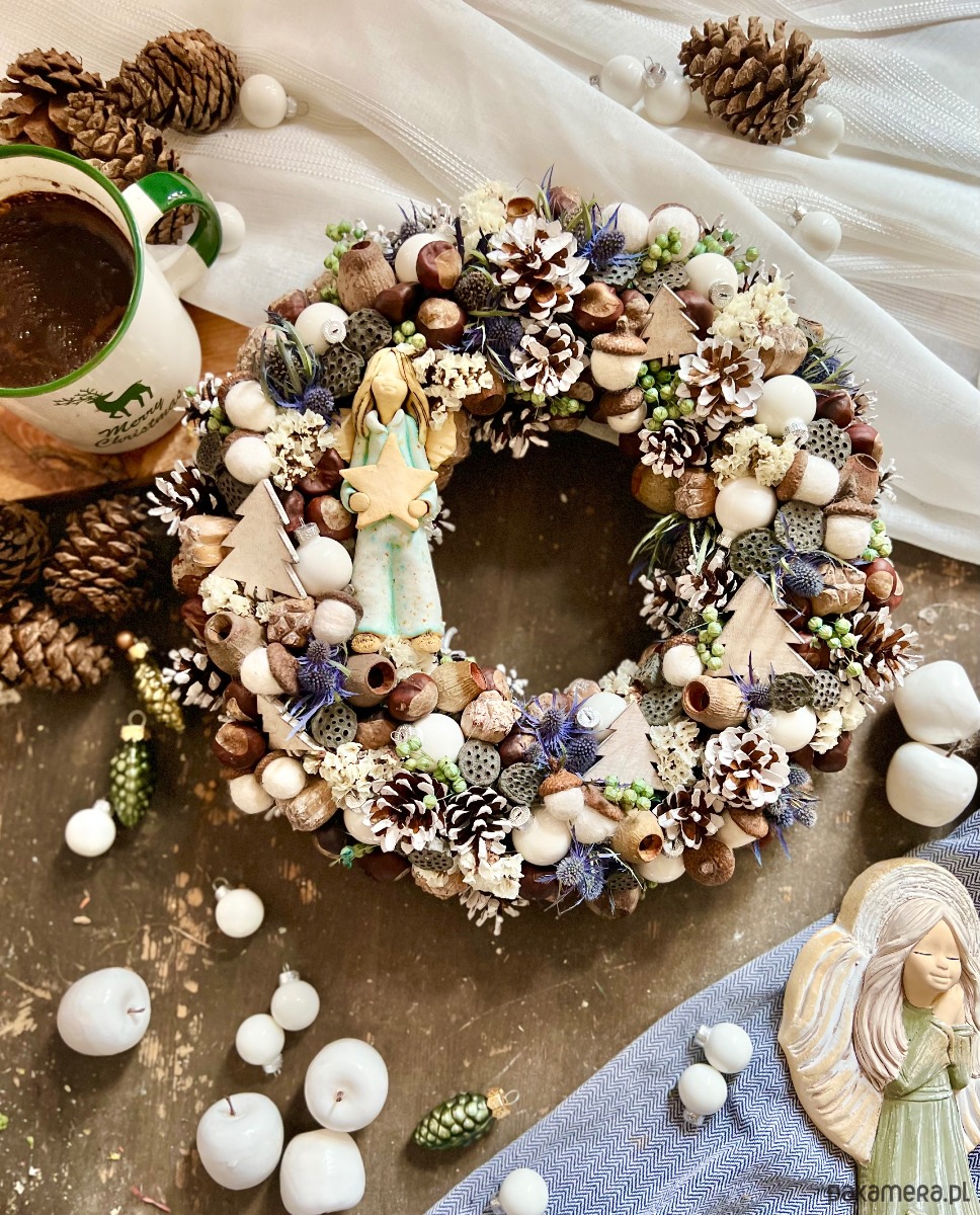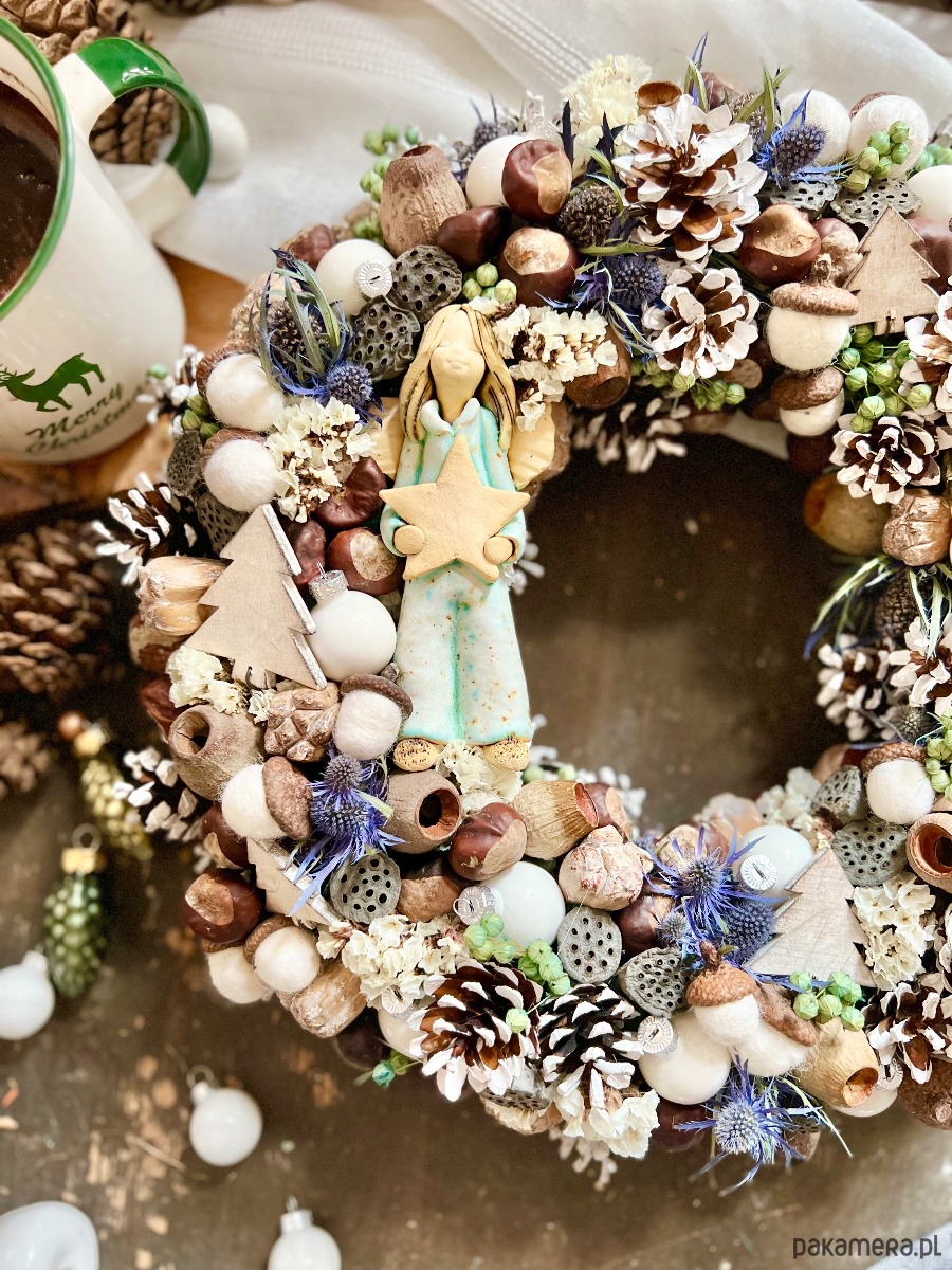 Składniki: gliniany anioł, bombki, szyszki, filcowe żołędzie, lotos, Eryngium, Limonium, kasztany i inne.