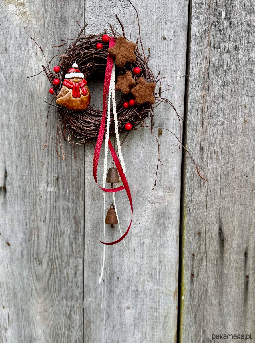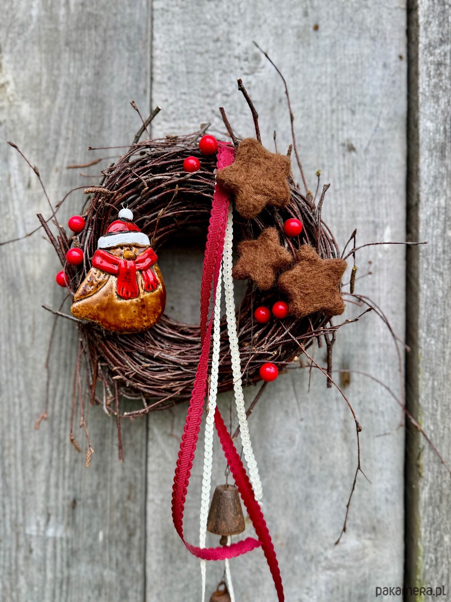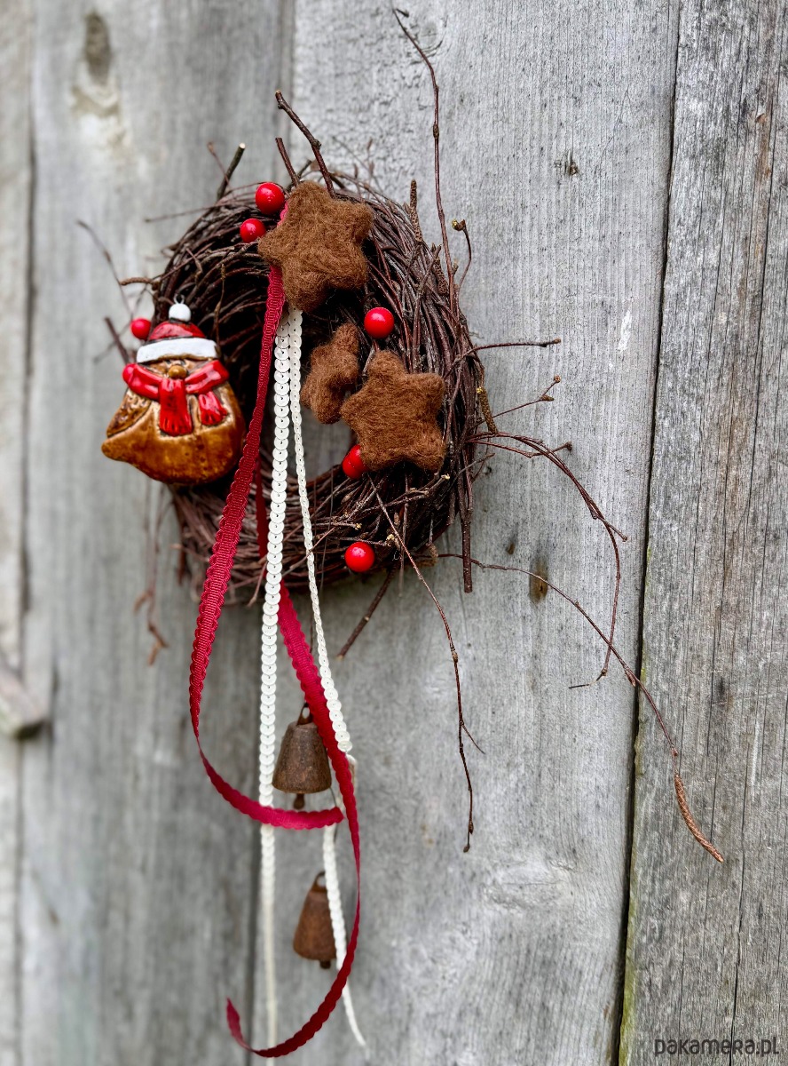 Podstawą jest „gniazdko” uwite z gałęzi Brzozy. Do tego kilka elementów dekoracyjnych - ceramiczny ptaszek, filcowe gwiazdki, styropianowe kulki, dzwonki i tasiemki.