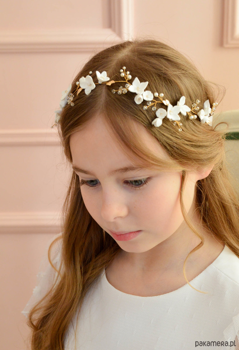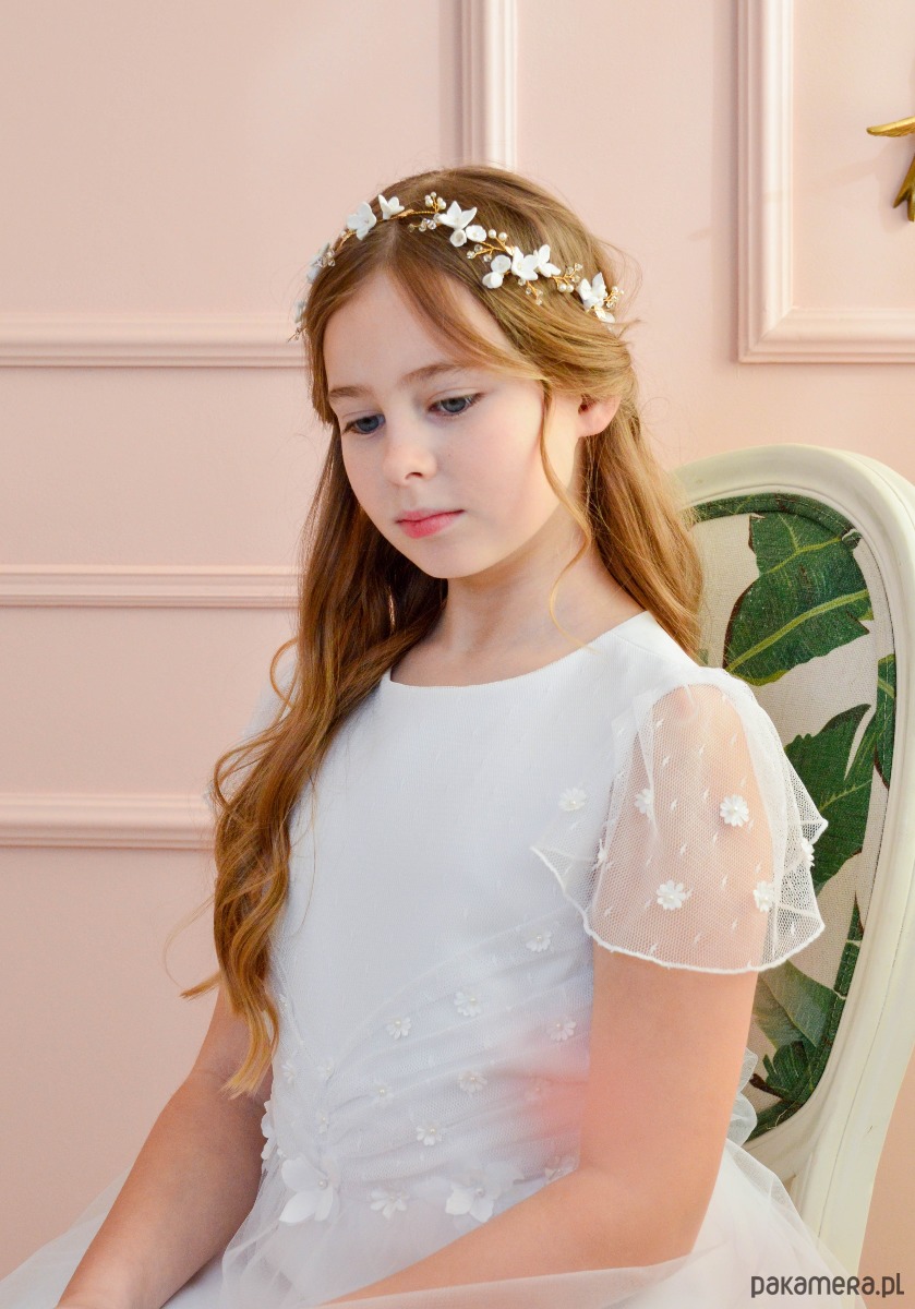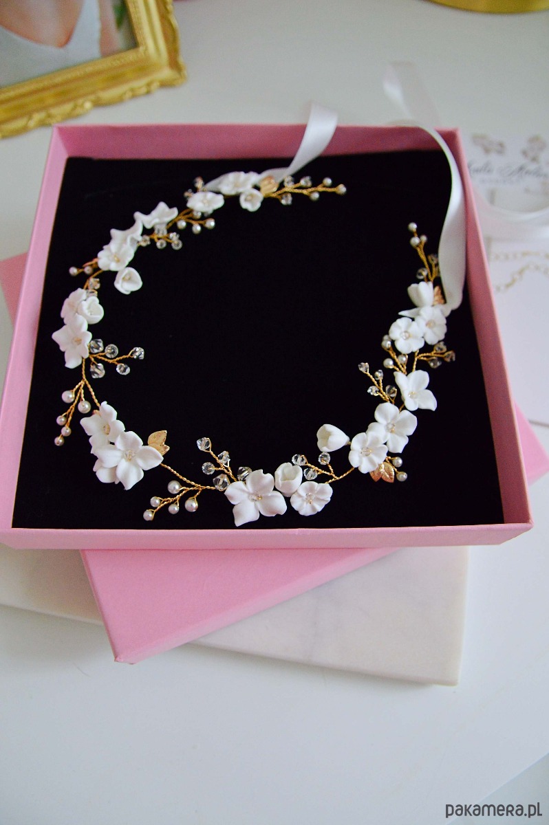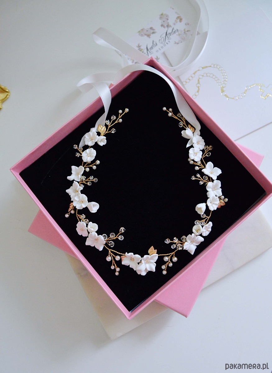 Kwiecisty, bogato zdobiony wianuszek – gałązka. Wykonany z ręcznie formowanych kwiatków, kryształków bezbarwnych Swarovskiego, pereł Preciosa oraz złotych listków. Odcień złoty – miedziany, kwiatki oraz perły w kolorze białym o odcieniu ciepłym. Długość 35 cm. Wianuszek wiązany na dwustronne tasiemki białe szerokości 1 cm. Może być założony z tyłu, a także jako dekoracja warkocza czy upięcia.