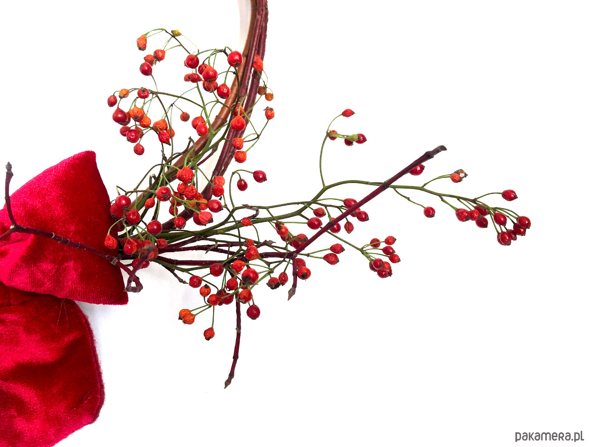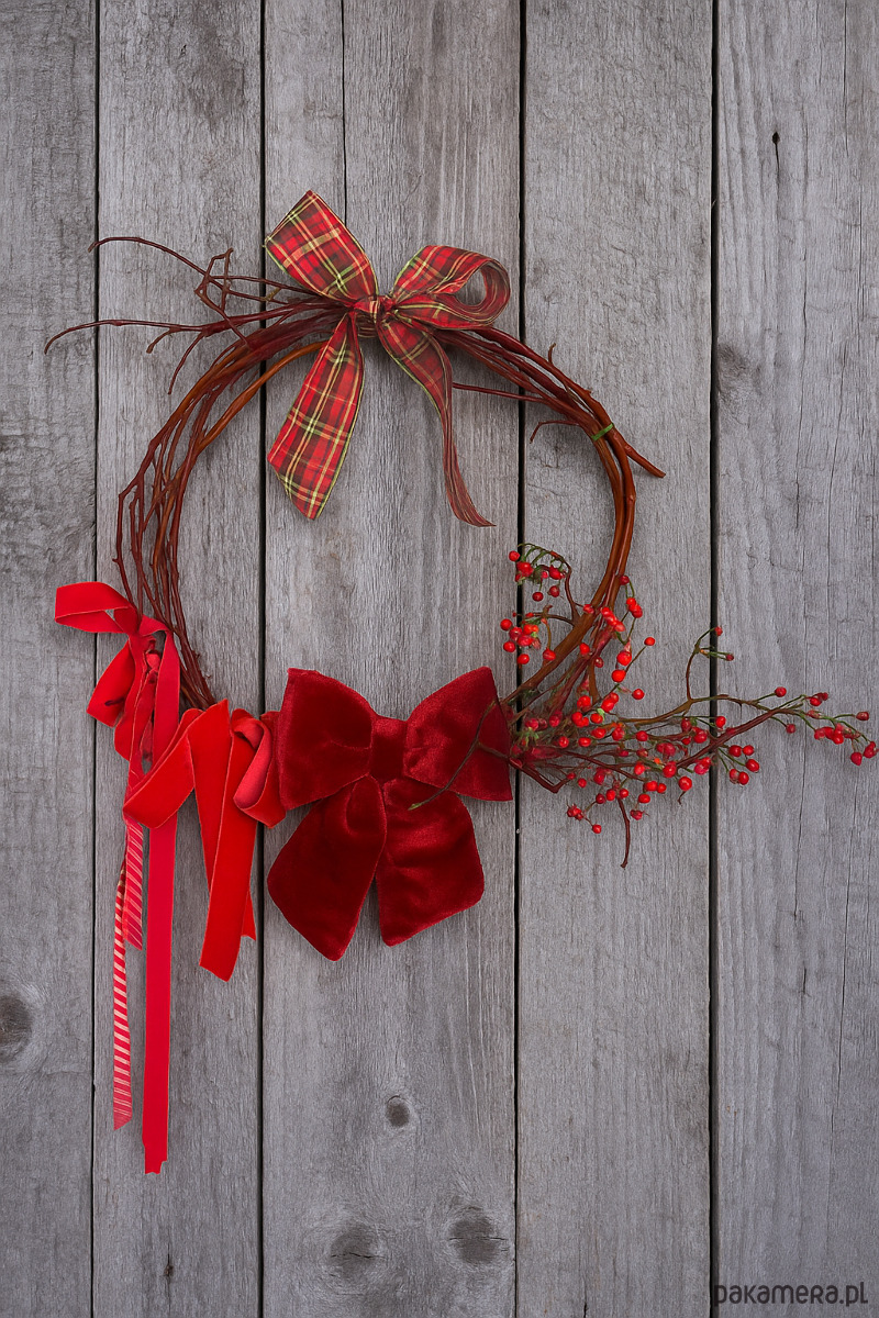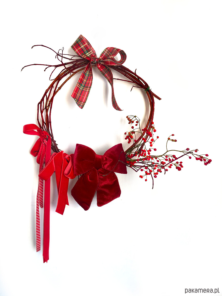 Minimalistyczny świąteczny wianek stworzony z czerwonych gałązek derenia i dzikiej róży. Doceniamy piękno tych prostych elementów natury, dlatego jest w nim nie dużo komponentów. Zachwycamy się każdym patyczkiem i witką! Motywem przewodnim są tu kokardy z weluru, w paski i w szkocką kratkę, które w tym sezonie dominuje w światowych trendach świątecznych. Elementem ozdobnym są gałązki dzikiej róży. Wianek zakomponowany jest asymetrycznie i utrzymany w czerwonej kolorystyce. Każdy nasz wianek powstaje z ekologicznych materiałów, wszystkie gałązki pochodzą z cięć sanitarnych krzaków i drzew naszego ogrodu. Każdy wianek ma drucik, lub kokardkę do powieszenia. Wianek może ozdobić Twoje drzwi, okno lub ścianę. Solidna podstawa z derenia, pozwala na użycie jej do własnej kompozycji w przyszłości :) Wymiary: 40 x 40 cm