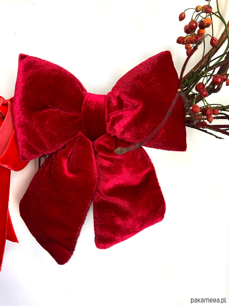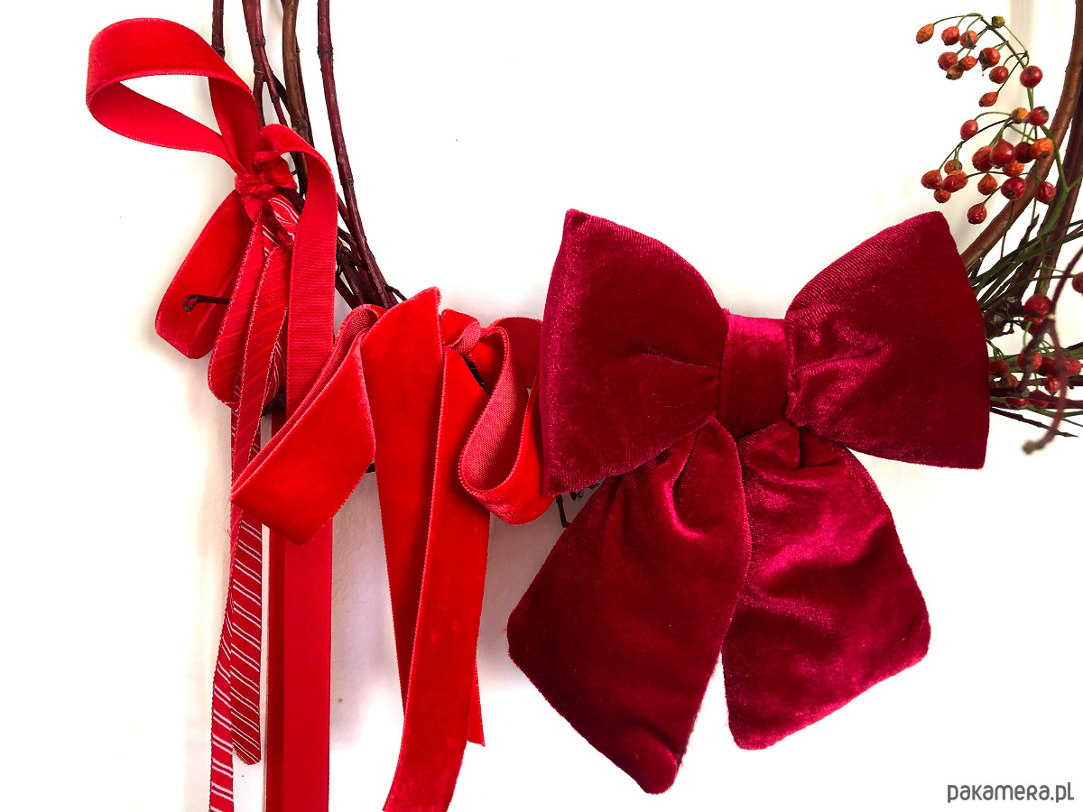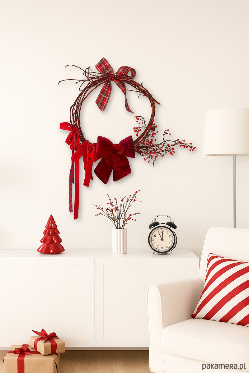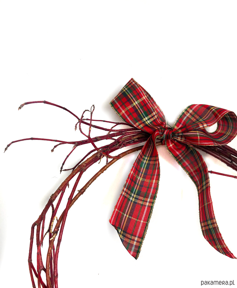Minimalistyczny świąteczny wianek stworzony z czerwonych gałązek derenia i dzikiej róży. Doceniamy piękno tych prostych elementów natury, dlatego jest w nim nie dużo komponentów. Zachwycamy się każdym patyczkiem i witką! Motywem przewodnim są tu kokardy z weluru, w paski i w szkocką kratkę, które w tym sezonie dominuje w światowych trendach świątecznych. Elementem ozdobnym są gałązki dzikiej róży. Wianek zakomponowany jest asymetrycznie i utrzymany w czerwonej kolorystyce. Każdy nasz wianek powstaje z ekologicznych materiałów, wszystkie gałązki pochodzą z cięć sanitarnych krzaków i drzew naszego ogrodu. Każdy wianek ma drucik, lub kokardkę do powieszenia. Wianek może ozdobić Twoje drzwi, okno lub ścianę. Solidna podstawa z derenia, pozwala na użycie jej do własnej kompozycji w przyszłości :) Wymiary: 40 x 40 cm