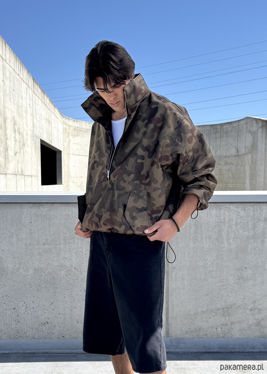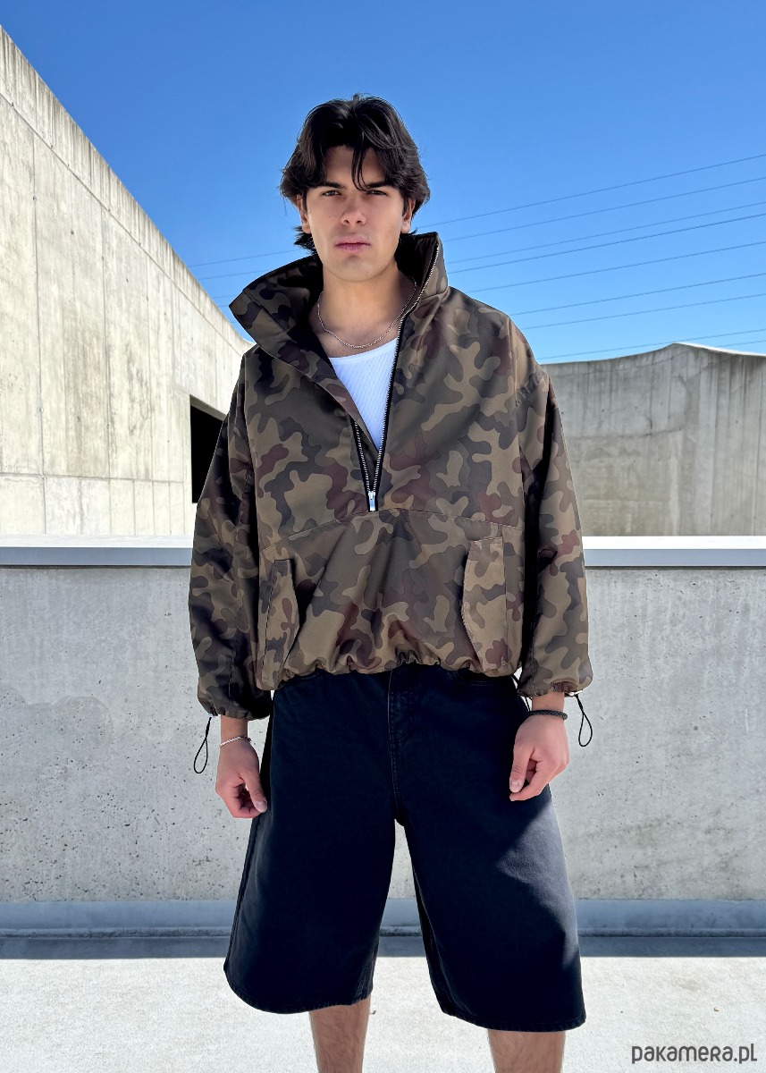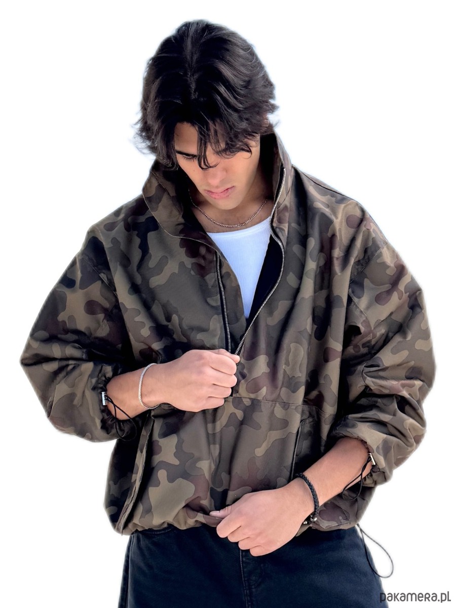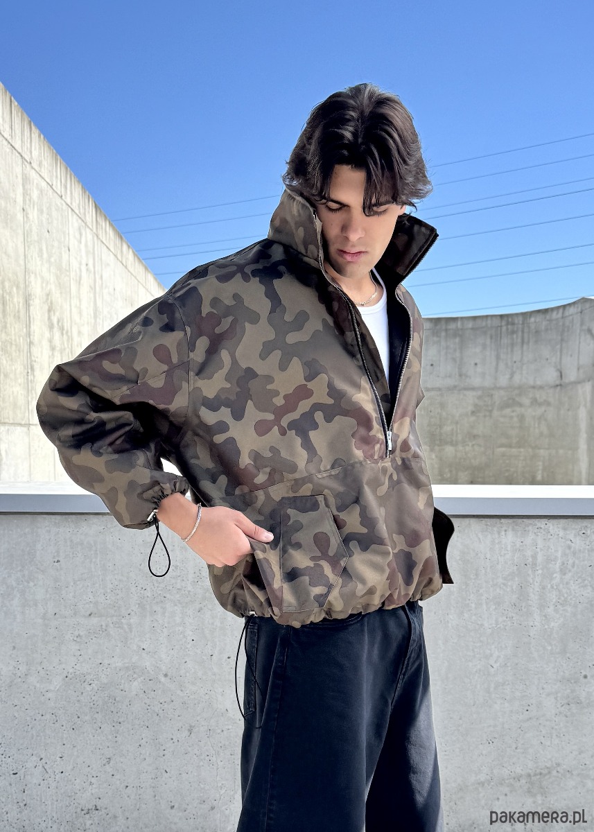 Mocno oversiz'owa kurtka wykonana z przeciwdeszczowej tkaniny w print camo, zapinana na metalowy zamek z charakterystyczną patką
