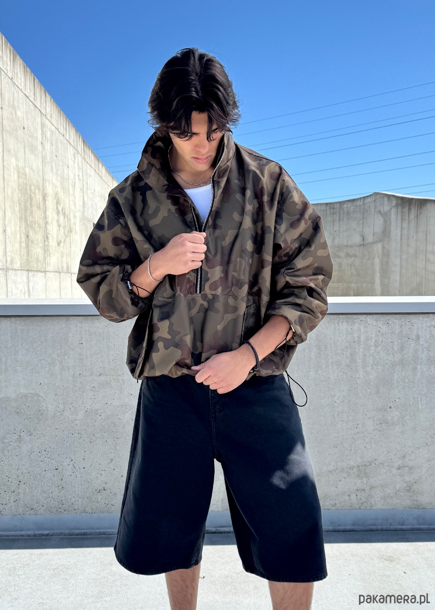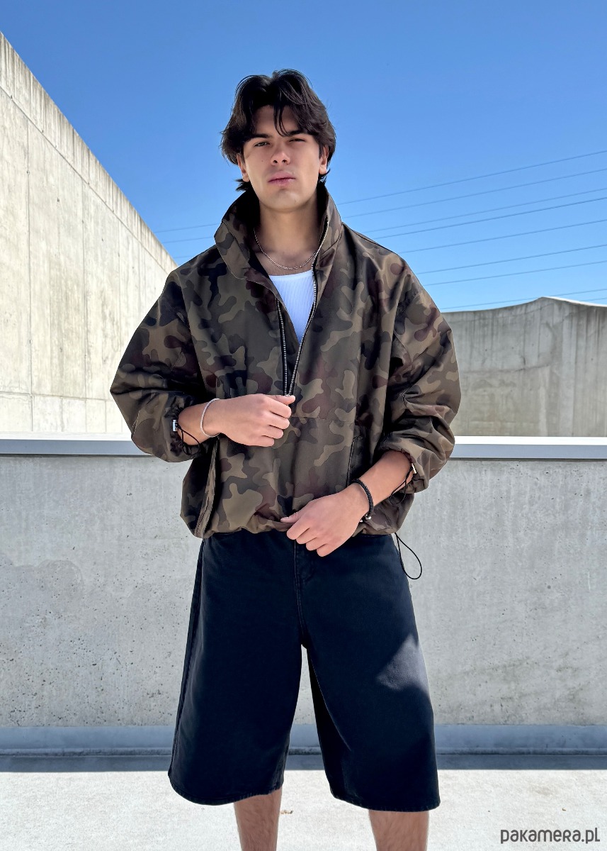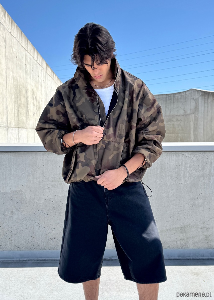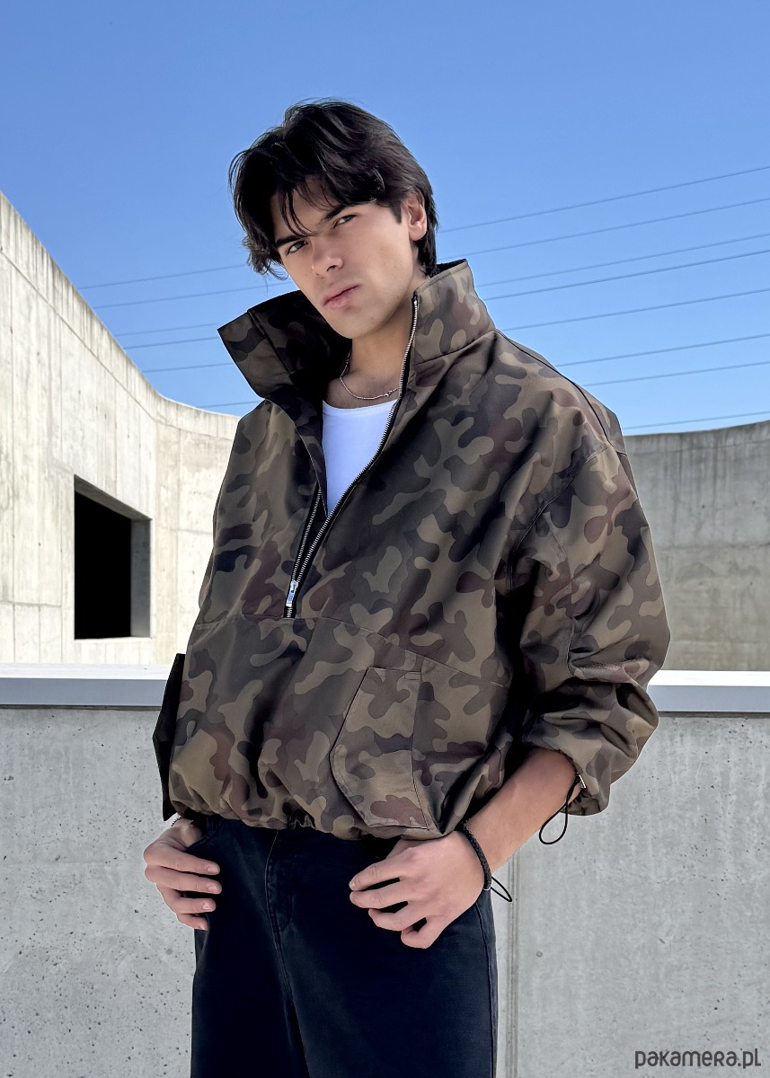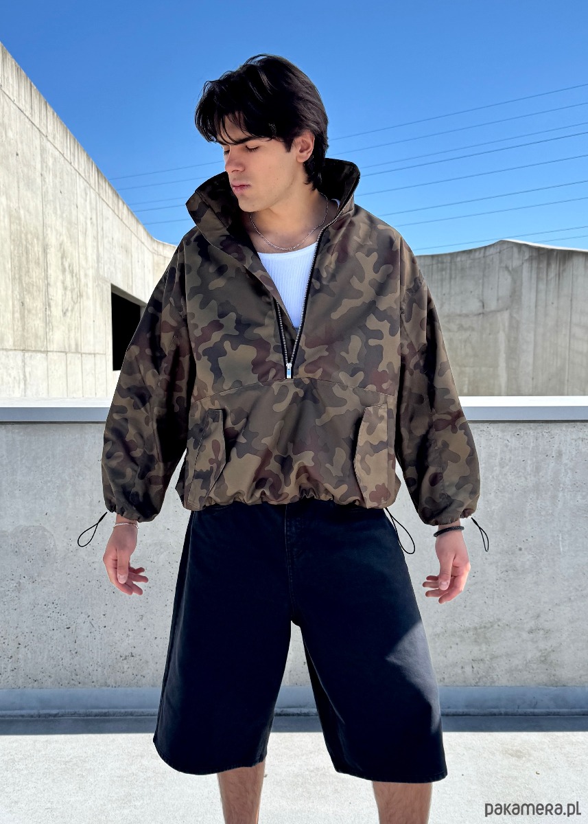 Mocno oversiz'owa kurtka wykonana z przeciwdeszczowej tkaniny w print camo, zapinana na metalowy zamek z charakterystyczną patką