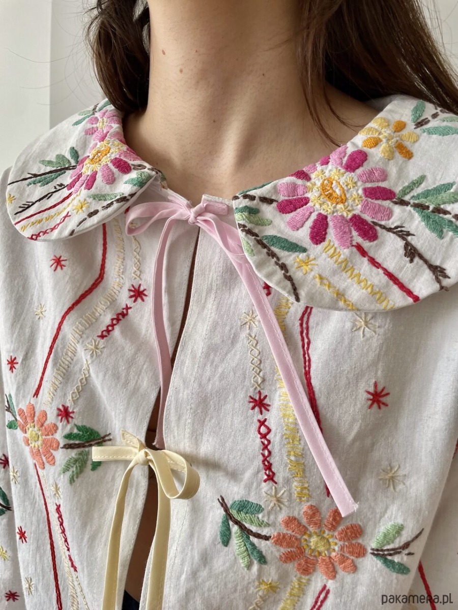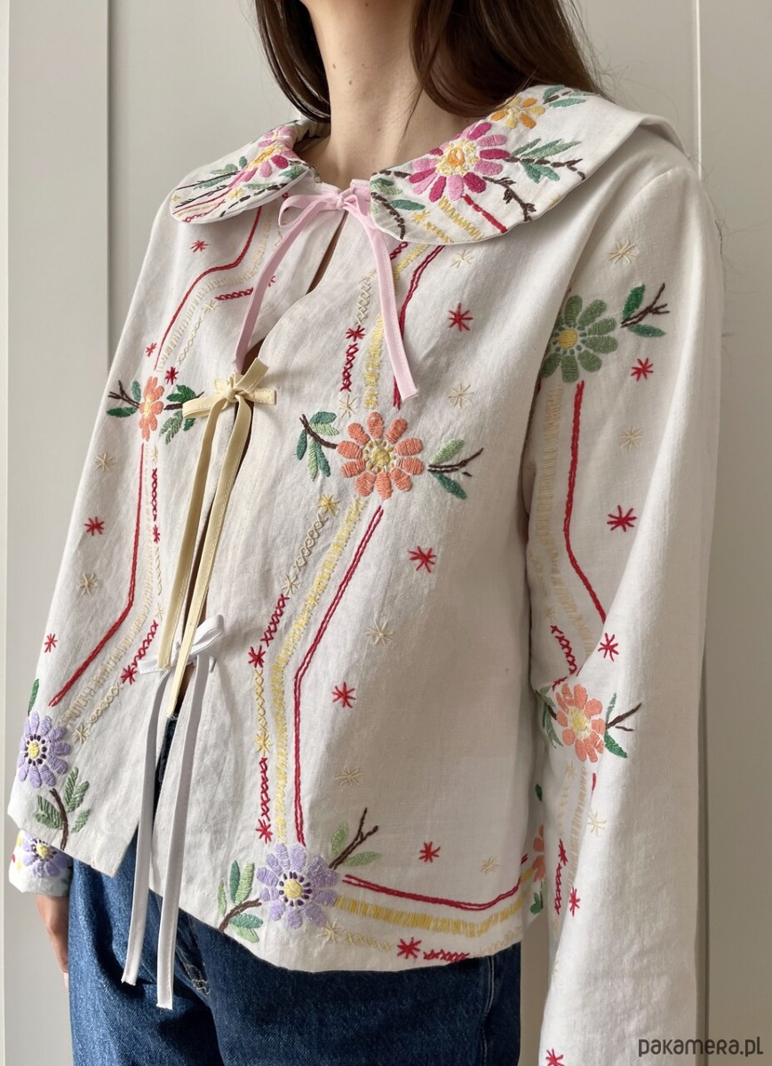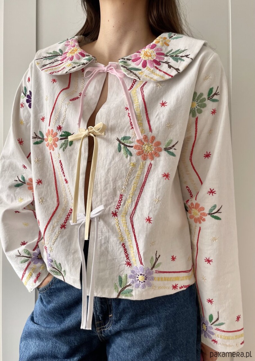 Bluzka w haftowane kwiaty wiązana z przodu na trzy kokardki.