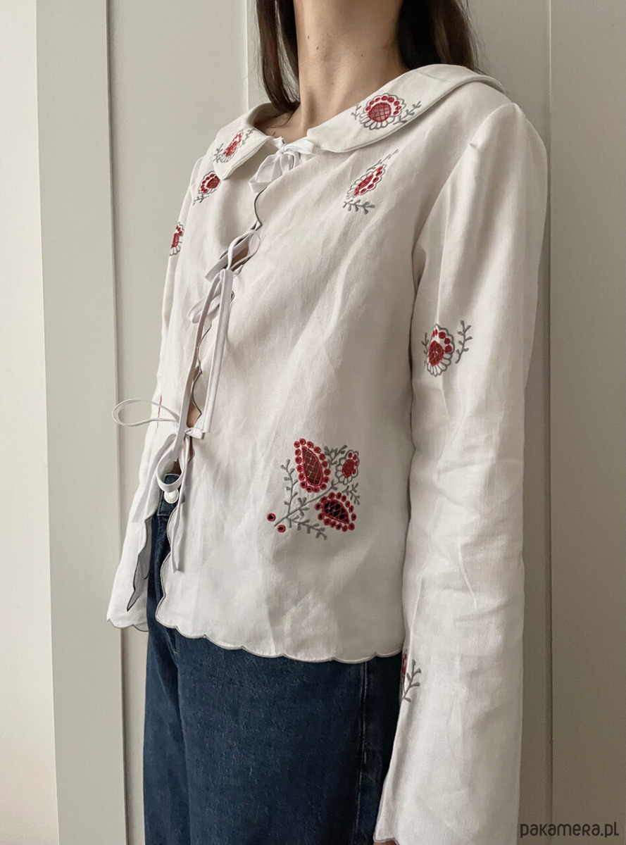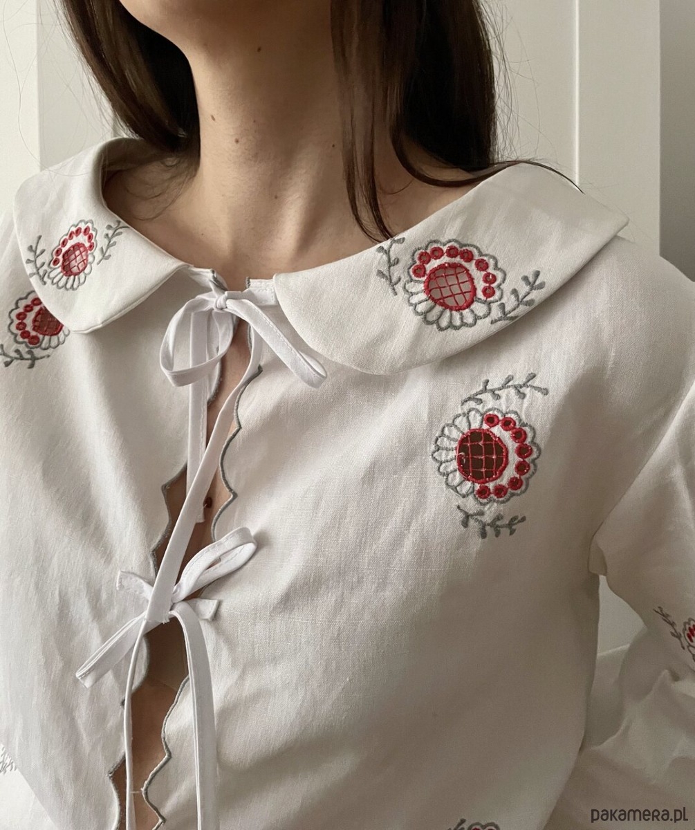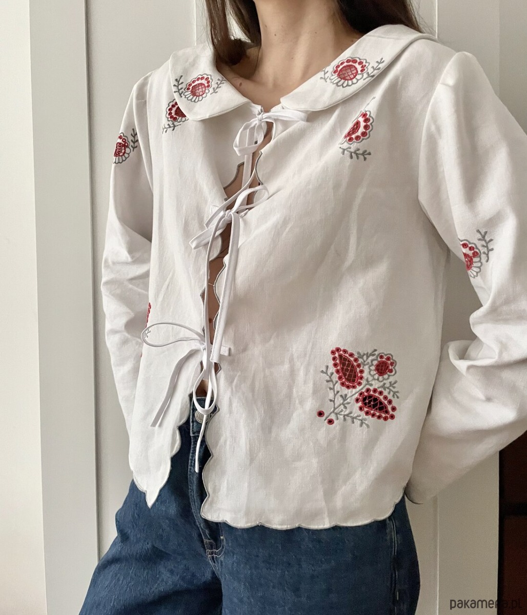 Bluzka w haftowane ażurowe kwiaty o pudełkowym kroju, wiązana z przodu na trzy kokardki.