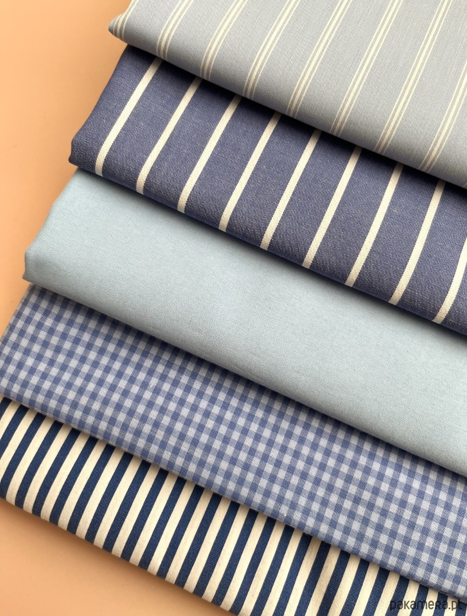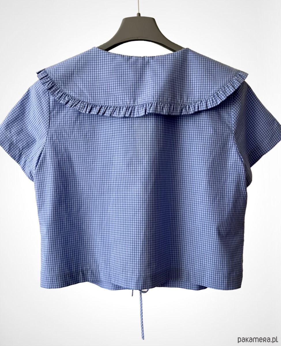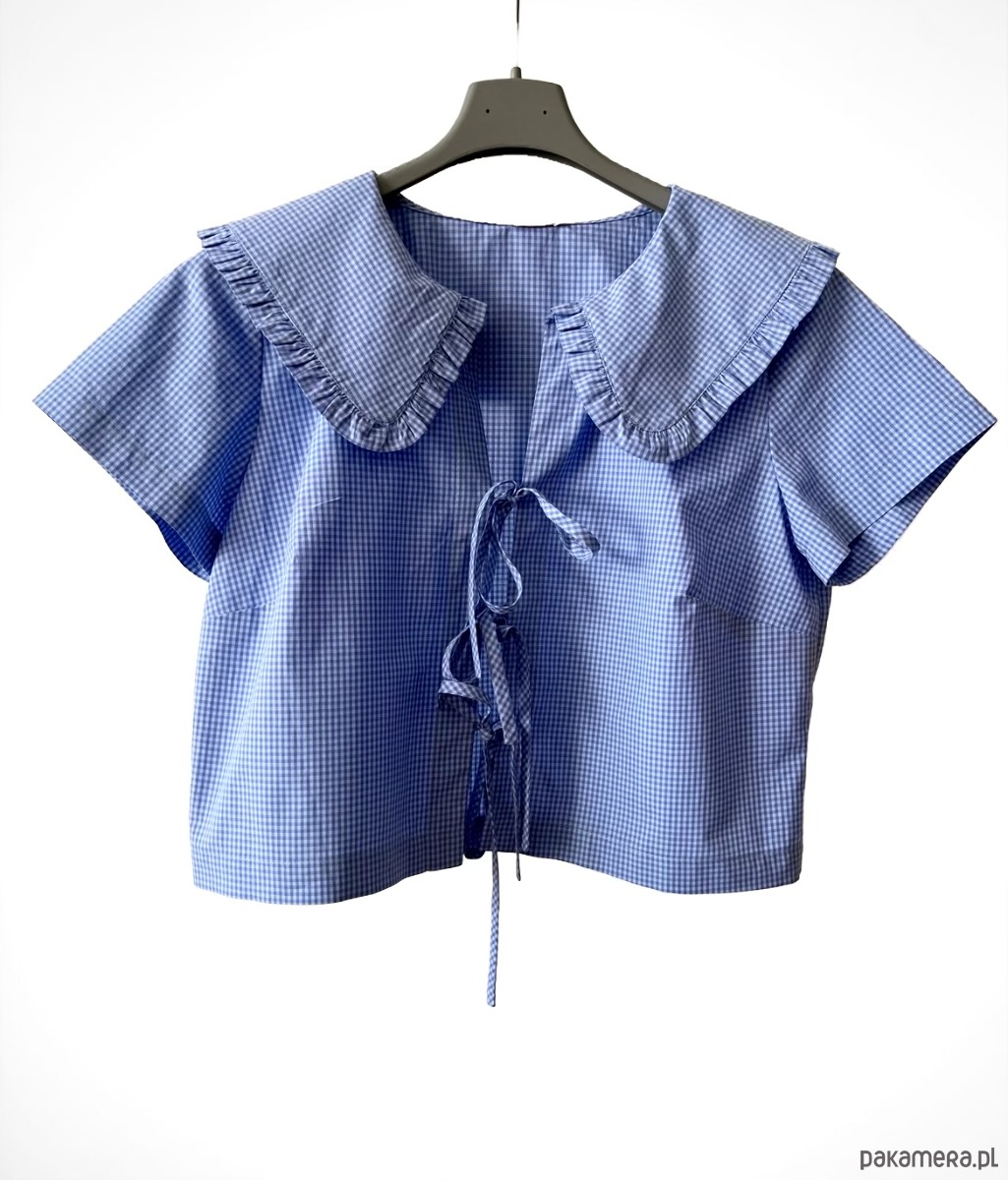 Kobieca, bawełniana bluzka uszyta z tkaniny w niebiesko-białą kratkę. Przyciąga uwagę efektownym, szerokim kołnierzykiem wykończonym subtelną falbanką oraz dekoracyjnym wiązaniem z przodu. Krótki rękaw i lekko pudełkowy krój nadają jej swobodny, ale elegancki charakter.