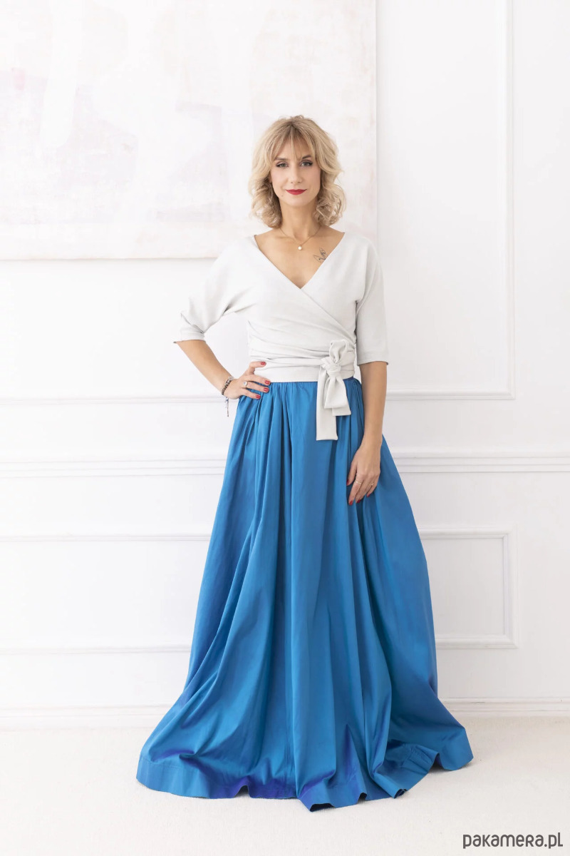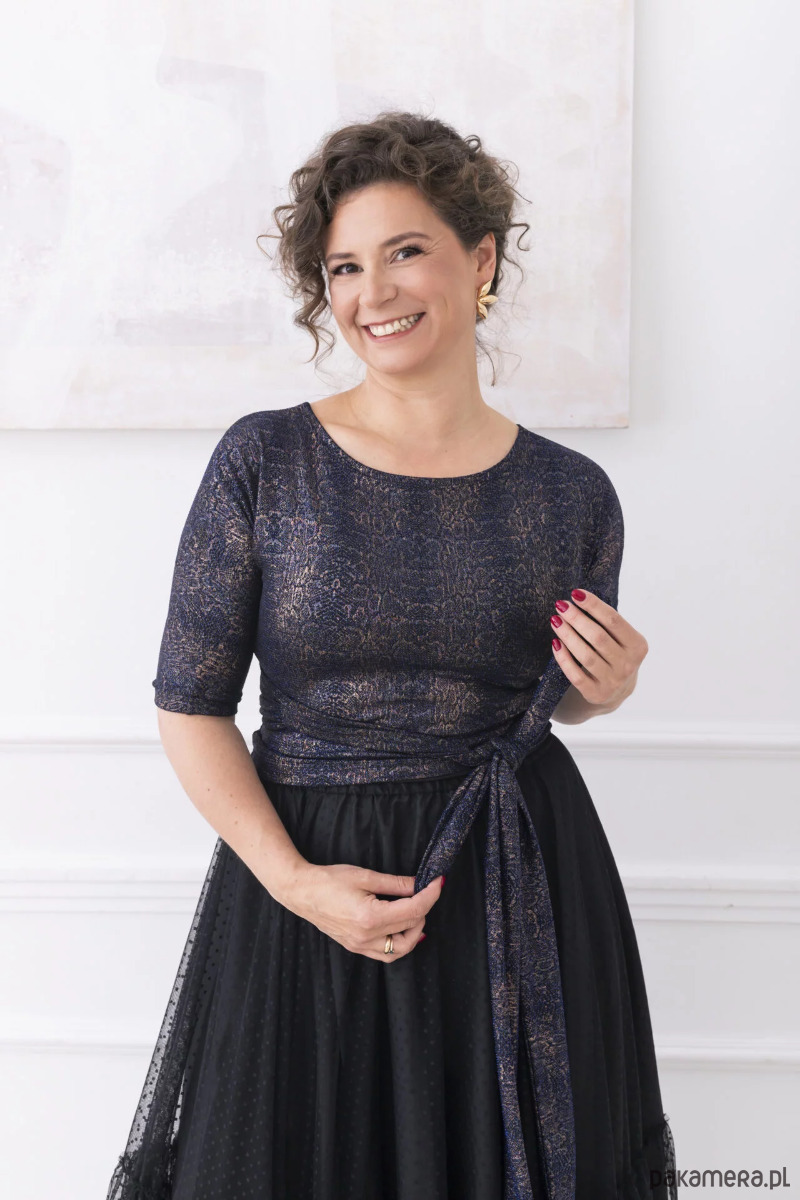 To najbardziej wieczorowa wersja dwustronnej bluzki — dzięki dodatkowi srebrnych, złotych i platynowych włókien możesz zapomnieć o biżuterii. Jej błysk ozdobi każdą uroczystość. Co więcej, to Ty wybierasz, czy dekolt będziesz miała z przodu, czy na plecach! Dzięki wiązaniu idealnie dopasujesz bluzkę w talii.