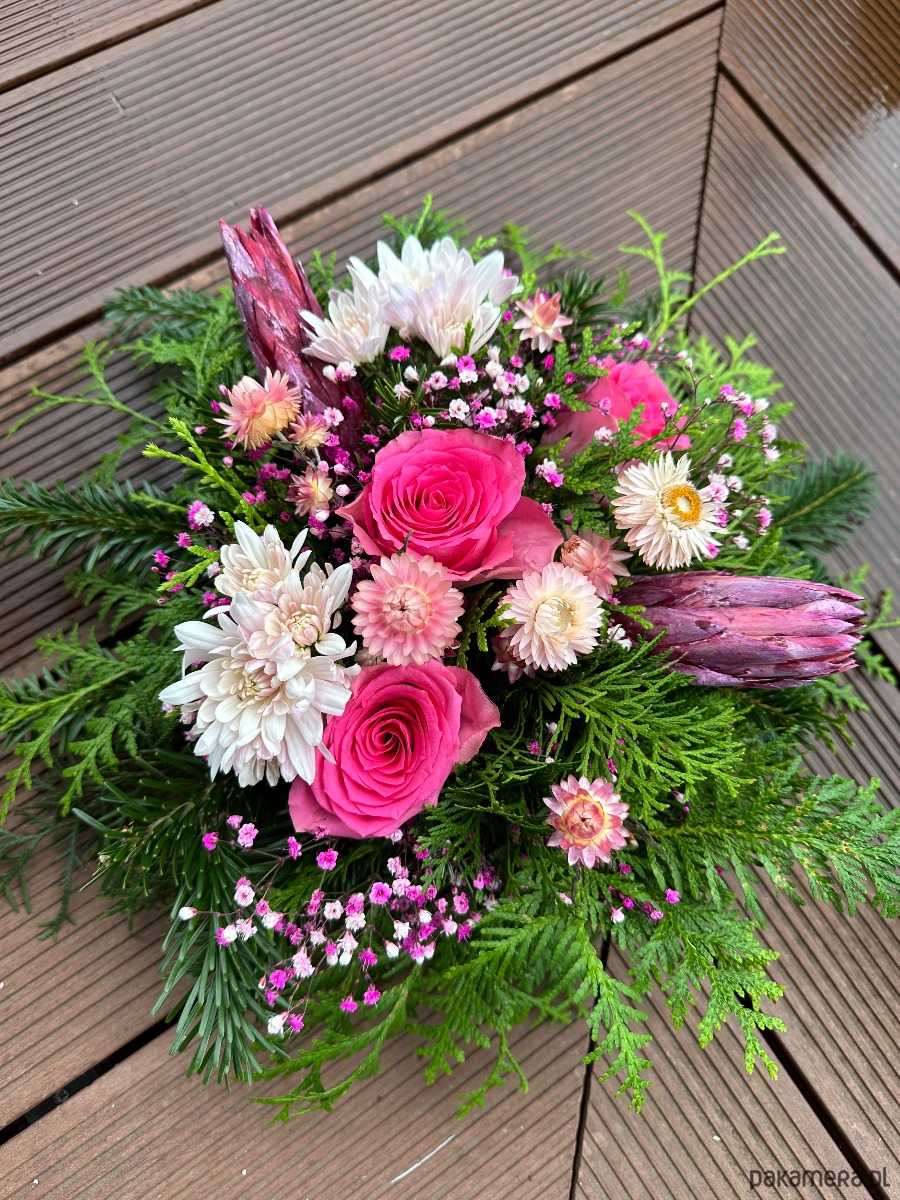 Wiązanka nagrobna wykonana z roślinności żywej oraz dodatków suszonych.